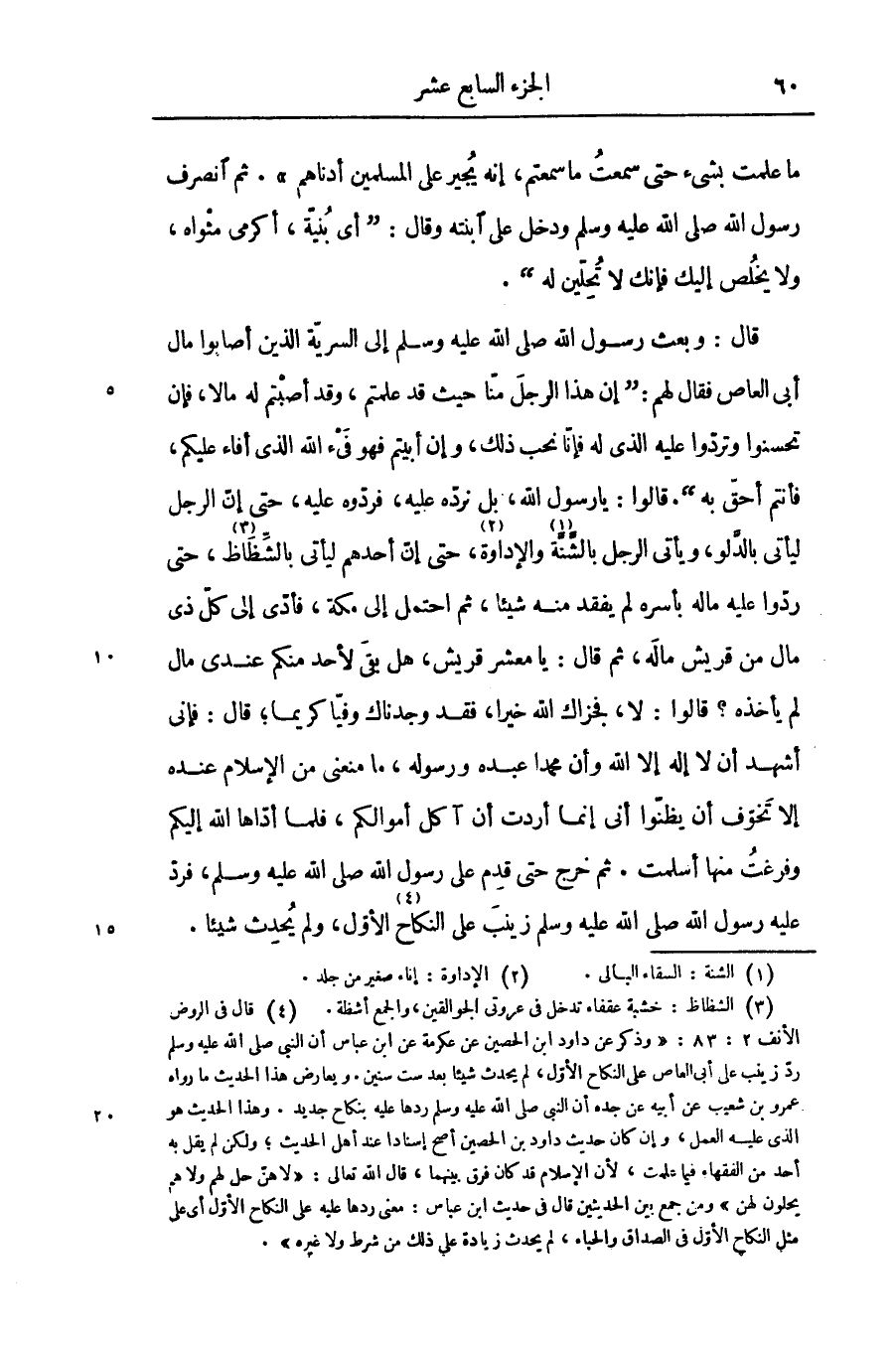 قال: وبعث رسول الله صلّى الله عليه وسلّم إلى السريّة الذين أصابوا مال أبى العاص فقال لهم: «إن هذا الرجل منّا حيث قد علمتم، وقد أصبتم له مالا، فإن تحسنوا وتردّوا عليه الذى له فإنّا نحب ذلك، وإن أبيتم فهو فىء الله الذى أفاء عليكم، فأنتم أحقّ به» . قالوا: يا رسول الله، بل نردّه عليه، فردّوه عليه، حتى إنّ الرجل ليأتى بالدّلو، ويأتى الرجل بالشّتّة «1» والإداوة «2» ، حتى إنّ أحدهم ليأتى بالشّظاظ «3» ، حتى ردّوا عليه ماله بأسره لم يفقد منه شيئا، ثم احتمل إلى مكة، فأدّى إلى كلّ ذى مال من قريش ماله، ثم قال: يا معشر قريش، هل بقى لأحد منكم عندى مال لم يأخذه؟ قالوا: لا، فجزاك الله خيرا، فقد وجدناك وفيّا كريما؛ قال: فإنى أشهد أن لا إله إلا الله وأن محمدا عبده ورسوله، ما منعنى من الإسلام عنده إلا تخوّف أن يظنّوا أنى إنما أردت أن آكل أموالكم، فلما أدّاها الله إليكم وفرغت منها أسلمت. ثم خرج حتى قدم على رسول الله صلّى الله عليه وسلّم، فردّ عليه رسول الله صلّى الله عليه وسلّم زينب على النكاح «4» الأوّل، ولم يحدث شيئا.