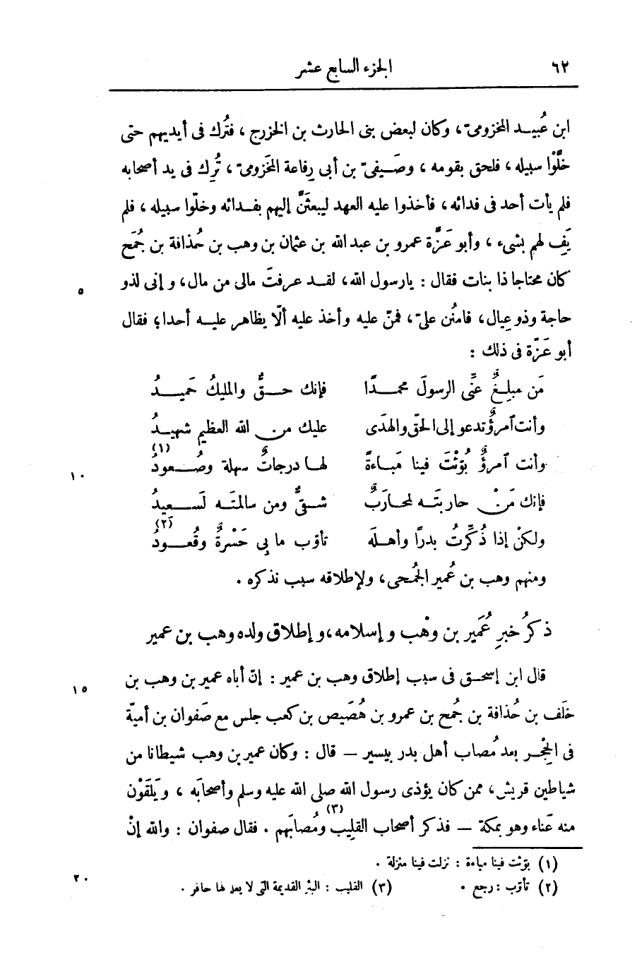 ابن عبيد المخزومىّ، وكان لبعض بنى الحارث بن الخزرج، فترك فى أيديهم حتى خلّوا سبيله، فلحق بقومه، وصيفىّ بن أبى رفاعة المخزومىّ، ترك فى يد أصحابه فلم يأت أحد فى فدائه، فأخذوا عليه العهد ليبعثنّ إليهم بفدائه وخلّوا سبيله، فلم يف لهم بشىء، وأبو عزّة عمرو بن عبد الله بن عثمان بن وهب بن حذافة بن جمح كان محتاجا ذا بنات فقال: يا رسول الله، لقد عرفت مالى من مال، وإنى لذو حاجة وذو عيال، فامنن علىّ، فمنّ عليه وأخذ عليه ألّا يظاهر عليه أحدا؛ فقال أبو عزّة فى ذلك: