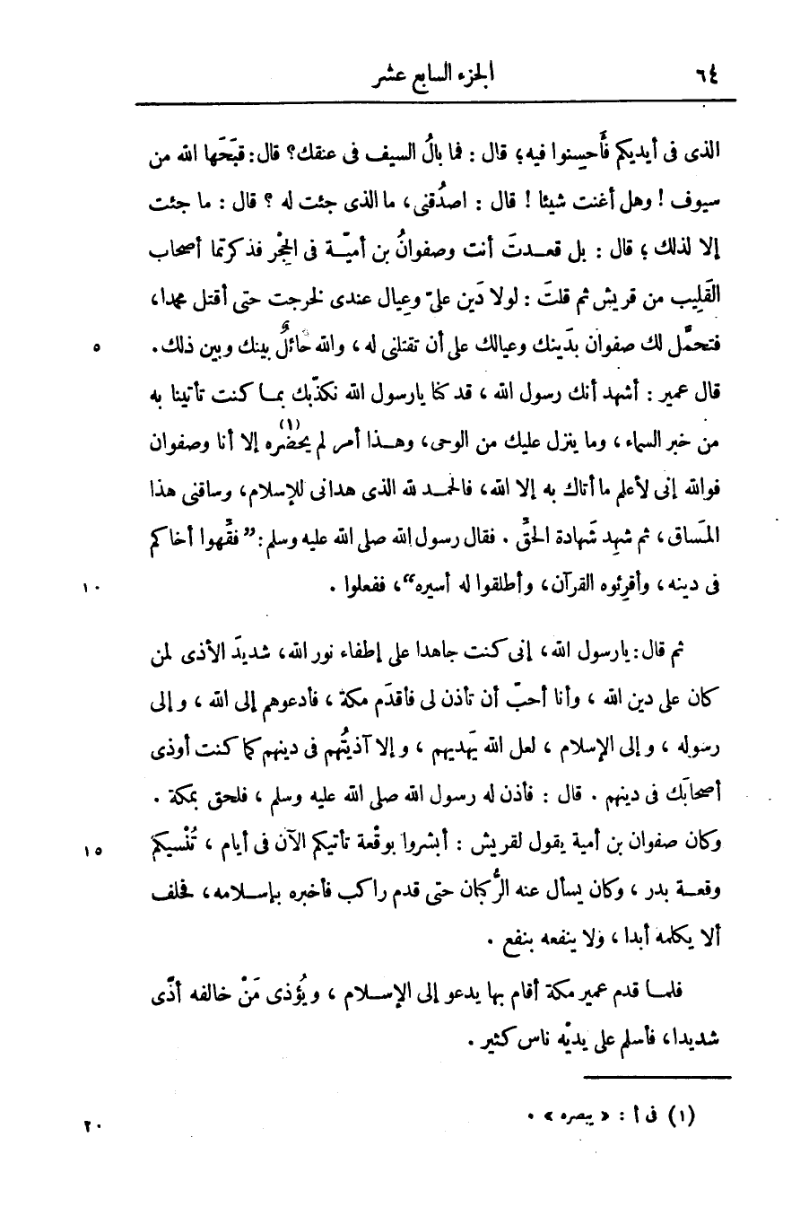قال عمير: أشهد أنك رسول الله، قد كنا يا رسول الله نكذّبك بما كنت تأتينا به من خبر السماء، وما ينزل عليك من الوحى، وهذا أمر لم يحضره «1» إلا أنا وصفوان فو الله إنى لأعلم ما أتاك به إلا الله، فالحمد لله الذى هدانى للإسلام، وساقنى هذا المساق، ثم شهد شهادة الحقّ. فقال رسول الله صلّى الله عليه وسلّم: «فقّهوا أخاكم فى دينه، وأقرئوه القرآن، وأطلقوا له أسيره» ، ففعلوا.