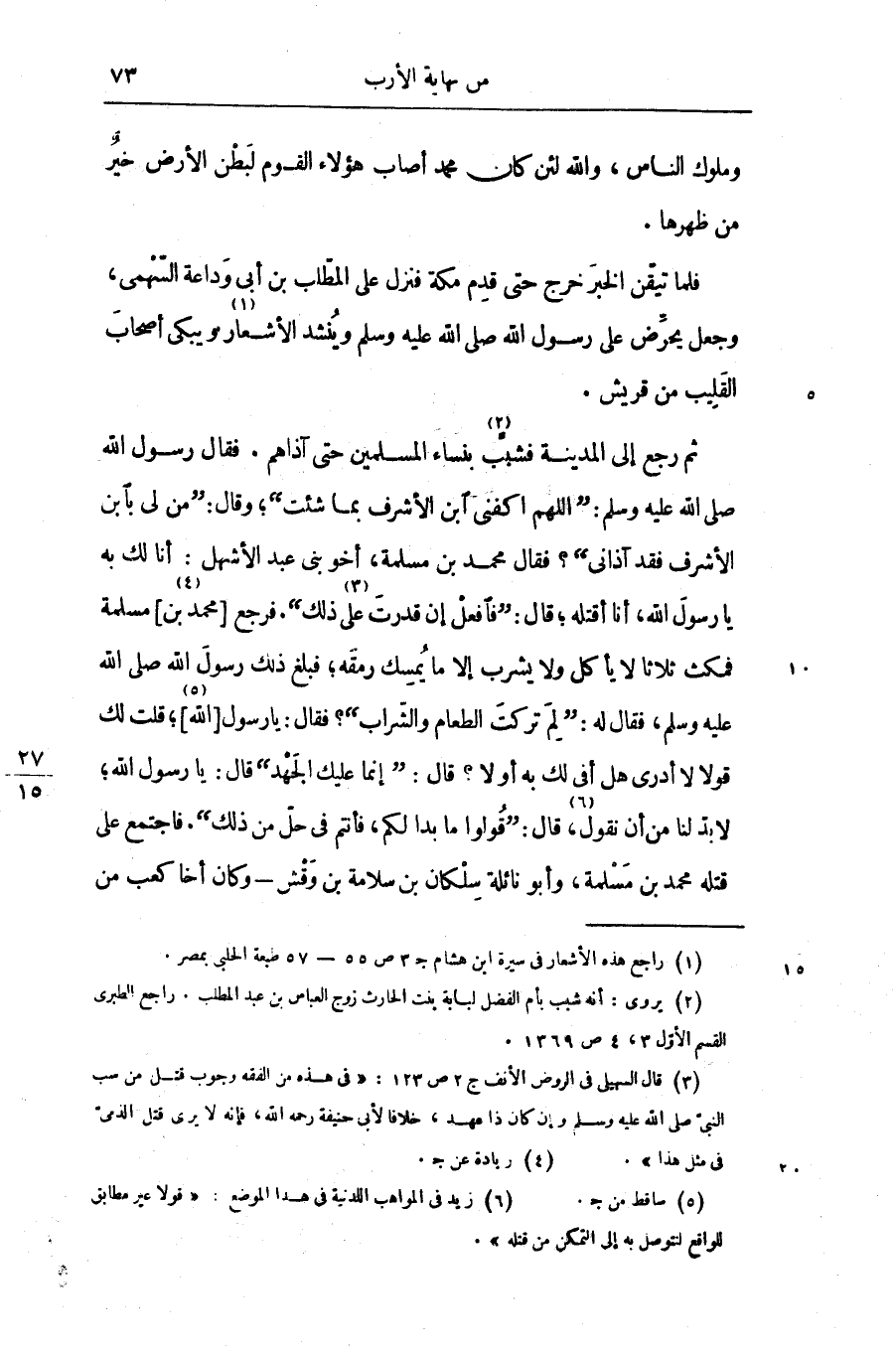 ثم رجع إلى المدينة فشبّب «2» بنساء المسلمين حتى آذاهم. فقال رسول الله صلّى الله عليه وسلّم: «اللهم اكفنى ابن الأشرف بما شئت» ؛ وقال: «من لى بابن الأشرف فقد آذانى» ؟ فقال محمد بن مسلمة، أخو بنى عبد الأشهل: أنا لك به يا رسول الله، أنا أقتله؛ قال: «فافعل إن قدرت «3» على ذلك» . فرجع [محمد بن «4» ] مسلمة فمكث ثلاثا لا يأكل ولا يشرب إلا ما يمسك رمقه؛ فبلغ ذلك رسول الله صلّى الله عليه وسلّم، فقال له: «لم تركت الطعام والشّراب» ؟ فقال: يا رسول [الله «5» ] ؛ قلت لك قولا لا أدرى هل أفى لك به أولا؟ قال: «إنما عليك الجهد» قال: يا رسول الله؛ لا بدّ لنا من أن نقول «6» ، قال: «قولوا ما بدا لكم، فأنتم فى حلّ من ذلك» . فاجتمع على قتله محمد بن مسلمة، وأبو نائلة سلكان بن سلامة بن وقش- وكان أخا كعب من