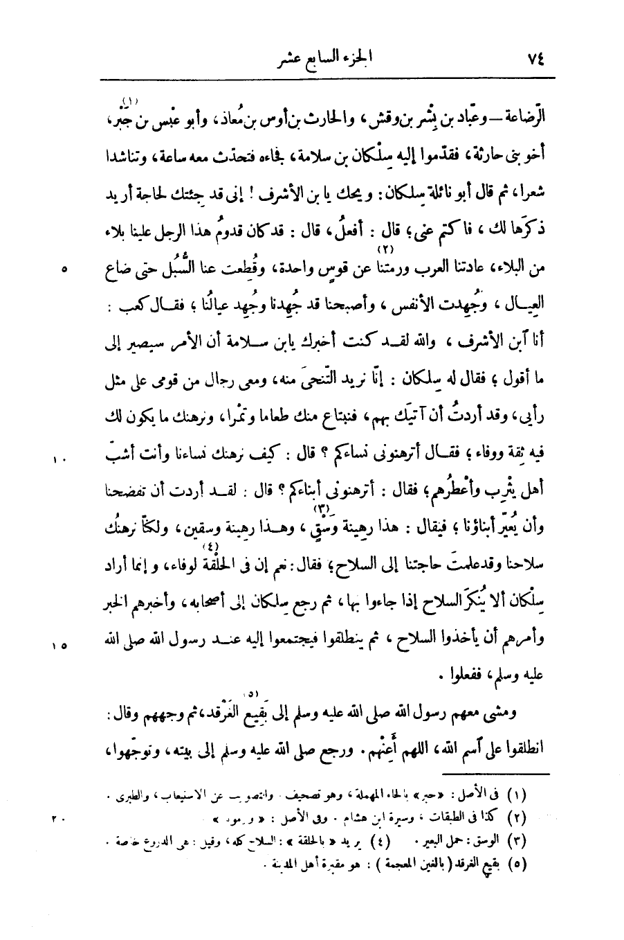 أنا ابن الأشرف، والله لقد كنت أخبرك يابن سلامة أن الأمر سيصير إلى ما أقول؛ فقال له سلكان: إنّا نريد التّنحى منه، ومعى رجال من قومى على مثل رأيى، وقد أردت أن آتيك بهم، فنبتاع منك طعاما وتمرا، ونرهنك مايكون لك فيه ثقة ووفاء؛ فقال أترهنونى نساءكم؟ قال: كيف نرهنك نساءنا وأنت أشبّ أهل يثرب وأعطرهم؛ فقال: هذا رهينة وسق «3» ، وهذا رهينة وسقين، ولكنّا نرهنك سلاحنا وقد علمت حاجتنا إلى السلاح؛ فقال: نعم إن فى الحلقة «4» لوفاء، وإنما أراد سلكان ألا ينكر السلاح إذا جاءوا بها، ثم رجع سلكان إلى أصحابه، وأخبرهم الخبر وأمرهم أن يأخذوا السلاح، ثم ينطلقوا فيجتمعوا إليه عند رسول الله صلّى الله عليه وسلّم، ففعلوا.