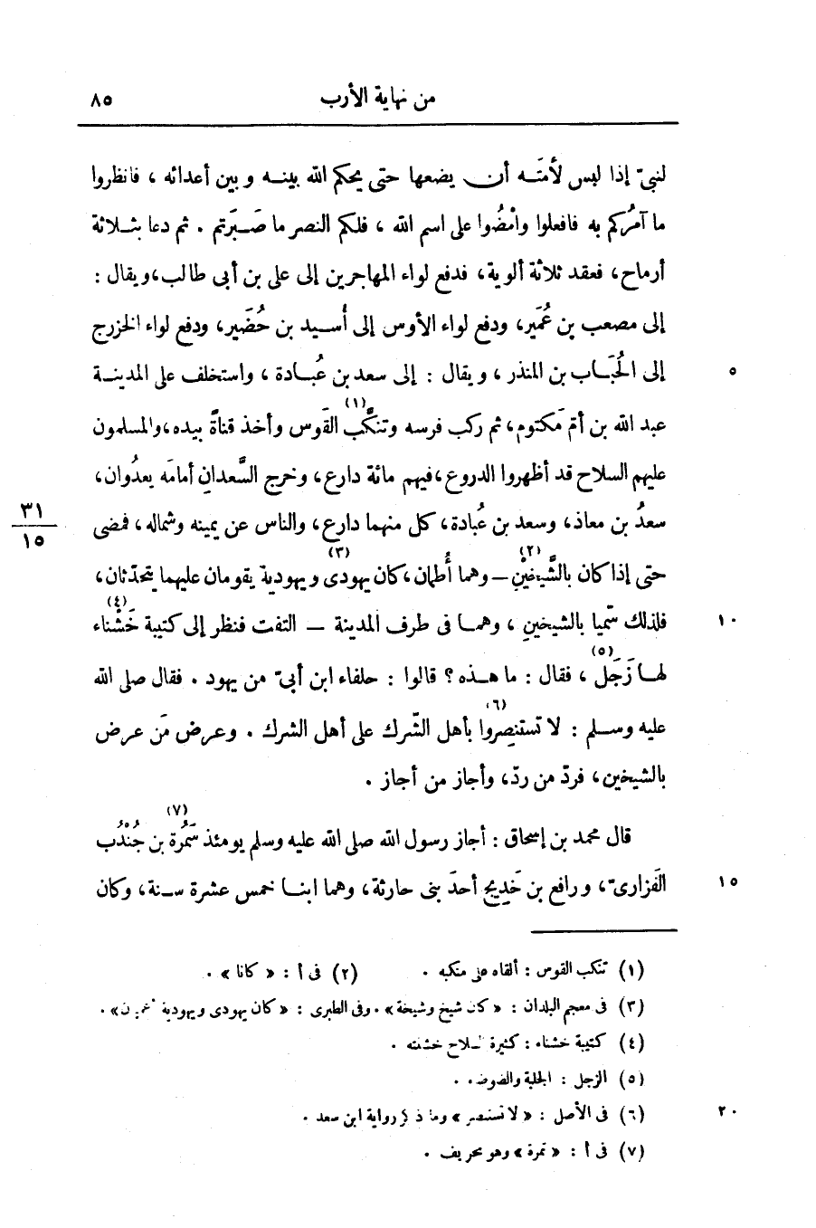 إلى مصعب بن عمير، ودفع لواء الأوس إلى أسيد بن حضير، ودفع لواء الخزرج إلى الحباب بن المنذر، ويقال: إلى سعد بن عبادة، واستخلف على المدينة عبد الله بن أمّ مكتوم، ثم ركب فرسه وتنكّب «1» القوس وأخذ قناة بيده، والمسلمون عليهم السلاح قد أظهروا الدروع، فيهم مائة دارع، وخرج السّعدان أمامه يعدوان، سعد بن معاذ، وسعد بن عبادة، كل منهما دارع، والناس عن يمينه وشماله، فمضى حتى إذا كان بالشّيخين «2» - وهما أطمان، كان يهودى «3» ويهودية يقومان عليهما يتحدّثان، فلذلك سميّا بالشيخين، وهما فى طرف المدينة- التفت فنظر إلى كتيبة خشناء «4» لها زجل «5» ، فقال: ما هذه؟ قالوا: حلفاء ابن أبىّ من يهود. فقال صلّى الله عليه وسلّم: لا تستنصروا «6» بأهل الشّرك على أهل الشرك. وعرض من عرض بالشيخين، فردّ من ردّ، وأجاز من أجاز.