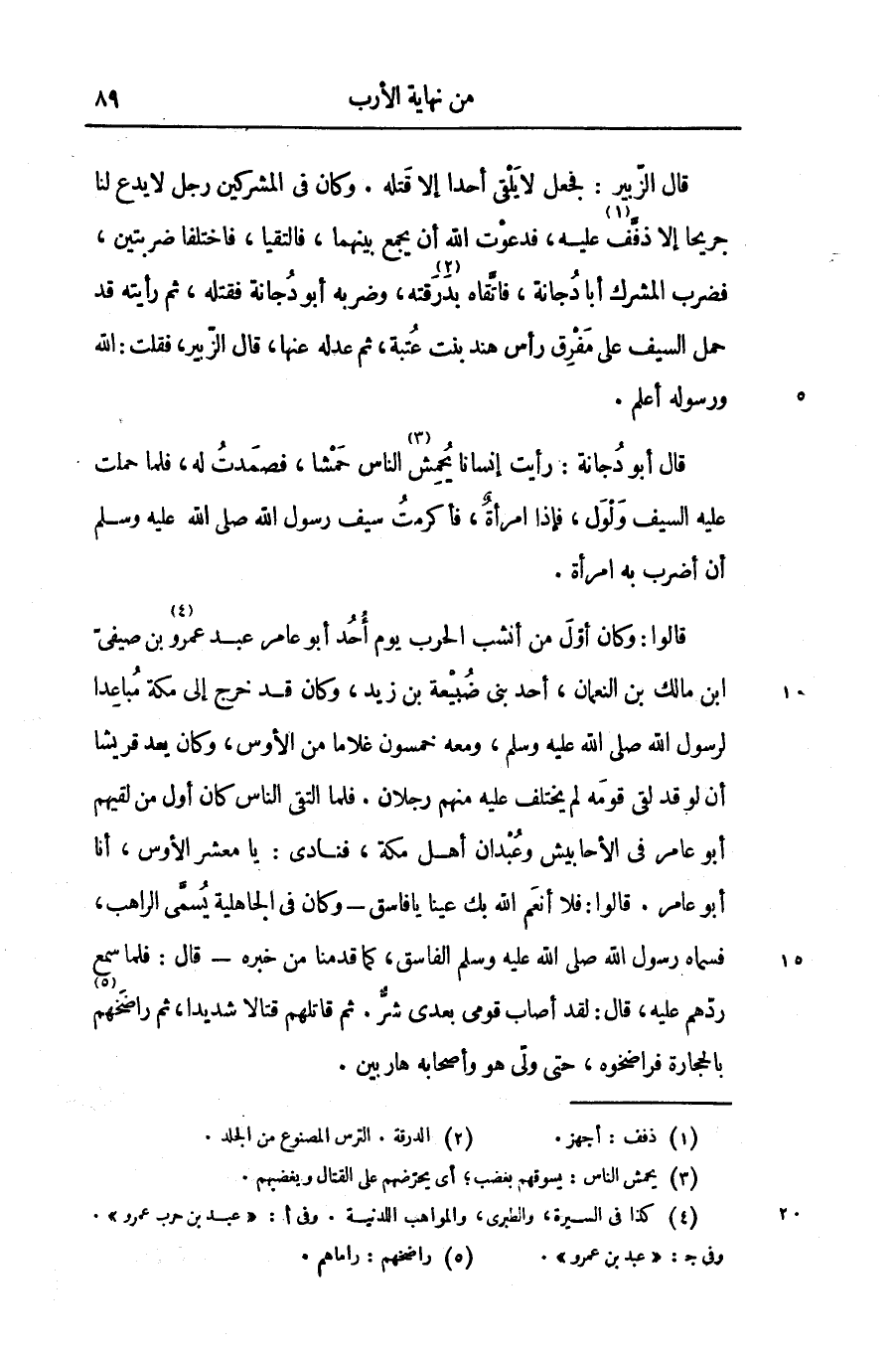 قال الزّبير: فجعل لا يلقى أحدا إلا قتله. وكان فى المشركين رجل لا يدع لنا جريحا إلا ذفّف «1» عليه، فدعوت الله أن يجمع بينهما، فالتقيا، فاختلفا ضربتين، فضرب المشرك أبا دجانة، فاتّقاه بدرقته «2» ، وضربه أبو دجانة فقتله، ثم رأيته قد حمل السيف على مفرق رأس هند بنت عتبة، ثم عدله عنها، قال الزّبير، فقلت: الله ورسوله أعلم.