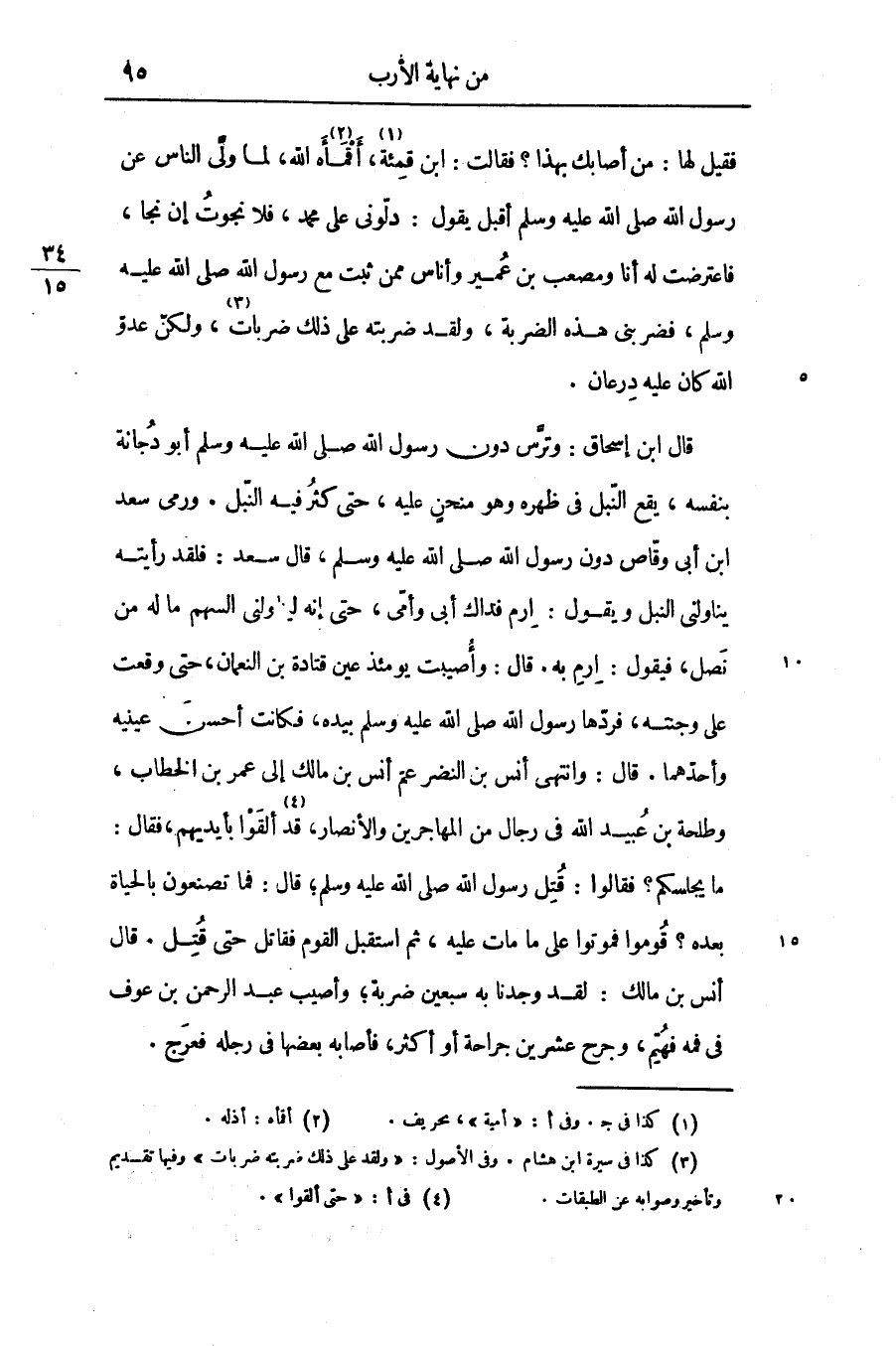 ما يجلسكم؟ فقالوا: قتل رسول الله صلّى الله عليه وسلّم؛ قال: فما تصنعون بالحياة بعده؟ قوموا فموتوا على ما مات عليه، ثم استقبل القوم فقاتل حتى قتل. قال أنس بن مالك: لقد وجدنا به سبعين ضربة؛ وأصيب عبد الرحمن بن عوف فى فمه فهتم، وجرح عشرين جراحة أو أكثر، فأصابه بعضها فى رجله فعرج.