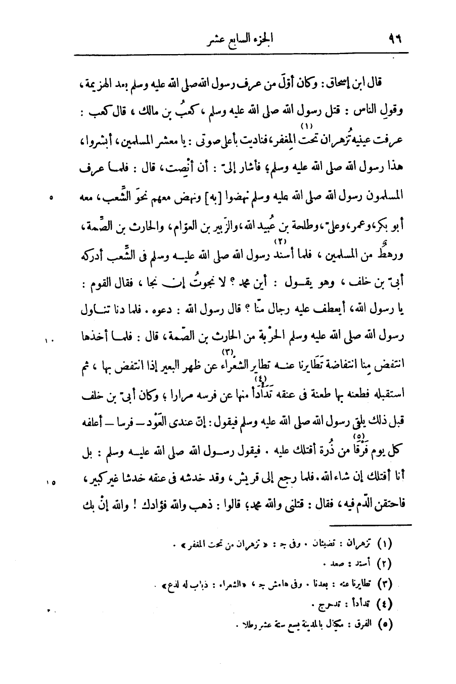 منها عن فرسه مرارا؛ وكان أبىّ بن خلف قبل ذلك يلقى رسول الله صلّى الله عليه وسلّم فيقول: إنّ عندى العود- فرسا- أعلفه كل يوم فرقا «5» من ذرة أقتلك عليه. فيقول رسول الله صلّى الله عليه وسلّم: بل أنا أقتلك إن شاء الله. فلما رجع إلى قريش، وقد خدشه فى عنقه خدشا غير كبير، فاحتقن الدّم فيه، فقال: قتلنى والله محمد؛ قالوا: ذهب والله فؤادك! والله إن بك