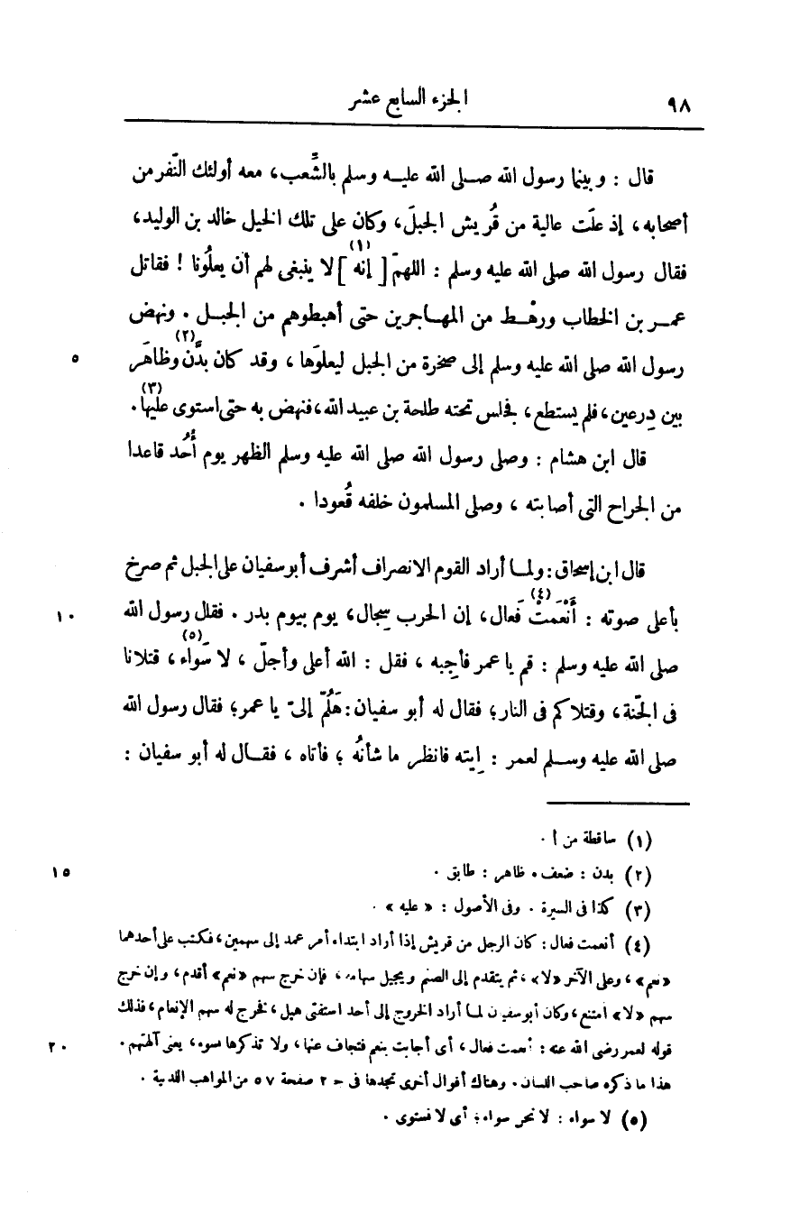 قال ابن إسحاق: ولما أراد القوم الانصراف أشرف أبو سفيان على الجبل ثم صرخ بأعلى صوته: أنعمت «4» فعال، إن الحرب سجال، يوم بيوم بدر. فقال رسول الله صلّى الله عليه وسلّم: قم يا عمر فأجبه، فقل: الله أعلى وأجلّ، لا سواء «5» ، قتلانا فى الجنّة، وقتلاكم فى النار؛ فقال له أبو سفيان: هلمّ إلىّ يا عمر؛ فقال رسول الله صلّى الله عليه وسلّم لعمر: ايته فانظر ما شأنه؛ فأتاه، فقال له أبو سفيان: