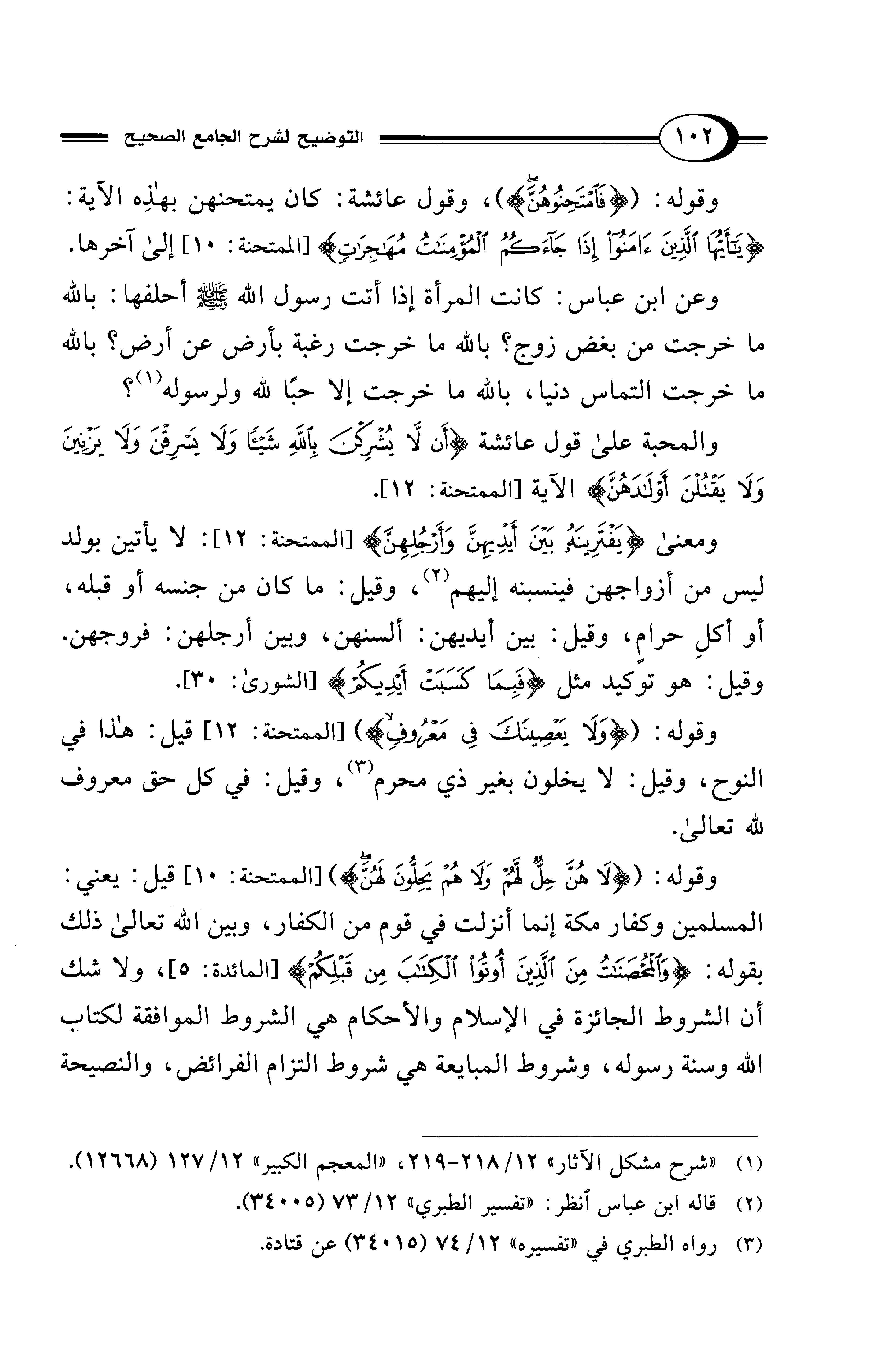 وقوله: ({لَا هُنَّ حِلٌّ لَهُمْ وَلَا هُمْ يَحِلُّونَ لَهُنَّ} [الممتحنة: 10] قيل: يعني: المسلمين وكفار مكة إنما أنزلت في قوم من الكفار، وبين الله تعالى ذلك بقوله: {وَالمُحْصَنَاتُ مِنَ الَّذِينَ أُوتُوا الكِتَابَ مِنْ قَبْلِكُمْ} [المائدة: 5]، ولا شك أن الشروط الجائزة في الإسلام والأحكام هي الشروط الموافقة لكتاب الله وسنة رسوله، وشروط المبايعة هي شروط التزام الفرائض، والنصيحة