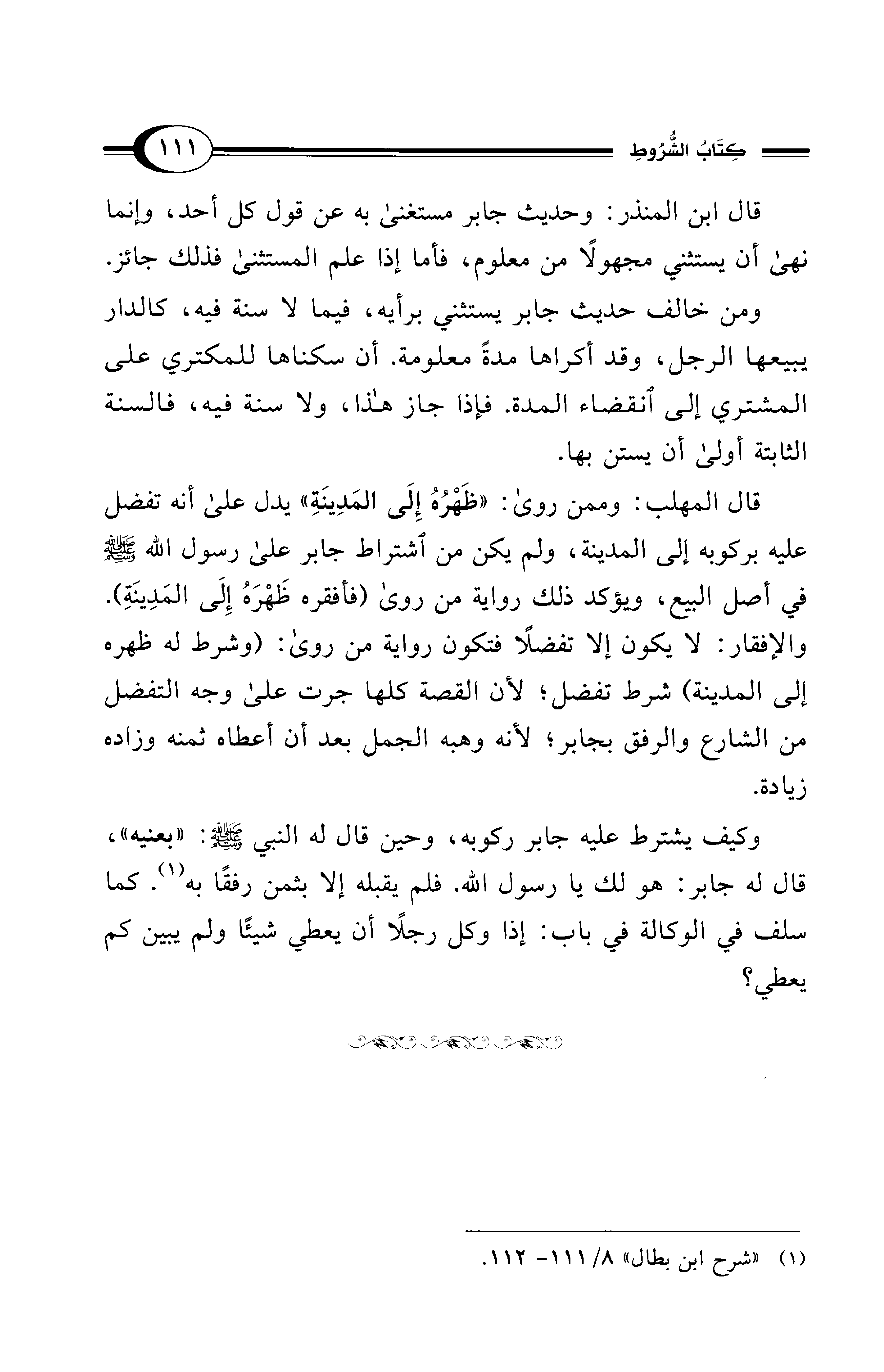 قال المهلب: وممن روى: "ظَهْرُهُ إِلَى المَدِينَةِ" يدل على أنه تفضل عليه بركوبه إلى المدينة، ولم يكن من اشتراط جابر على رسول الله - صلى الله عليه وسلم - في أصل البيع، ويؤكد ذلك رواية من روى (فأفقره ظَهْرَهُ إِلَى المَدِينَةِ). والإفقار: لا يكون إلا تفضلًا فتكون رواية من روى: (وشرط له ظهره إلى المدينة) شرط تفضل؛ لأن القصة كلها جرت على وجه التفضل من الشارع والرفق بجابر؛ لأنه وهبه الجمل بعد أن أعطاه ثمنه وزاده زيادة.