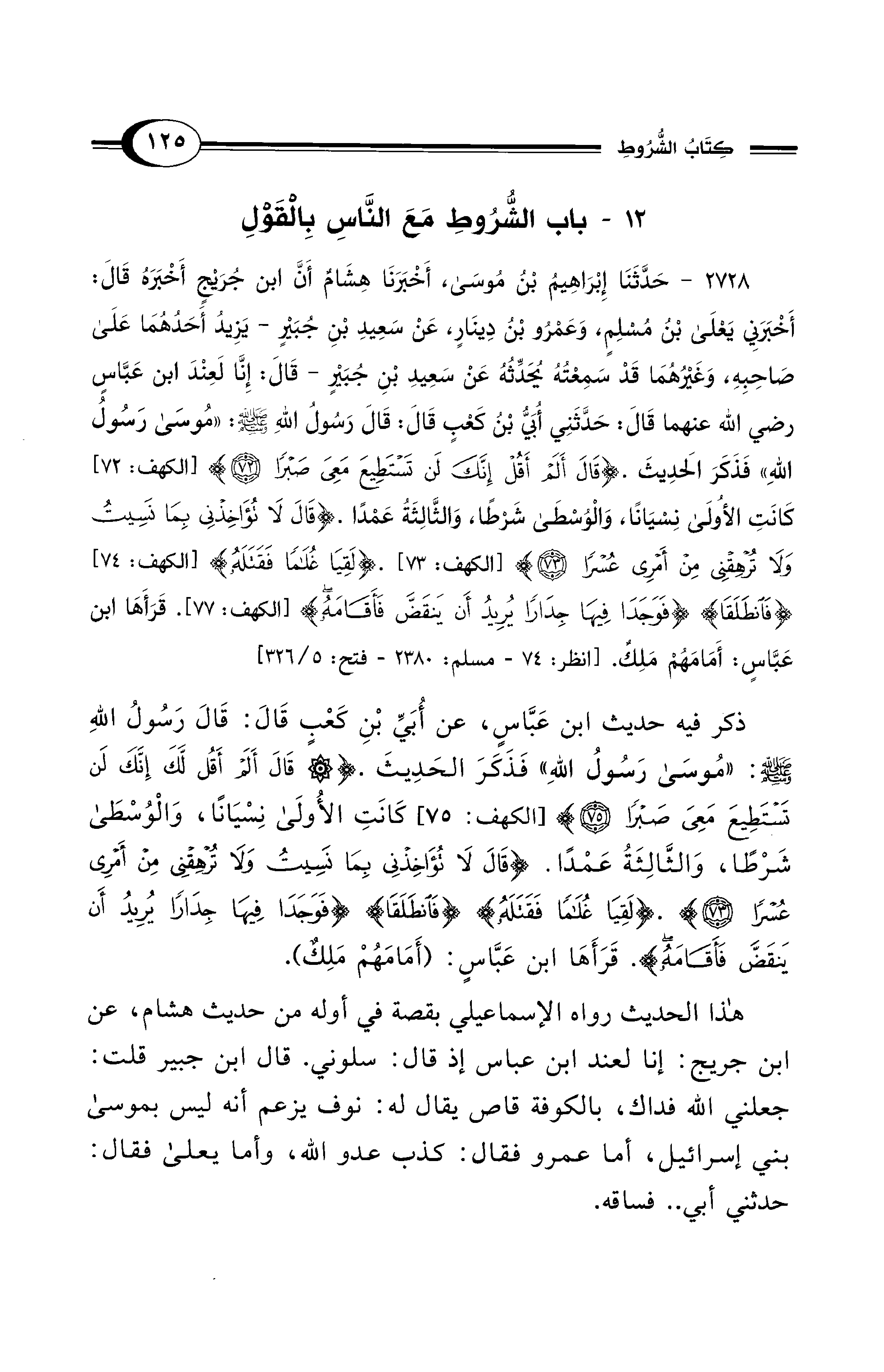 2728 - حَدَّثَنَا إِبْرَاهِيمُ بْنُ مُوسَى، أَخْبَرَنَا هِشَامٌ أَنَّ ابْنَ جُرَيْجٍ أَخْبَرَهُ قَالَ: أَخْبَرَنِي يَعْلَى بْنُ مُسْلِمٍ، وَعَمْرُو بْنُ دِينَارٍ، عَنْ سَعِيدِ بْنِ جُبَيْرٍ -يَزِيدُ أَحَدُهُمَا عَلَى صَاحِبِهِ، وَغَيْرُهُمَا قَدْ سَمِعْتُهُ يُحَدِّثُهُ عَنْ سَعِيدِ بْنِ جُبَيْرٍ- قَالَ: إِنَّا لَعِنْدَ ابْنِ عَبَّاسٍ رضي الله عنهما قَالَ: حَدَّثَنِي أُبَيُّ بْنُ كَعْبٍ قَالَ: قَالَ رَسُولُ اللهِ - صلى الله عليه وسلم -: "مُوسَى رَسُولُ اللهِ" فَذَكَرَ الحَدِيثَ. {قَالَ أَلَمْ أَقُلْ إِنَّكَ لَنْ تَسْتَطِيعَ مَعِىَ صَبْرًا (72)} [الكهف: 72] كَانَتِ الأُولَى نِسْيَانًا، وَالوُسْطَى شَرْطًا، وَالثَّالِثَةُ عَمْدًا {قَالَ لَا تُؤَاخِذْنِى بِمَا نَسِيتُ وَلَا تُرْهِقْنِى مِنْ أَمْرِى عُسْرًا (73)} [الكهف: 73]. {لَقِيَا غُلاَمًا فَقَتَلَهُ} [الكهف: 74] {فَانْطَلَقَا} {فَوَجَدَا جِدَارًا يُرِيدُ أَنْ يَنْقَضَّ فَأَقَامَهُ} [الكهف: 74]. قَرَأَهَا ابْنُ عَبَّاسٍ: أَمَامَهُمْ مَلِكٌ. [انظر: 74 - مسلم: 2380 - فتح: 5/ 326]
