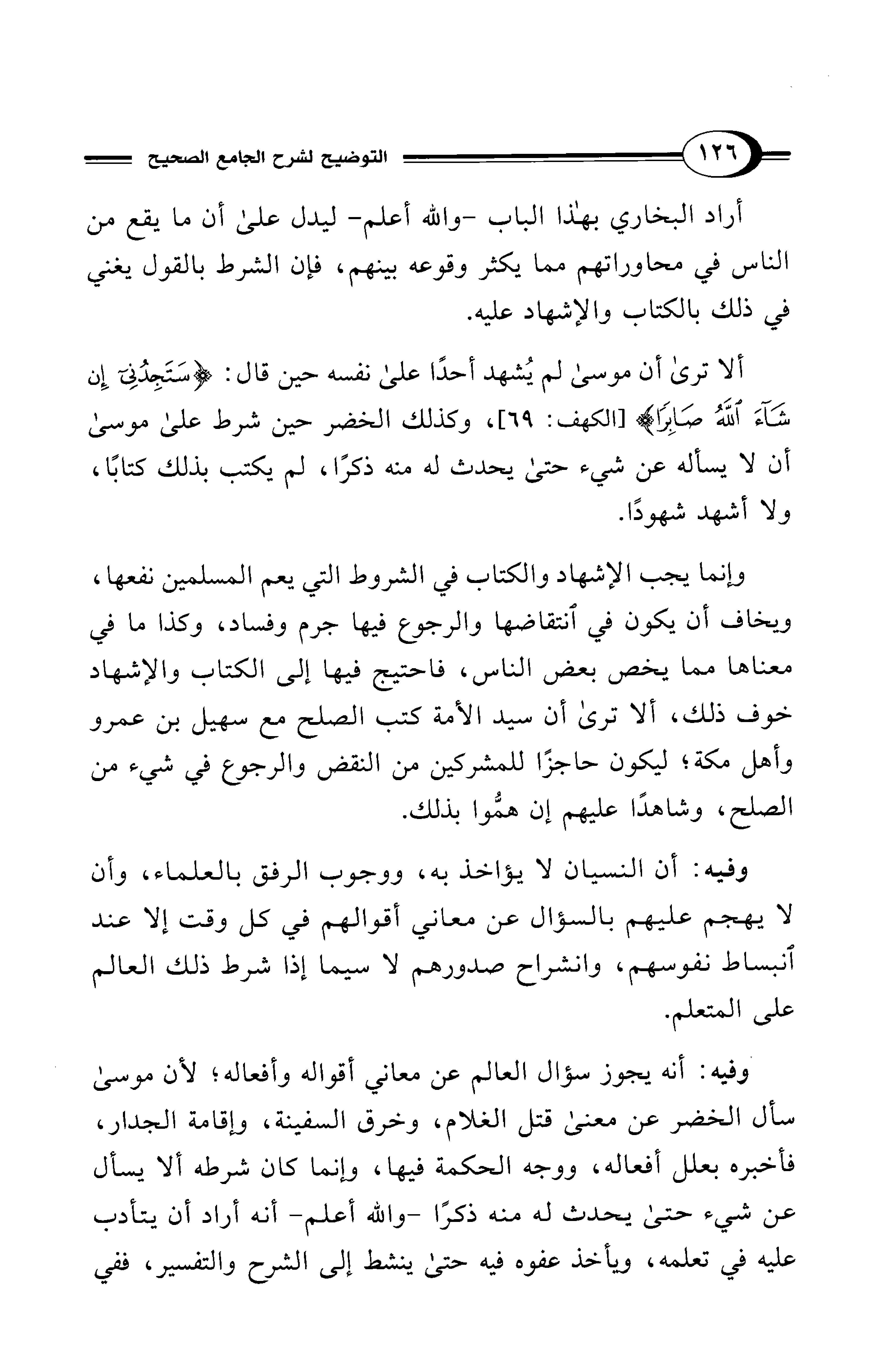 ألا ترى أن موسى لم يُشهد أحدًا على نفسه حين قال: {سَتَجِدُنِي إِنْ شَاءَ اللهُ صَابِرًا} [الكهف: 69]، وكذلك الخضر حين شرط على موسى أن لا يسأله عن شيء حتى يحدث له منه ذكرًا، لم يكتب بذلك كتابًا، ولا أشهد شهودًا.