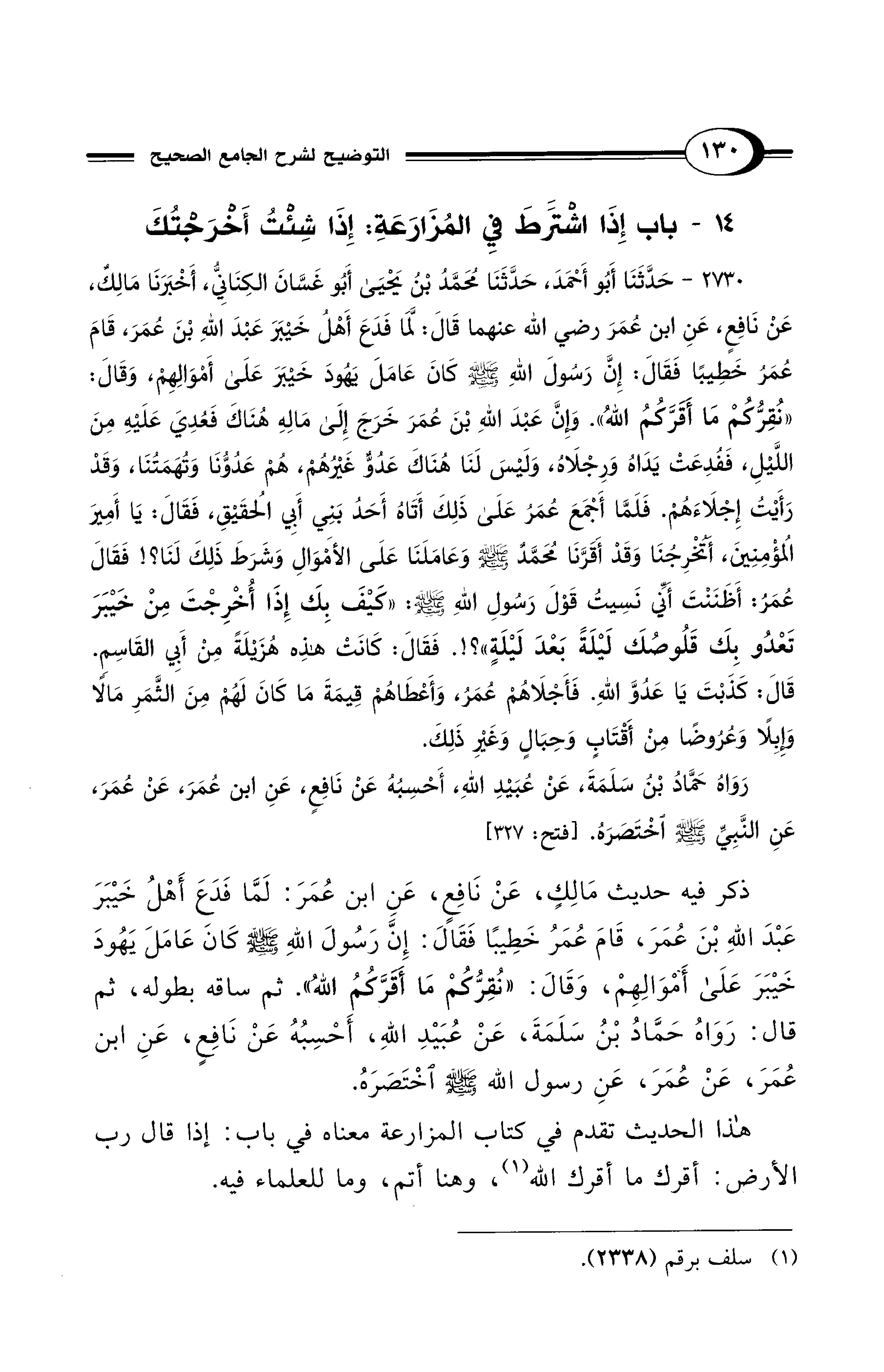 ذكر فيه حديث مَالِكٍ، عَنْ نَافِعٍ، عَنِ ابن عُمَرَ: لَمَّا فَدَعَ أَهْلُ خَيْبَرَ عَبْدَ اللهِ بْنَ عُمَرَ، قَامَ عُمَرُ خَطِيبًا فَقَالَ: إِنَّ رَسُولَ اللهِ - صلى الله عليه وسلم - كان عَامَلَ يَهُودَ خَيْبَرَ عَلَى أَمْوَالِهِمْ، وَقَالَ: "نُقِرُّكمْ مَا أَقرَّكَمُ اللهُ". ثم ساقه بطوله، ثم قال: رَوَاهُ حَمَّادُ بْنُ سَلَمَةَ، عَنْ عُبَيْدِ اللهِ، أَحْسِبُهُ عَنْ نَافِعٍ، عَنِ ابن عُمَرَ، عَنْ عُمَرَ، عَنِ رسول الله - صلى الله عليه وسلم - اخْتَصرَهُ.