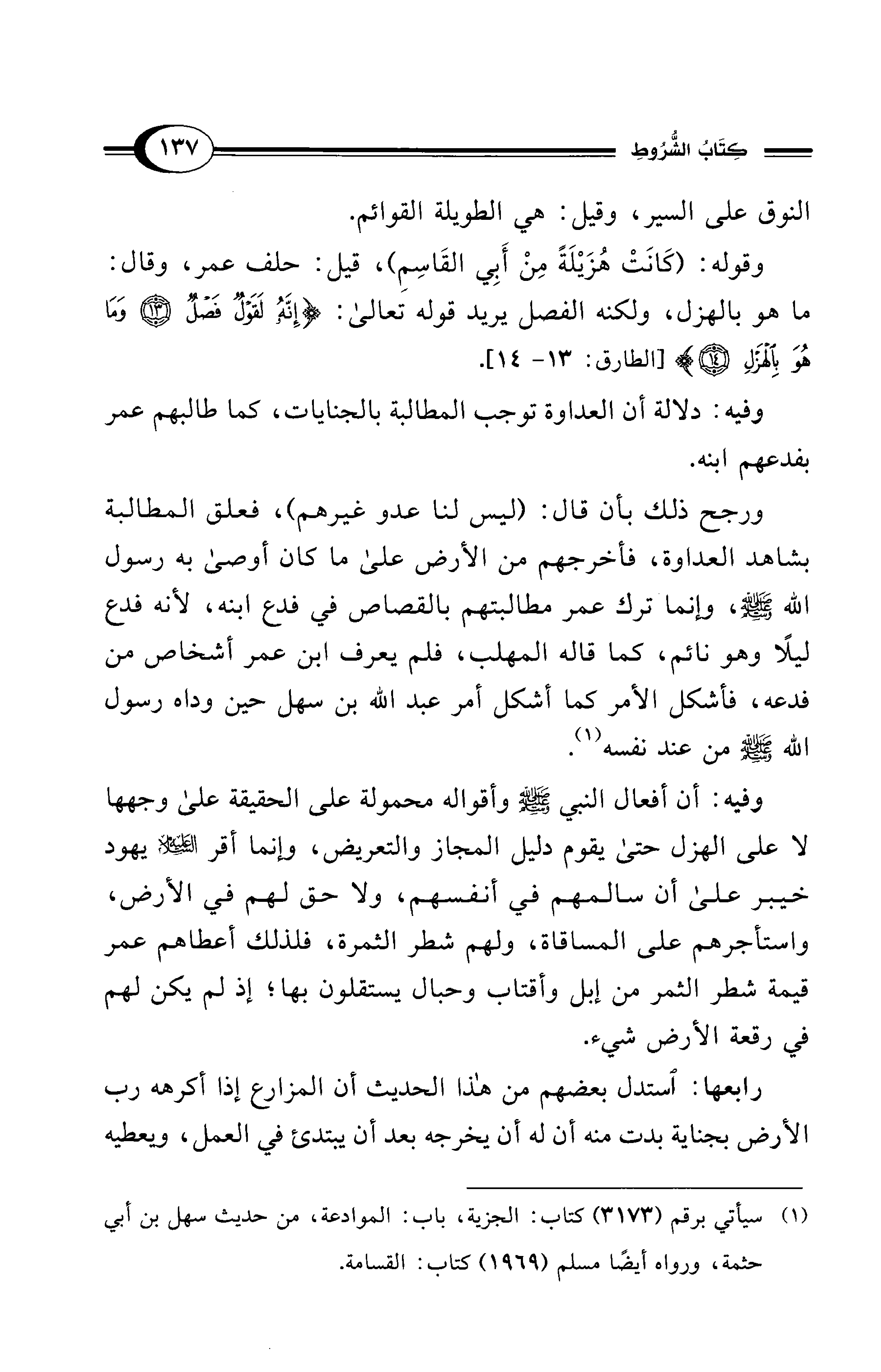وفيه: أن أفعال النبي - صلى الله عليه وسلم - وأقواله محمولة على الحقيقة على وجهها لا على الهزل حتى يقوم دليل المجاز والتعريض، وإنما أقر - عليه السلام - يهود خيبر على أن سالمهم في أنفسهم، ولا حق لهم في الأرض، واستأجرهم على المساقاة، ولهم شطر الثمرة، فلذلك أعطاهم عمر قيمة شطر الثمر من إبل وأقتاب وحبال يستقلون بها؛ إذ لم يكن لهم في رقعة الأرض شيء.