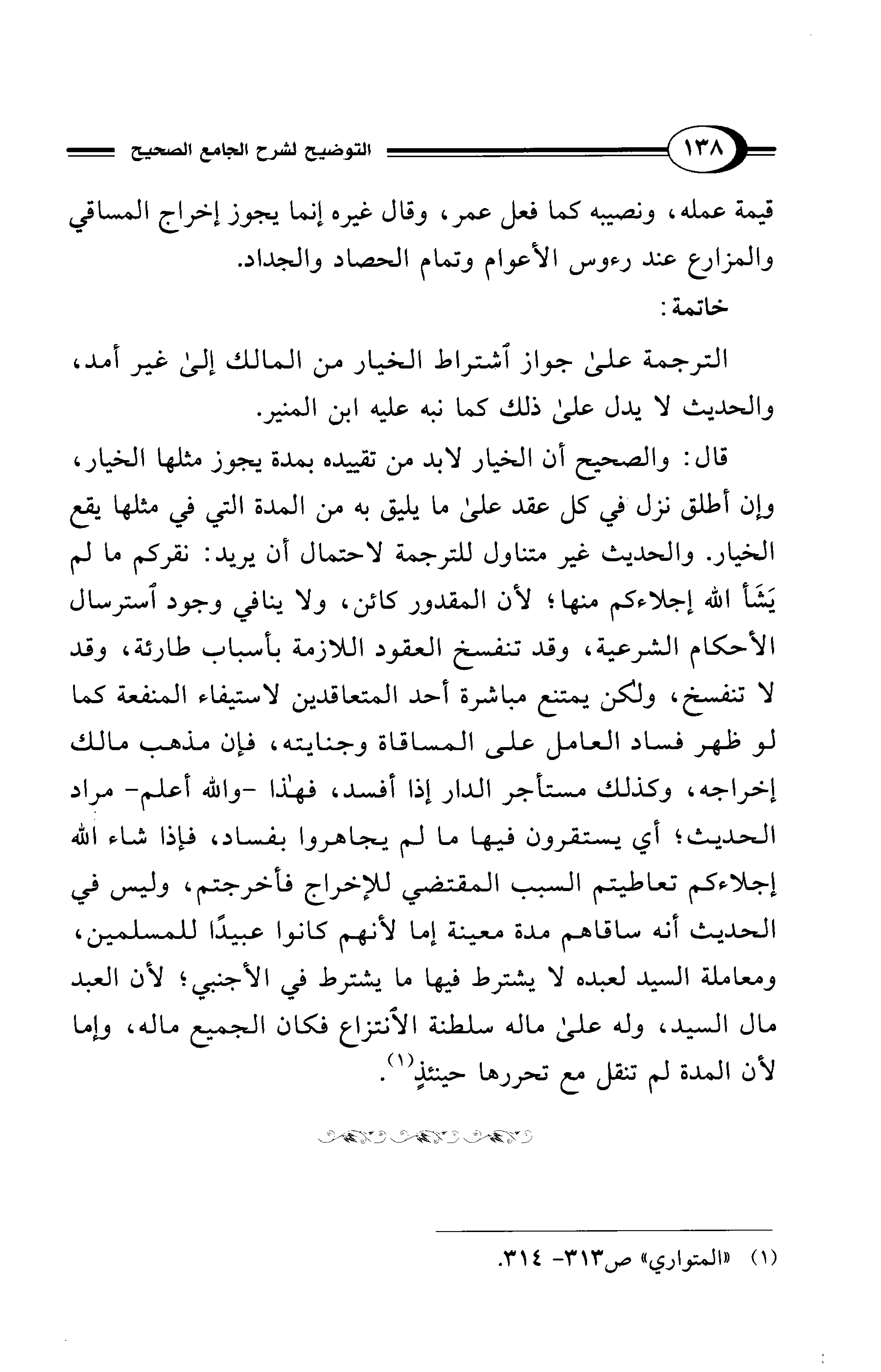 قال: والصحيح أن الخيار لا بد من تقييده بمدة يجوز مثلها الخيار، وإن أطلق نزل في كل عقد على ما يليق به من المدة التي في مثلها يقع الخيار. والحديث غير متناول للترجمة لاحتمال أن يريد: نقركم ما لم يَشَأ الله إجلاءكم منها؛ لأن المقدور كائن، ولا ينافي وجود استرسال الأحكام الشرعية، وقد تنفسخ العقود اللازمة بأسباب طارئة، وقد لا تنفسخ، ولكن يمتنع مباشرة أحد المتعاقدين لاستيفاء المنفعة كما لو ظهر فساد العامل على المساقاة وجنايته، فإن مذهب مالك إخراجه، وكذلك مستأجر الدار إذا أفسد، فهذا -والله أعلم- مراد الحديث؛ أي يستقرون فيها ما لم يجاهروا بفساد، فإذا شاء الله إجلاءكم تعاطيتم السبب المقتضي للإخراج فأخرجتم، وليس في الحديث أنه ساقاهم مدة معينة إما لأنهم كانوا عبيدًا للمسلمين، ومعاملة السيد لعبده لا يشترط فيها ما يشترط في الأجنبي؛ لأن العبد