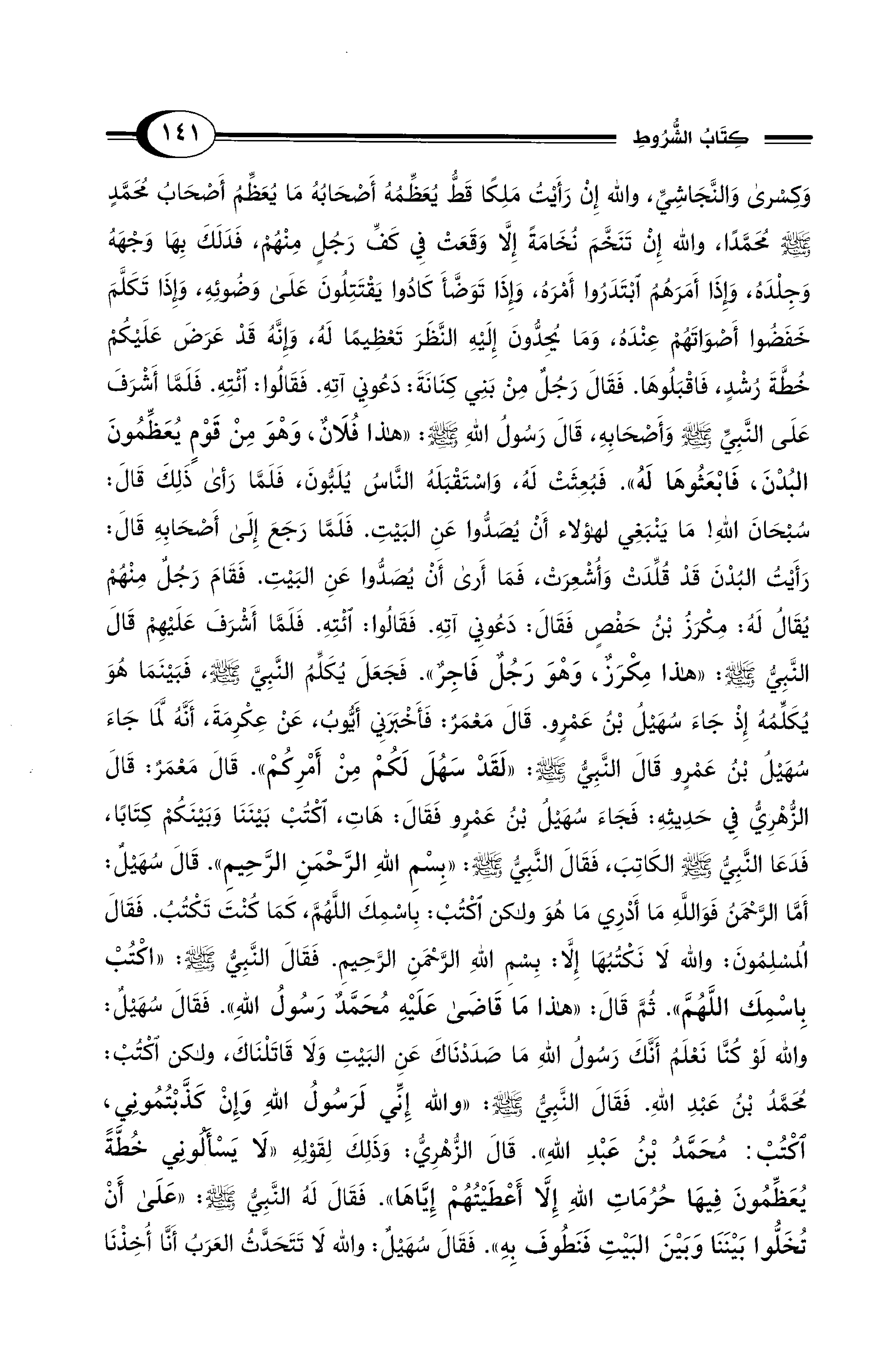 وَكِسْرَى وَالنَّجَاشِيِّ، وَاللهِ إِنْ رَأَيْتُ مَلِكًا قَطُّ يُعَظِّمُهُ أَصْحَابُهُ مَا يُعَظِّمُ أَصْحَابُ مُحَمَّدٍ - صلى الله عليه وسلم - مُحَمَّدًا، وَاللهِ إِنْ تَنَخَّمَ نُخَامَةً إِلَّا وَقَعَتْ فِي كَفِّ رَجُلٍ مِنْهُمْ، فَدَلَكَ بِهَا وَجْهَهُ وَجِلْدَهُ، وَإِذَا أَمَرَهُمُ ابْتَدَرُوا أَمْرَهُ، وَإِذَا تَوَضَّأَ كَادُوا يَقْتَتِلُونَ عَلَى وَضُوئِهِ، وَإِذَا تَكَلَّمَ خَفَضُوا أَصْوَاتَهُمْ عِنْدَهُ، وَمَا يُحِدُّونَ إِلَيْهِ النَّظَرَ تَعْظِيمًا لَهُ، وَإِنَّهُ قَدْ عَرَضَ عَلَيْكُمْ خُطَّةَ رُشْدٍ، فَاقْبَلُوهَا. فَقَالَ رَجُلٌ مِنْ بَنِي كِنَانَةَ: دَعُونِي آتِهِ. فَقَالُوا: ائْتِهِ. فَلَمَّا أَشْرَفَ عَلَى النَّبِيِّ - صلى الله عليه وسلم - وَأَصْحَابِهِ، قَالَ رَسُولُ اللهِ - صلى الله عليه وسلم -: "هَذَا فُلاَنٌ، وَهْوَ مِنْ قَوْمٍ يُعَظِّمُونَ البُدْنَ فَابْعَثُوهَا لَهُ". فَبُعِثَتْ لَهُ وَاسْتَقْبَلَهُ النَّاسُ يُلَبُّونَ، فَلَمَّا رَأَى ذَلِكَ قَالَ: سُبْحَانَ اللهِ! مَا يَنْبَغِي لِهَؤُلاَءِ أَنْ يُصَدُّوا عَنِ البَيْتِ، فَلَمَّا رَجَعَ إِلَى أَصْحَابِهِ قَالَ: رَأَيْتُ البُدْنَ قَدْ قُلِّدَتْ وَأُشْعِرَتْ، فَمَا أَرَى أَنْ يُصَدُّوا عَنِ البَيْتِ. فَقَامَ رَجُلٌ مِنْهُمْ يُقَالُ لَهُ: مِكْرَزُ بْنُ حَفْصٍ. فَقَالَ: دَعُونِي آتِهِ. فَقَالُوا: ائْتِهِ. فَلَمَّا أَشْرَفَ عَلَيْهِمْ قَالَ النَّبِيُّ - صلى الله عليه وسلم -: "هَذَا مِكْرَزٌ، وَهْوَ رَجُلٌ فَاجِرٌ". فَجَعَلَ يُكَلِّمُ النَّبِيَّ - صلى الله عليه وسلم -، فَبَيْنَمَا هُوَ يُكَلِّمُهُ إِذْ جَاءَ سُهَيْلُ بْنُ عَمْرٍو. قَالَ مَعْمَرٌ: فَأَخْبَرَنِي أَيُّوبُ، عَنْ عِكْرِمَةَ، أَنَّهُ لَمَّا جَاءَ سُهَيْلُ بْنُ عَمْرٍو قَالَ النَّبِيُّ - صلى الله عليه وسلم -: "لَقَدْ سَهُلَ لَكُمْ مِنْ أَمْرِكُمْ". قَالَ مَعْمَرٌ: قَالَ الزُّهْرِيُّ فِي حَدِيثِهِ: فَجَاءَ سُهَيْلُ بْنُ عَمْرٍو فَقَالَ: هَاتِ، اكْتُبْ بَيْنَنَا وَبَيْنَكُمْ كِتَابًا، فَدَعَا النَّبِيُّ - صلى الله عليه وسلم - الكَاتِبَ، فَقَالَ النَّبِيُّ - صلى الله عليه وسلم -: "بِسْمِ اللهِ الرَّحْمَنِ الرَّحِيمِ". قَالَ سُهَيْلٌ: أَمَّا الرَّحْمَنُ فَوَاللهِ مَا أَدْرِي مَا هُوَ وَلَكِنِ اكْتُبْ: بِاسْمِكَ اللَّهُمَّ. كَمَا كُنْتَ تَكْتُبُ. فَقَالَ المُسْلِمُونَ: وَاللهِ لَا نَكْتُبُهَا إِلَّا: بِسْمِ اللهِ الرَّحْمَنِ الرَّحِيمِ. فَقَالَ النَّبِيُّ - صلى الله عليه وسلم -: "اكْتُبْ بِاسْمِكَ اللَّهُمَّ". ثُمَّ قَالَ: "هَذَا مَا قَاضَى عَلَيْهِ مُحَمَّدٌ رَسُولُ اللهِ". فَقَالَ سُهَيْلٌ: وَاللهِ لَوْ كُنَّا نَعْلَمُ أَنَّكَ رَسُولُ اللهِ مَا صَدَدْنَاكَ عَنِ البَيْتِ وَلَا قَاتَلْنَاكَ، وَلَكِنِ اكْتُبْ مُحَمَّدُ بْنُ عَبْدِ اللهِ. فَقَالَ النَّبِيُّ - صلى الله عليه وسلم -: "وَاللهِ إِنِّي لَرَسُولُ اللهِ وَإِنْ كَذَّبْتُمُونِي، اكْتُبْ: مُحَمَّدُ بْنُ عَبْدِ اللهِ". قَالَ الزُّهْرِيُّ: وَذَلِكَ لِقَوْلِهِ "لَا يَسْأَلُونِي خُطَّةً يُعَظِّمُونَ فِيهَا حُرُمَاتِ اللهِ إِلَّا أَعْطَيْتُهُمْ إِيَّاهَا". فَقَالَ لَهُ النَّبِيُّ - صلى الله عليه وسلم -: "عَلَى أَنْ تُخَلُّوا بَيْنَنَا وَبَيْنَ البَيْتِ فَنَطُوفَ بِهِ". فَقَالَ سُهَيْلٌ: وَاللهِ لَا تَتَحَدَّثُ العَرَبُ أَنَّا أُخِذْنَا