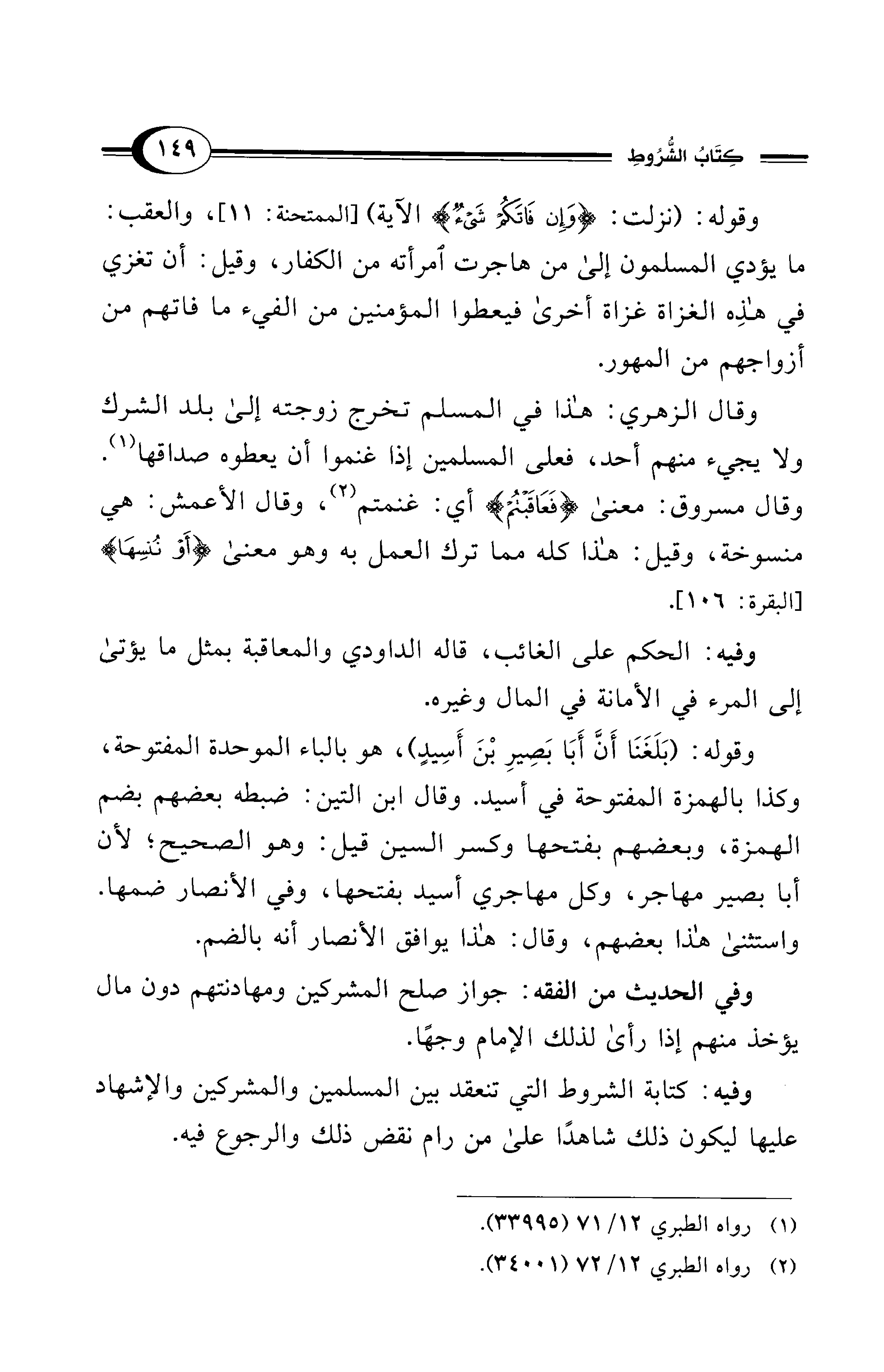 وقوله: (نزلت: {وَإِنْ فَاتَكُمْ شَيْءٌ} الآية [الممتحنة: 11]، والعقب: ما يؤدي المسلمون إلى من هاجرت امرأته من الكفار، وقيل: أن تغزي في هذِه الغزاة غزاة أخرى فيعطوا المؤمنين من الفيء ما فاتهم من أزواجهم من المهور.
