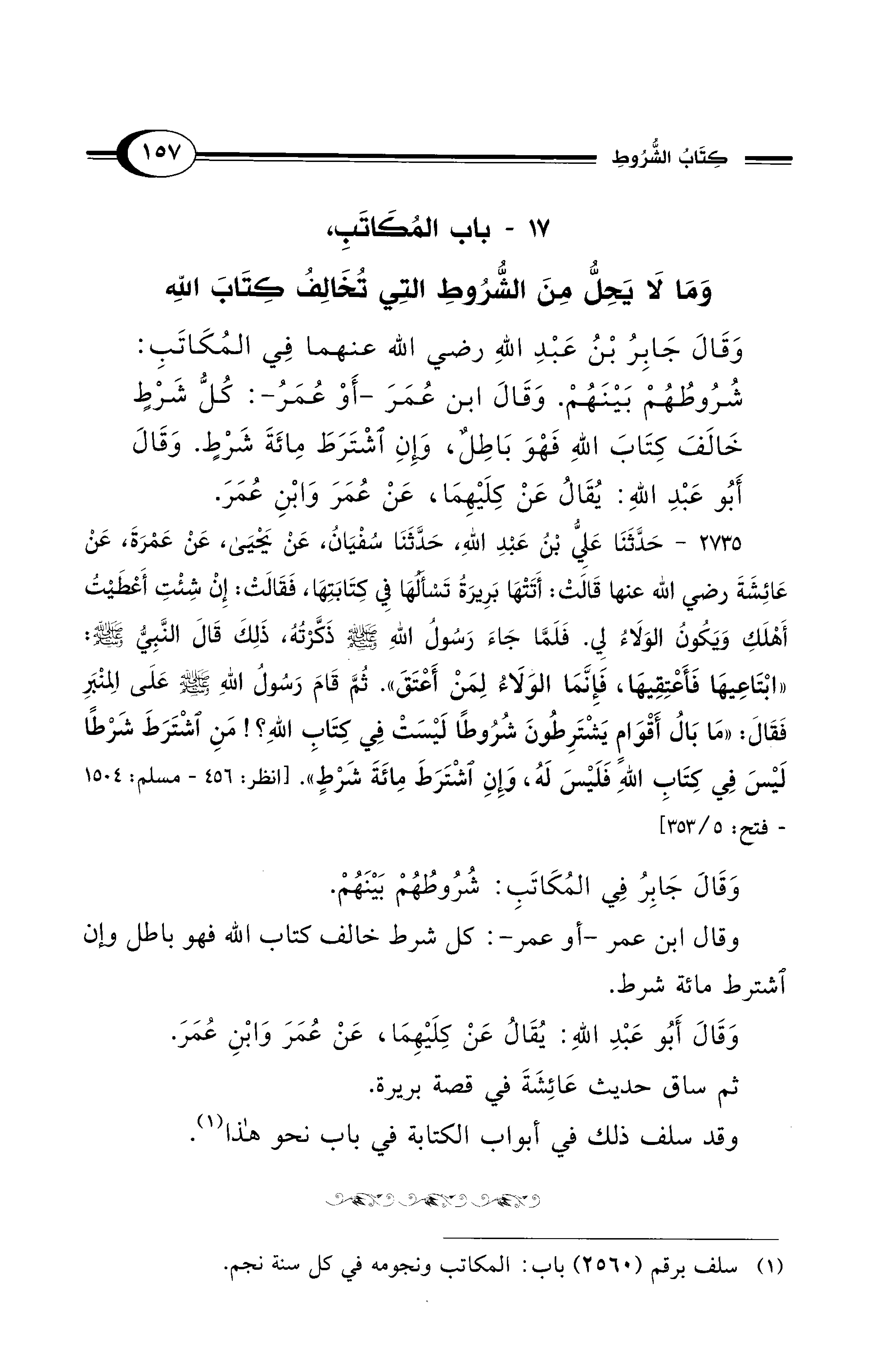 2735 - حَدَّثَنَا عَلِيُّ بْنُ عَبْدِ اللهِ، حَدَّثَنَا سُفْيَانُ، عَنْ يَحْيَى، عَنْ عَمْرَةَ، عَنْ عَائِشَةَ رضي الله عنها قَالَتْ: أَتَتْهَا بَرِيرَةُ تَسْأَلُهَا فِي كِتَابَتِهَا، فَقَالَتْ: إِنْ شِئْتِ أَعْطَيْتُ أَهْلَكِ وَيَكُونُ الوَلاَءُ لِي. فَلَمَّا جَاءَ رَسُولُ اللهِ - صلى الله عليه وسلم - ذَكَّرْتُهُ، ذَلِكَ قَالَ النَّبِيُّ - صلى الله عليه وسلم -: "ابْتَاعِيهَا فَأَعْتِقِيهَا، فَإِنَّمَا الوَلاَءُ لِمَنْ أَعْتَقَ". ثُمَّ قَامَ رَسُولُ اللهِ - صلى الله عليه وسلم - عَلَى المِنْبَرِ فَقَالَ: "مَا بَالُ أَقْوَامٍ يَشْتَرِطُونَ شُرُوطًا لَيْسَتْ فِي كِتَابِ اللهِ؟! مَنِ اشْتَرَطَ شَرْطًا لَيْسَ فِي كِتَابِ اللهِ فَلَيْسَ لَهُ، وَإِنِ اشْتَرَطَ مِائَةَ شَرْطٍ". [انظر: 456 - مسلم: 1504 - فتح: 5/ 353]