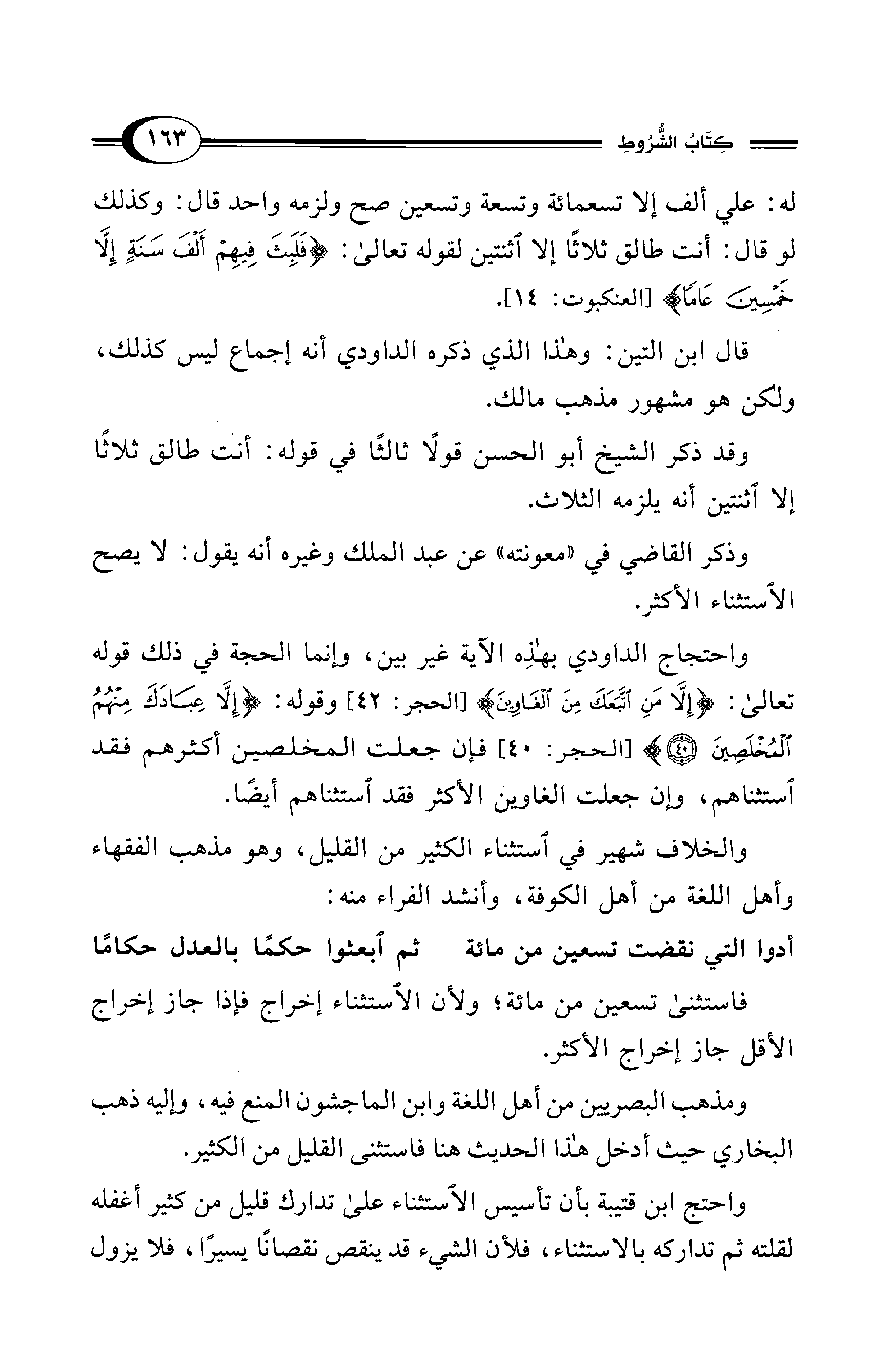 له: علي ألف إلا تسعمائة وتسعة وتسعين صح ولزمه واحد قال: وكذلك لو قال: أنت طالق ثلاثًا إلا اثنتين لقوله تعالى: {فَلَبِثَ فِيهِمْ أَلْفَ سَنَةٍ إِلَّا خَمْسِينَ عَامًا} [العنكبوت: 14].