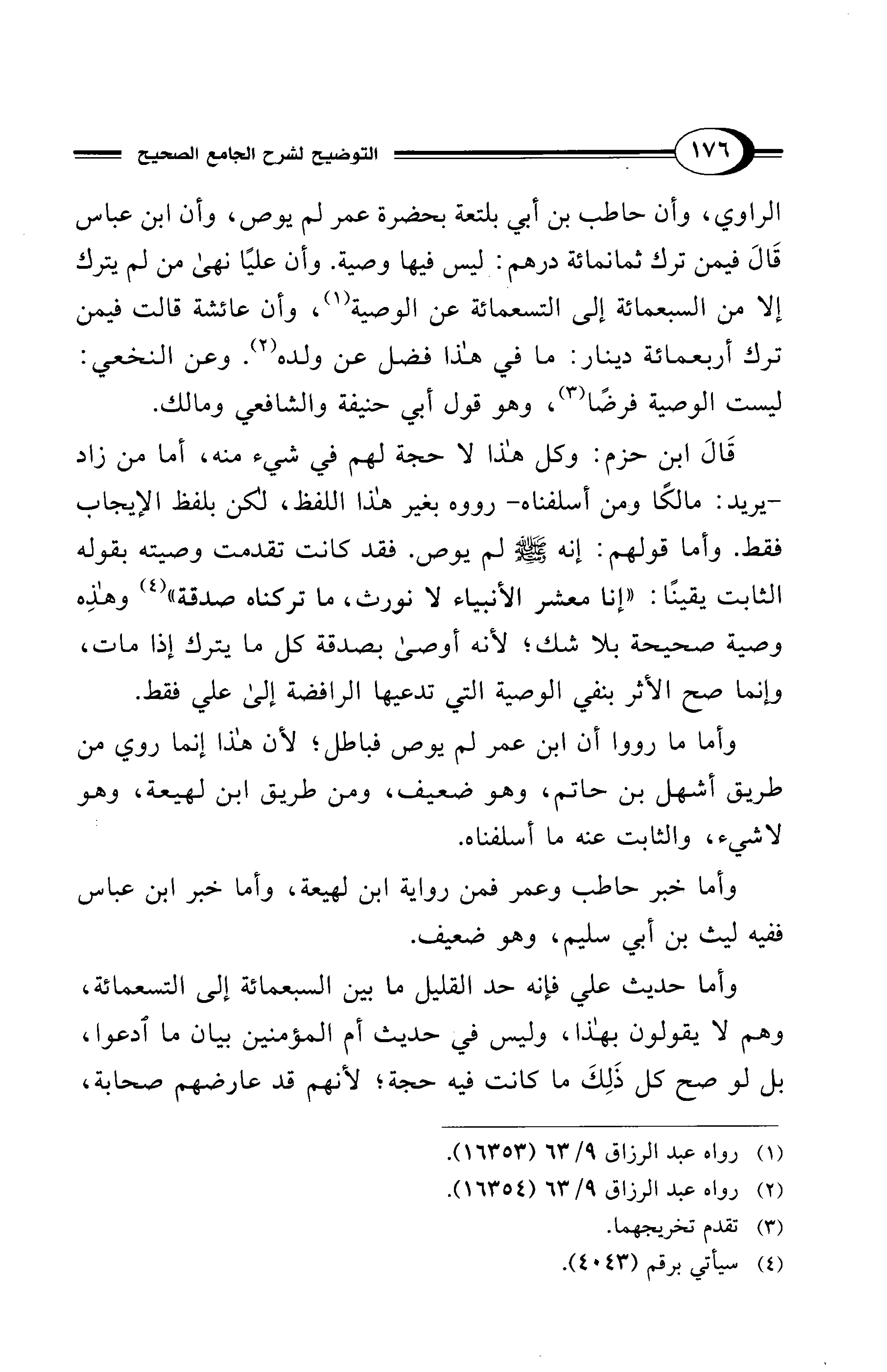 قَالَ ابن حزم: وكل هذا لا حجة لهم في شيء منه، أما من زاد -يريد: مالكًا ومن أسلفناه- رووه بغير هذا اللفظ، لكن بلفظ الإيجاب فقط. وأما قولهم: إنه - صلى الله عليه وسلم - لم يوص. فقد كانت تقدمت وصيته بقوله الثابت يقينًا: "إنا معشر الأنبياء لا نورث، ما تركناه صدقة" (¬4) وهذِه وصية صحيحة بلا شك؛ لأنه أوصى بصدقة كل ما يترك إذا مات، وإنما صح الأثر بنفي الوصية التي تدعيها الرافضة إلى علي فقط.