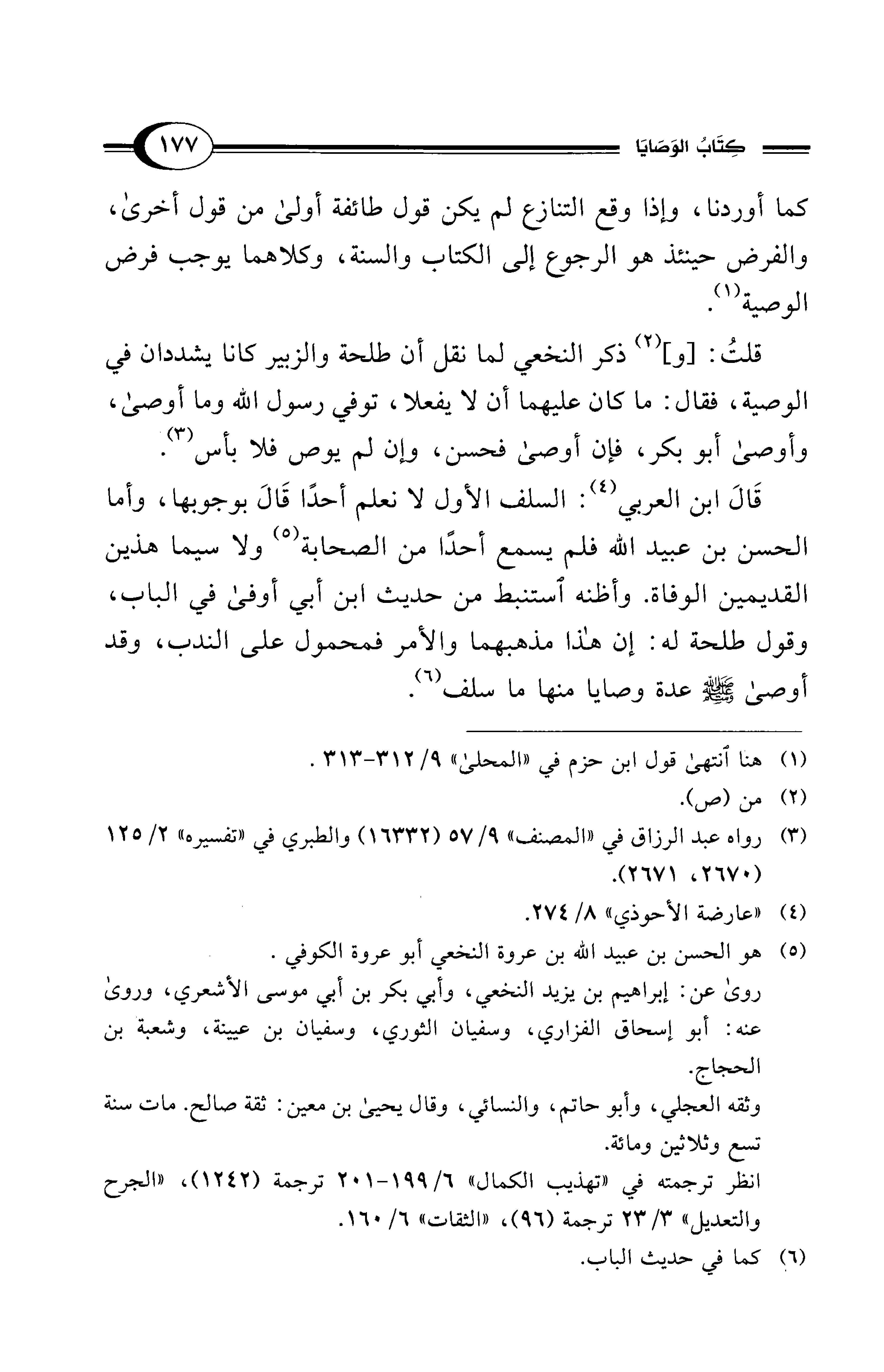 قلتُ: [و] (¬2) ذكر النخعي لما نقل أن طلحة والزبير كانا يشددان في الوصية، فقال: ما كان عليهما أن لا يفعلا، توفي رسول الله وما أوصى، وأوصى أبو بكر، فإن أوصى فحسن، وإن لم يوص فلا بأس (¬3).