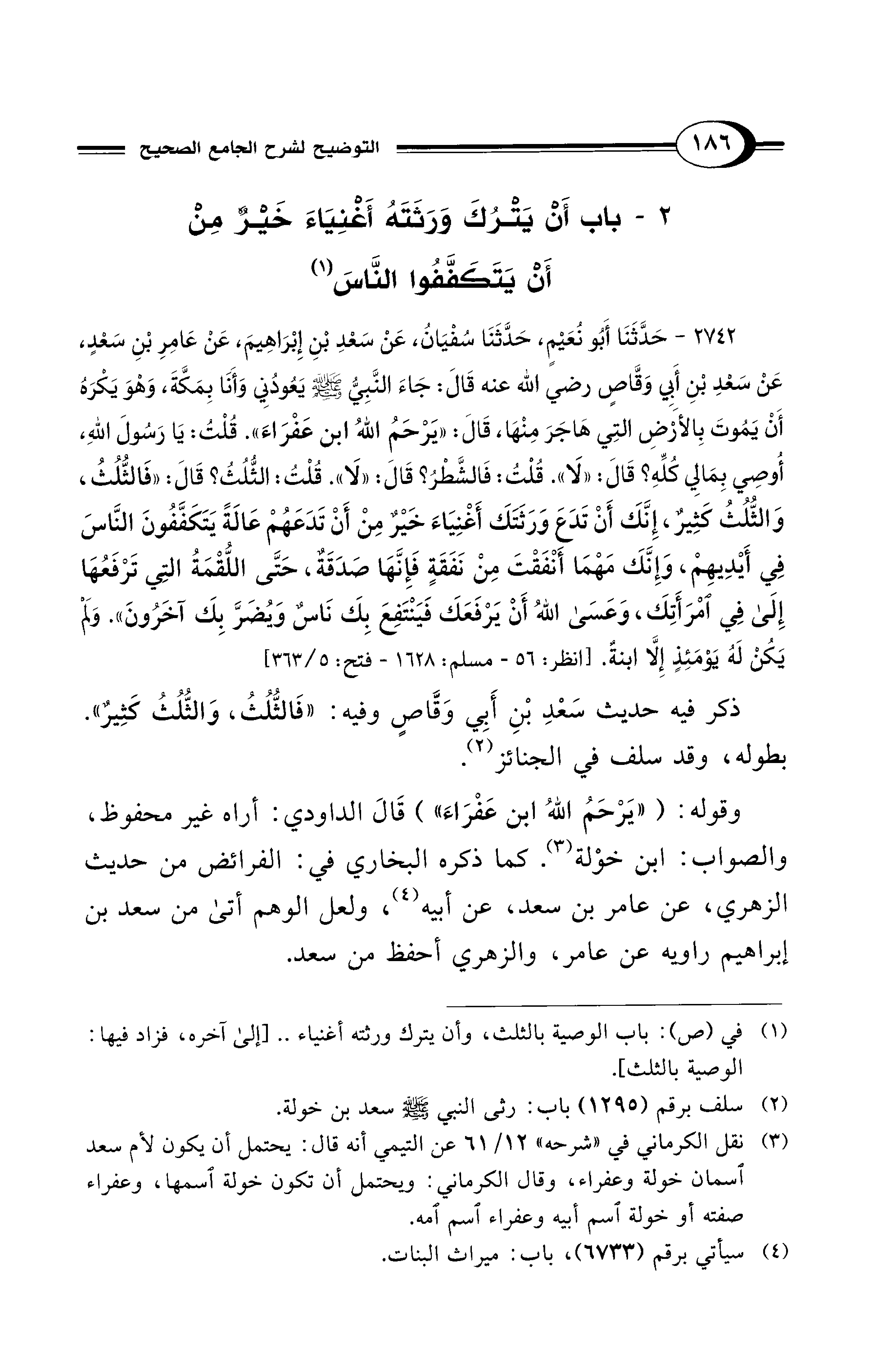 2742 - حَدَّثَنَا أَبُو نُعَيْمٍ، حَدَّثَنَا سُفْيَانُ عَنْ سَعْدِ بْنِ إِبْرَاهِيمَ، عَنْ عَامِرِ بْنِ سَعْدٍ، عَنْ سَعْدِ بْنِ أَبِي وَقَّاصٍ رضي الله عنه قَالَ: جَاءَ النَّبِيُّ - صلى الله عليه وسلم - يَعُودُنِي وَأَنَا بِمَكَّةَ، وَهْوَ يَكْرَهُ أَنْ يَمُوتَ بِالأَرْضِ التِي هَاجَرَ مِنْهَا قَالَ: "يَرْحَمُ اللهُ ابْنَ عَفْرَاءَ". قُلْتُ: يَا رَسُولَ اللهِ، أُوصِي بِمَالِي كُلِّهِ؟ قَالَ: "لَا". قُلْتُ: فَالشَّطْرُ؟ قَالَ: "لَا". قُلْتُ: الثُّلُثُ؟ قَالَ: "فَالثُّلُثُ، وَالثُّلُثُ كَثِيرٌ، إِنَّكَ أَنْ تَدَعَ وَرَثَتَكَ أَغْنِيَاءَ خَيْرٌ مِنْ أَنْ تَدَعَهُمْ عَالَةً يَتَكَفَّفُونَ النَّاسَ فِي أَيْدِيهِمْ، وَإِنَّكَ مَهْمَا أَنْفَقْتَ مِنْ نَفَقَةٍ فَإِنَّهَا صَدَقَةٌ، حَتَّى اللُّقْمَةُ التِي تَرْفَعُهَا إِلَى فِي امْرَأَتِكَ، وَعَسَى اللهُ أَنْ يَرْفَعَكَ فَيَنْتَفِعَ بِكَ نَاسٌ وَيُضَرَّ بِكَ آخَرُونَ". وَلَمْ يَكُنْ لَهُ يَوْمَئِذٍ إِلَّا ابْنَةٌ. [انظر: 56 - مسلم: 1628 - فتح: 5/ 363]