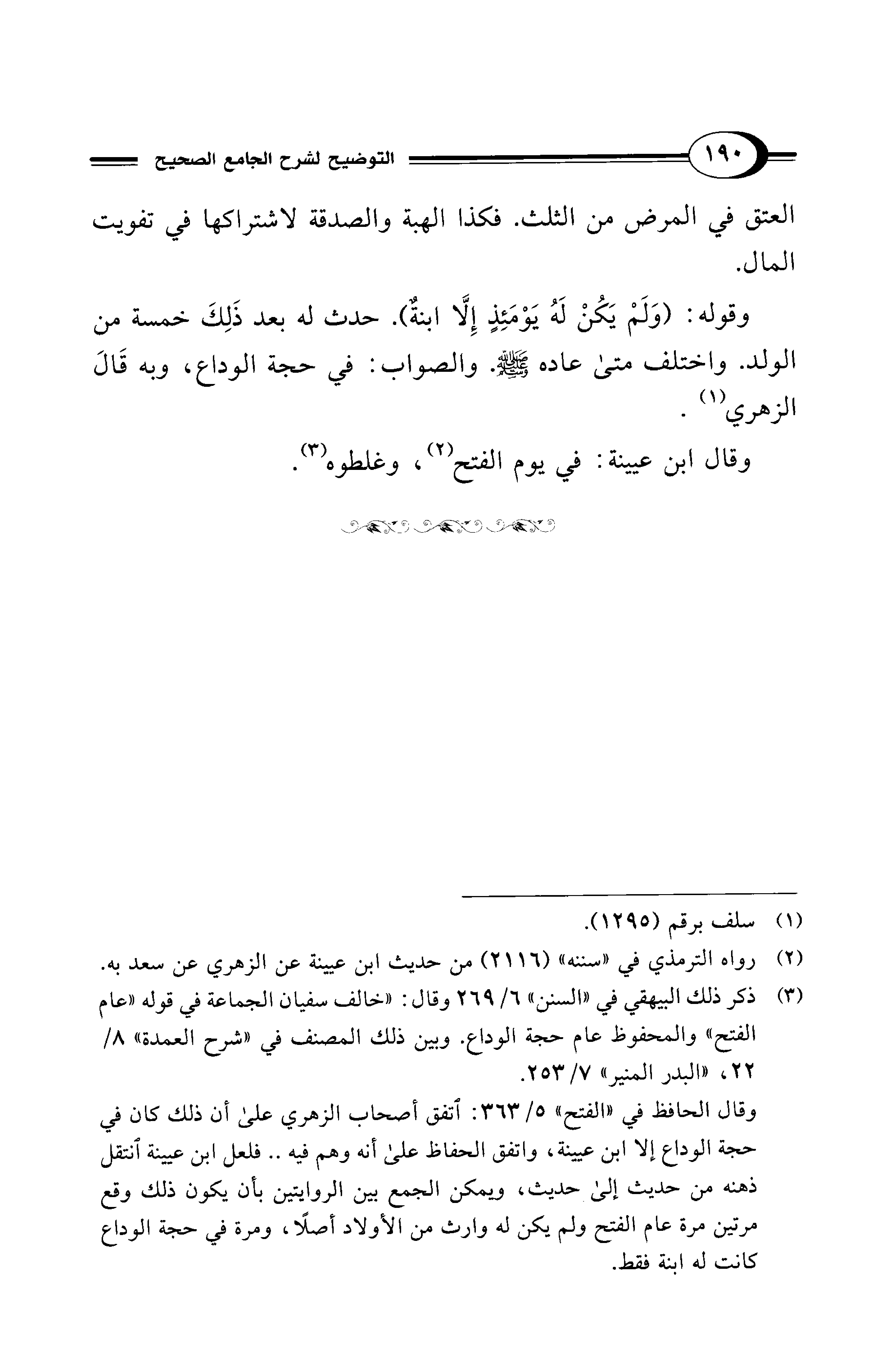 وقال الحافظ في "الفتح" 5/ 363: اتفق أصحاب الزهري على أن ذلك كان في حجة الوداع إلا ابن عيينة، واتفق الحفاظ على أنه وهم فيه .. فلعل ابن عيينة انتقل ذهنه من حديث إلى حديث، ويمكن الجمع بين الروايتين بأن يكون ذلك وقع مرتين مرة عام الفتح ولم يكن له وارث من الأولاد أصلًا، ومرة في حجة الوداع كانت له ابنة فقط.
