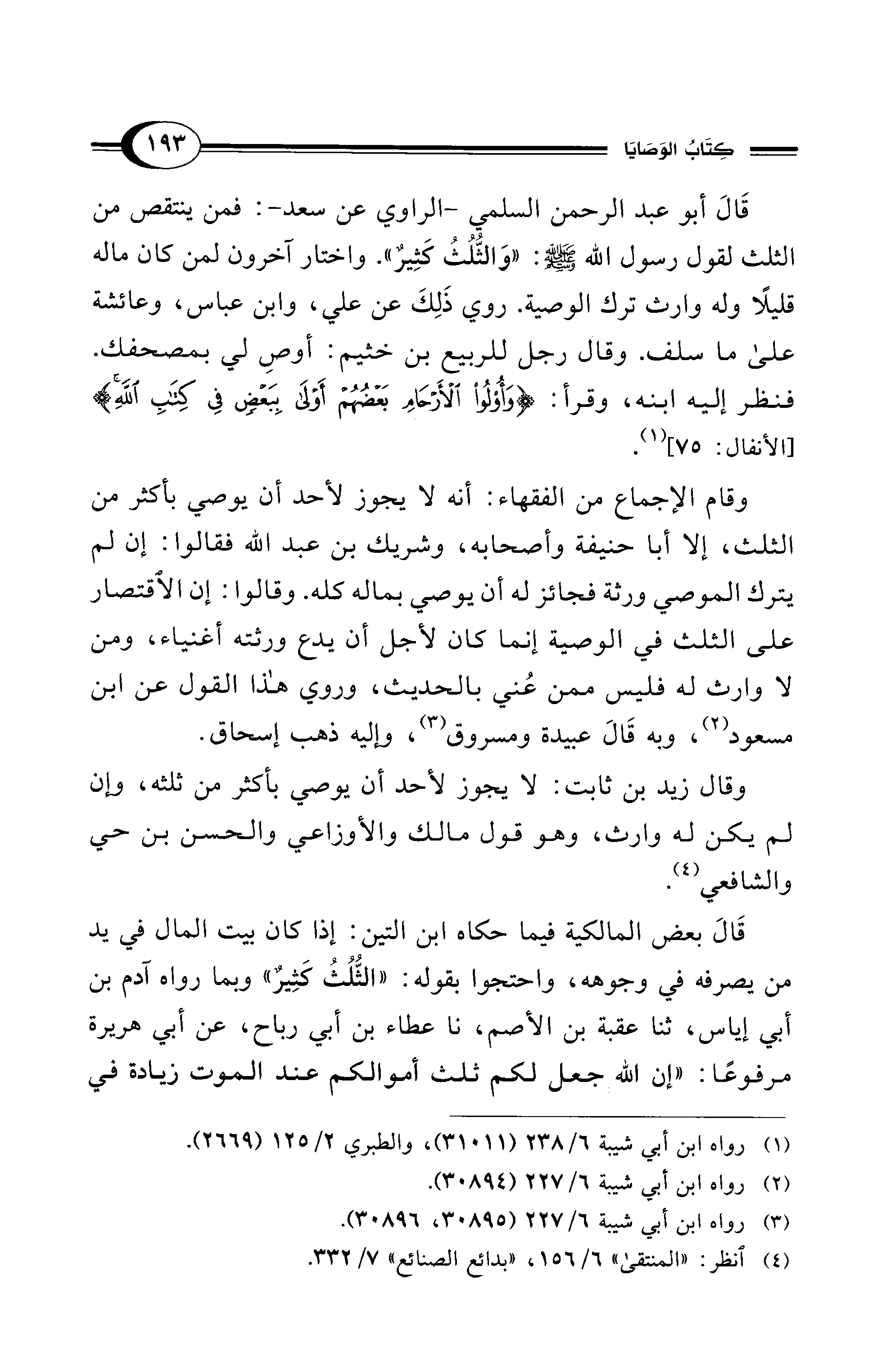 وقال زيد بن ثابت: لا يجوز لأحد أن يوصي بأكثر من ثلثه، وإن لم يكن له وارث، وهو قول مالك والأوزاعي والحسن بن حي والشافعي (¬4).