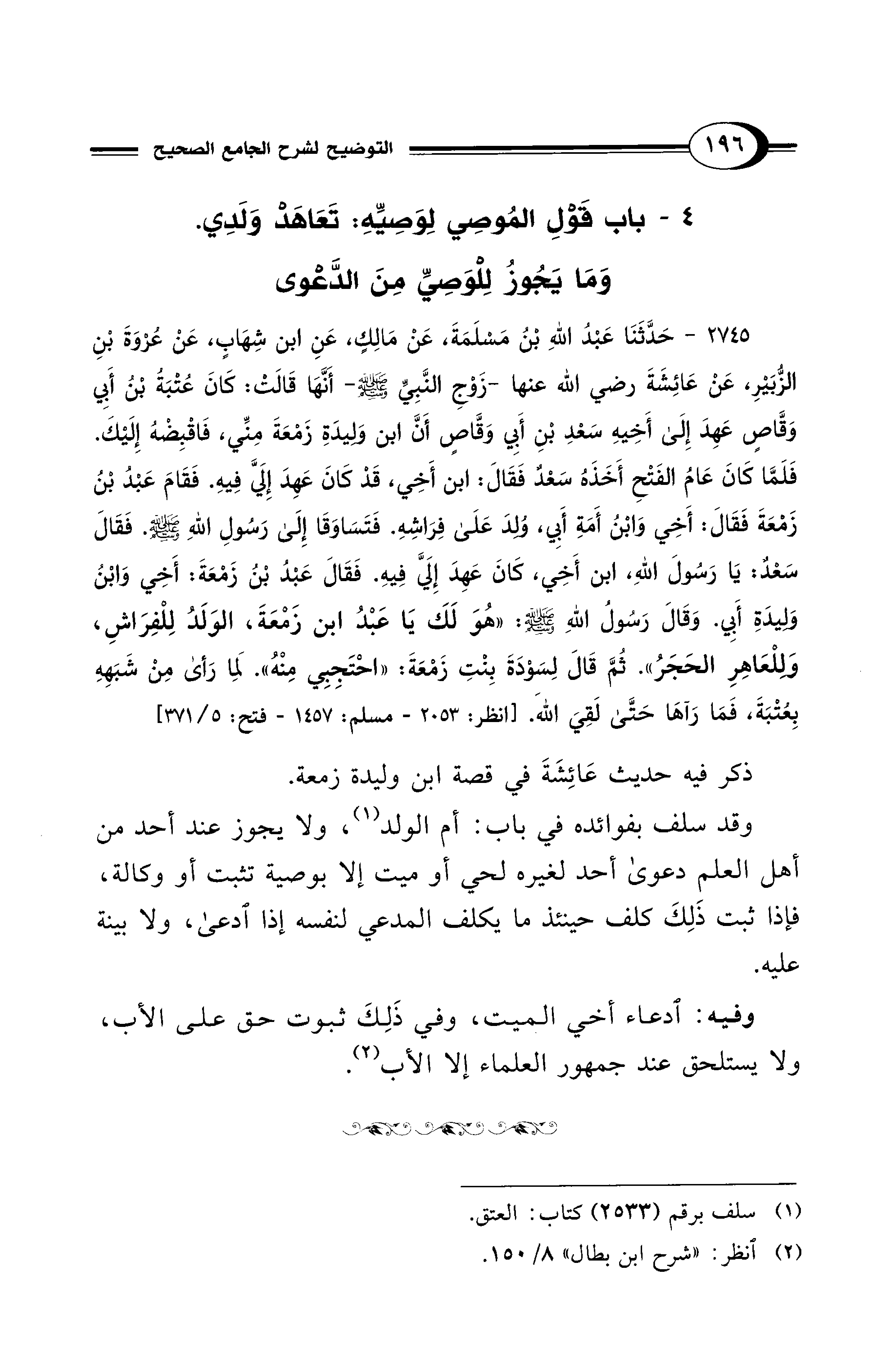 2745 - حَدَّثَنَا عَبْدُ اللهِ بْنُ مَسْلَمَةَ، عَنْ مَالِكٍ، عَنِ ابْنِ شِهَابٍ، عَنْ عُرْوَةَ بْنِ الزُّبَيْرِ، عَنْ عَائِشَةَ رضي الله عنها -زَوْجِ النَّبِيِّ - صلى الله عليه وسلم -- أَنَّهَا قَالَتْ: كَانَ عُتْبَةُ بْنُ أَبِي وَقَّاصٍ عَهِدَ إِلَى أَخِيهِ سَعْدِ بْنِ أَبِي وَقَّاصٍ أَنَّ ابْنَ وَلِيدَةِ زَمْعَةَ مِنِّي، فَاقْبِضْهُ إِلَيْكَ. فَلَمَّا كَانَ عَامُ الفَتْحِ أَخَذَهُ سَعْدٌ فَقَالَ: ابْنُ أَخِي، قَدْ كَانَ عَهِدَ إِلَيَّ فِيهِ. فَقَامَ عَبْدُ بْنُ زَمْعَةَ فَقَالَ: أَخِي، وَابْنُ أَمَةِ أَبِي، وُلِدَ عَلَى فِرَاشِهِ. فَتَسَاوَقَا إِلَى رَسُولِ اللهِ - صلى الله عليه وسلم -. فَقَالَ سَعْدٌ: يَا رَسُولَ اللهِ، ابْنُ أَخِي، كَانَ عَهِدَ إِلَيَّ فِيهِ. فَقَالَ عَبْدُ بْنُ زَمْعَةَ: أَخِي وَابْنُ وَلِيدَةِ أَبِي. وَقَالَ رَسُولُ اللهِ - صلى الله عليه وسلم -: "هُوَ لَكَ يَا عَبْدُ ابْنَ زَمْعَةَ، الوَلَدُ لِلْفِرَاشِ، وَلِلْعَاهِرِ الحَجَرُ". ثُمَّ قَالَ لِسَوْدَةَ بِنْتِ زَمْعَةَ: "احْتَجِبِي مِنْهُ". لِمَا رَأَى مِنْ شَبَهِهِ بِعُتْبَةَ، فَمَا رَآهَا حَتَّى لَقِيَ اللهَ. [انظر: 2053 - مسلم: 1457 - فتح: 5/ 371]