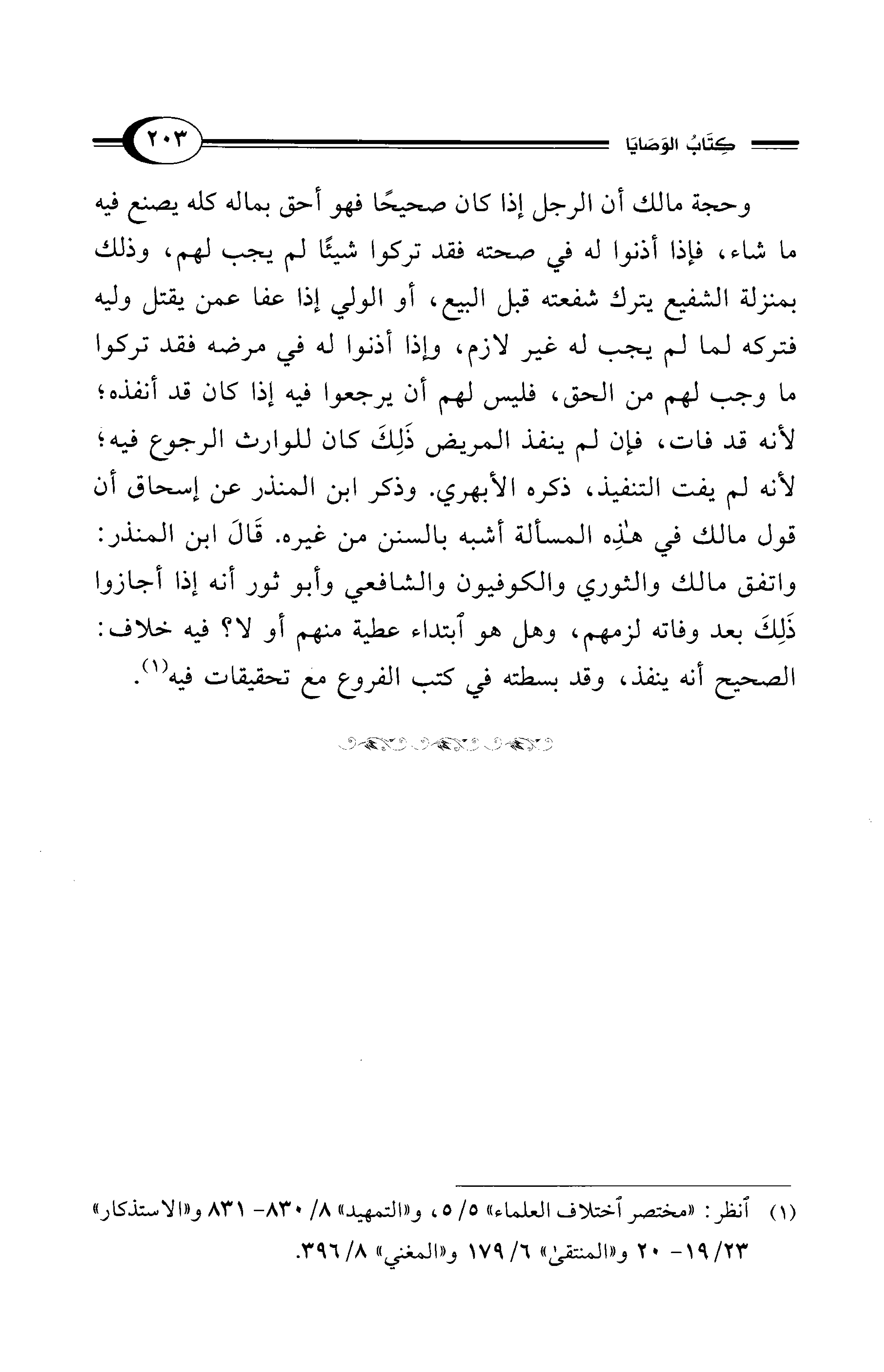 وحجة مالك أن الرجل إذا كان صحيحًا فهو أحق بماله كله يصنع فيه ما شاء، فإذا أذنوا له في صحته فقد تركوا شيئًا لم يجب لهم، وذلك بمنزلة الشفيع يترك شفعته قبل البيع، أو الولي إذا عما عمن يقتل وليه فتركه لما لم يجب له غير لازم، هاذا أذنوا له في مرضه فقد تركوا ما وجب لهم من الحق، فليس لهم أن يرجعوا فيه إذا كان قد أنفذه؛ لأنه قد فات، فإن لم ينفذ المريض ذَلِكَ كان للوارث الرجوع فيه؛ لأنه لم يفت التنفيذ، ذكره الأبهري. وذكر ابن المنذر عن إسحاق أن قول مالك في هذِه المسألة أشبه بالسنن من غيره. قَالَ ابن المنذر: واتفق مالك والثوري والكوفيون والشافعي وأبو ثور أنه إذا أجازوا ذَلِكَ بعد وفاته لزمهم، وهل هو ابتداء عطية منهم أو لا؟ فيه خلاف: الصحيح أنه ينفذ، وقد بسطته في كتب الفروع مع تحقيقات فيه (¬1).