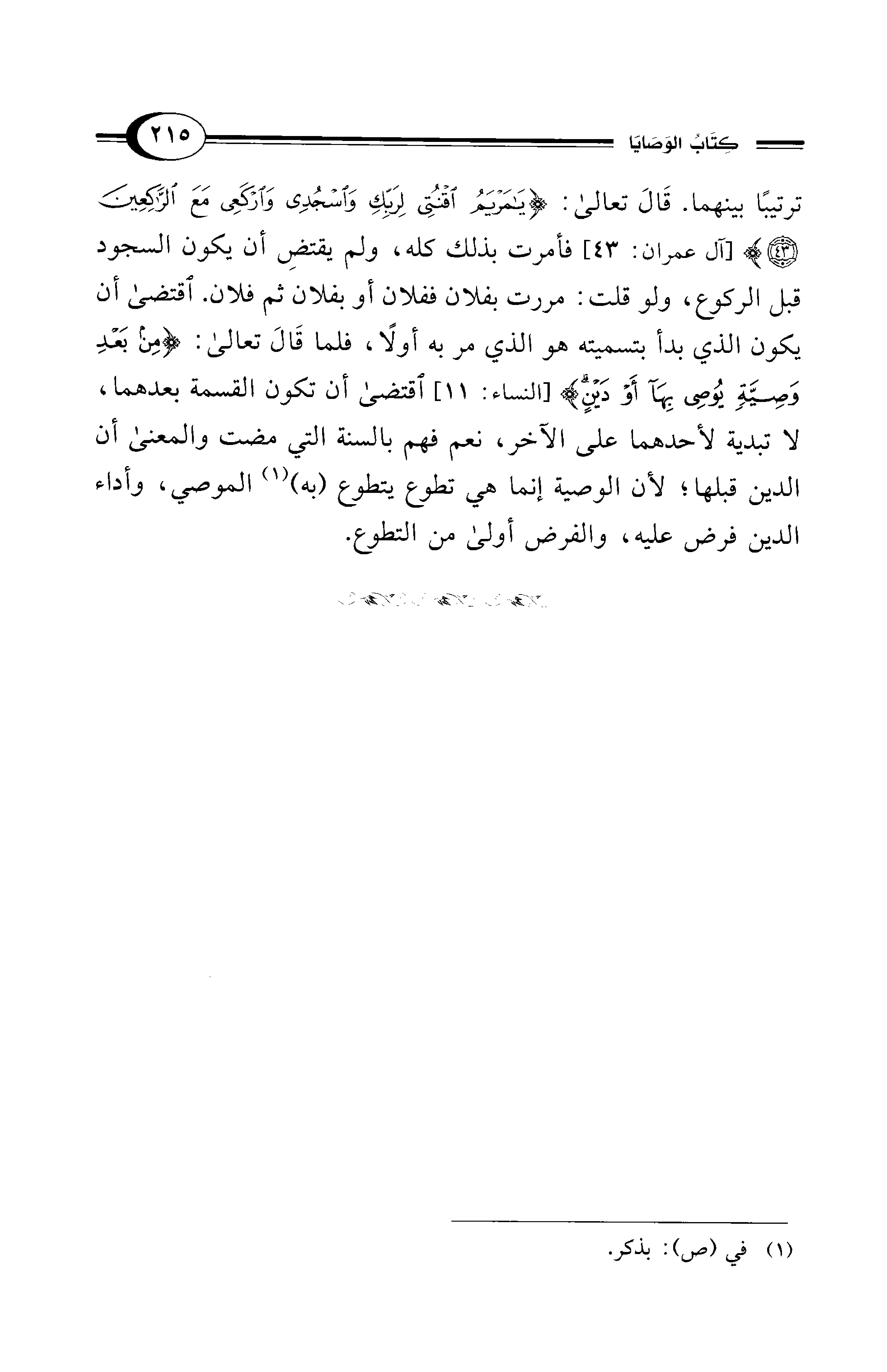 ترتيبًا بينهما. قَالَ تعالى: {يَا مَرْيَمُ اقْنُتِي لِرَبِّكِ وَاسْجُدِي وَارْكَعِي مَعَ الرَّاكِعِينَ (43)} [آل عمران: 43] فأمرت بذلك كله، ولم يقتضِ أن يكون السجود قبل الركوع، ولو قلت: مررت بفلان ففلان أو بفلان ثم فلان. اقتضى أن يكون الذي بدأ بتسميته هو الذي مر به أولًا، فلما قَالَ تعالى: {مِنْ بَعْدِ وَصِيَّةٍ يُوصَى بِهَا أَوْ دَيْنٍ} [النساء: 11] اقتضى أن تكون القسمة بعدهما، لا تبدية لأحدهما على الآخر، نعم فهم بالسنة التي مضت والمعنى أن الدين قبلها؛ لأن الوصية إنما هي تطوع يتطوع (به) (¬1) الموصي، وأداء الدين فرض عليه، والفرض أولى من التطوع.