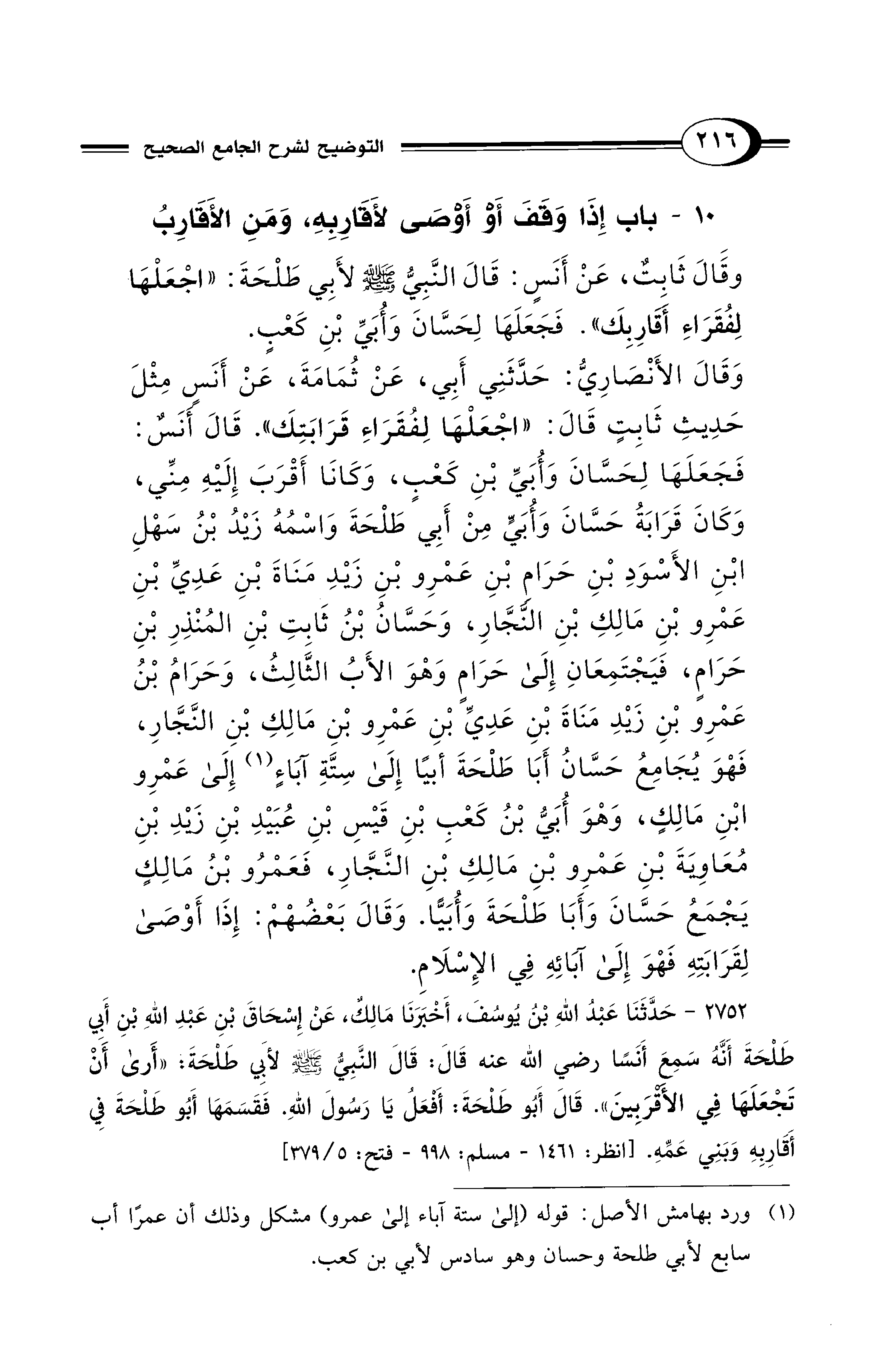 وَقَالَ الأَنْصَارِيُّ: حَدَّثَنِي أَبِي، عَنْ ثُمَامَةَ، عَنْ أَنَسٍ مِثْلَ حَدِيثِ ثَابِتٍ قَالَ: "اجْعَلْهَا لِفُقَرَاءِ قَرَابَتِكَ". قَالَ أَنَسٌ: فَجَعَلَهَا لِحَسَّانَ وَأُبَيِّ بْنِ كَعْبٍ، وَكَانَا أَقْرَبَ إِلَيْهِ مِنِّي، وَكَانَ قَرَابَةُ حَسَّانَ وَأُبَيٍّ مِنْ أَبِي طَلْحَةَ وَاسْمُهُ زَيْدُ بْنُ سَهْلِ بْنِ الأَسْوَدِ بْنِ حَرَامِ بْنِ عَمْرِو بْنِ زَيْدِ مَنَاةَ بْنِ عَدِيِّ بْنِ عَمْرِو بْنِ مَالِكِ بْنِ النَّجَّارِ، وَحَسَّانُ بْنُ ثَابِتِ بْنِ المُنْذِرِ بْنِ حَرَامٍ فَيَجْتَمِعَانِ إِلَى حَرَامٍ، وَهْوَ الأَبُ الثَّالِثُ، وَحَرَامُ بْنُ عَمْرِو بْنِ زَيْدِ مَنَاةَ بْنِ عَدِيِّ بْنِ عَمْرِو بْنِ مَالِكِ بْنِ النَّجَّارِ، فَهْوَ يُجَامِعُ حَسَّانُ أَبَا طَلْحَةَ وَأُبَيٌّ إِلَى سِتَّةِ آبَاءٍ (¬1) إِلَى عَمْرِو بْنِ مَالِكٍ، وَهْوَ أُبَيُّ بْنُ كَعْبِ بْنِ قَيْسِ بْنِ عُبَيْدِ بْنِ زَيْدِ بْنِ مُعَاوِيَةَ بْنِ عَمْرِو بْنِ مَالِكِ بْنِ النَّجَّارِ، فَعَمْرُو بْنُ مَالِكٍ يَجْمَعُ حَسَّانَ وَأَبَا طَلْحَةَ وَأُبَيًّا. وَقَالَ بَعْضُهْمْ: إِذَا أَوْصَى لِقَرَابَتِهِ فَهْوَ إِلَى آبَائِهِ فِي الإِسْلاَمِ.