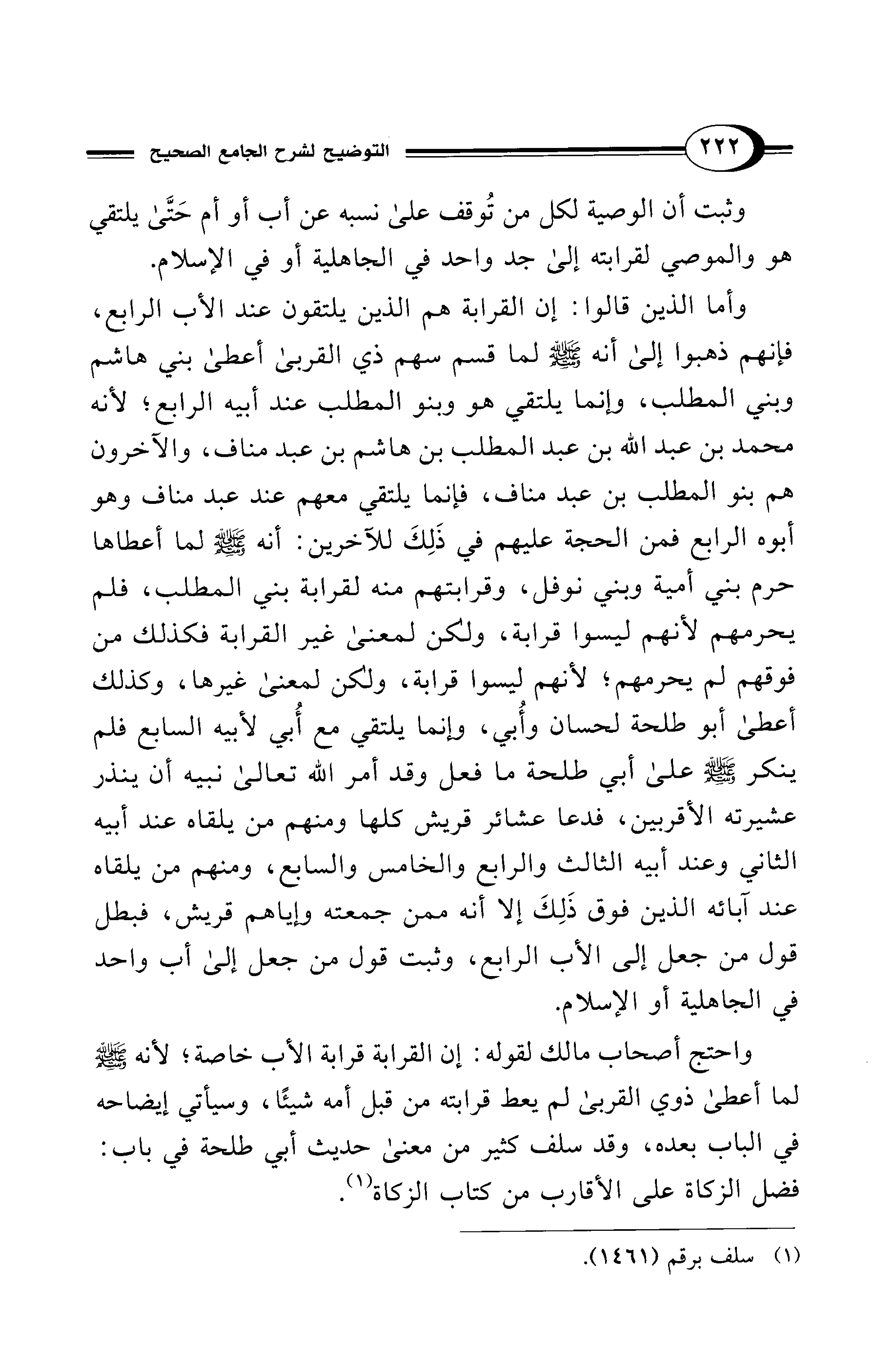 وأما الذين قالوا: إن القرابة هم الذين يلتقون عند الأب الرابع، فإنهم ذهبوا إلى أنه - صلى الله عليه وسلم - لما قسم سهم ذي القربى أعطى بني هاشم وبني المطلب، وإنما يلتقي هو وبنو المطلب عند أبيه الرابع؛ لأنه محمد بن عبد الله بن عبد المطلب بن هاشم بن عبد مناف، والآخرون هم بنو المطلب بن عبد مناف، فإنما يلتقي معهم عند عبد مناف وهو أبوه الرابع فمن الحجة عليهم في ذَلِكَ للآخرين: أنه - صلى الله عليه وسلم - لما أعطاها حرم بني أمية وبني نوفل، وقرابتهم منه لقرابة بني المطلب، فلم يحرمهم لأنهم ليسوا قرابة، ولكن لمعنى غير القرابة فكذلك من فوقهم لم يحرمهم؛ لأنهم ليسوا قرابة، ولكن لمعنى غيرها، وكذلك أعطى أبو طلحة لحسان وأُبي، وإنما يلتقي مع أُبي لأبيه السابع فلم ينكر - صلى الله عليه وسلم - على أبي طلحة ما فعل وقد أمر الله تعالى نبيه أن ينذر عشيرته الأقربين، فدعا عشائر قريش كلها ومنهم من يلقاه عند أبيه الثاني وعند أبيه الثالث والرابع والخامس والسابع، ومنهم من يلقاه عند آبائه الذين فوق ذَلِكَ إلا أنه ممن جمعته وإياهم قريش، فبطل قول من جعل إلى الأب الرابع، وثبت قول من جعل إلى أب واحد في الجاهلية أو الإسلام.