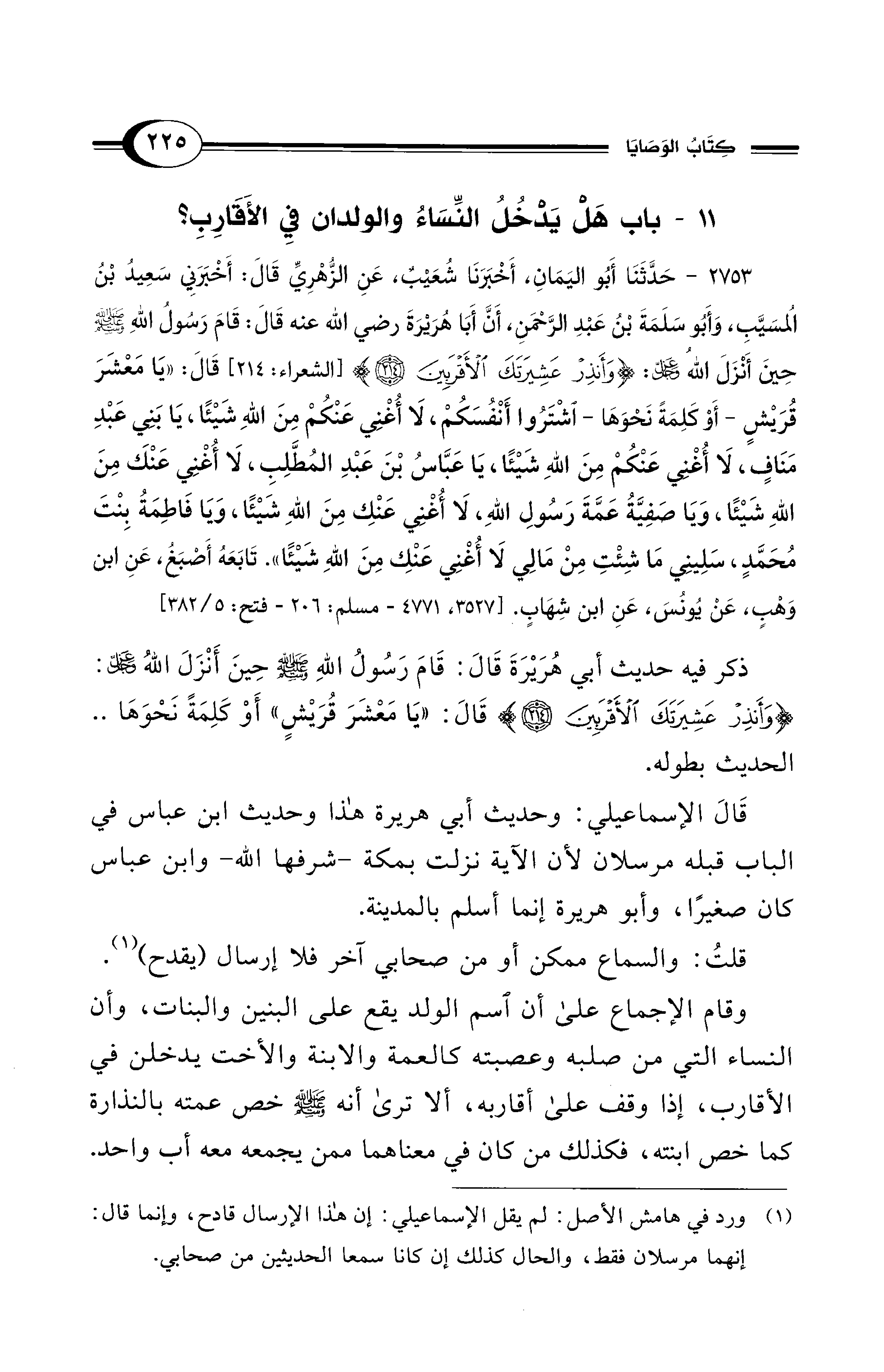 ذكر فيه حديث أبي هُرَيْرَةَ قَال: قَامَ رَسُول اللهِ - صلى الله عليه وسلم - حينَ أَنْزَلَ اللهُ -عز وجل-: {وَأَنْذِرْ عَشِيرَتَكَ الأَقْرَبِينَ (214)} قَال: "يَا مَعْشَرَ قُرَيْشٍ" أَوْ كَلِمَةً نَحْوَهَا .. الحديث بطوله.