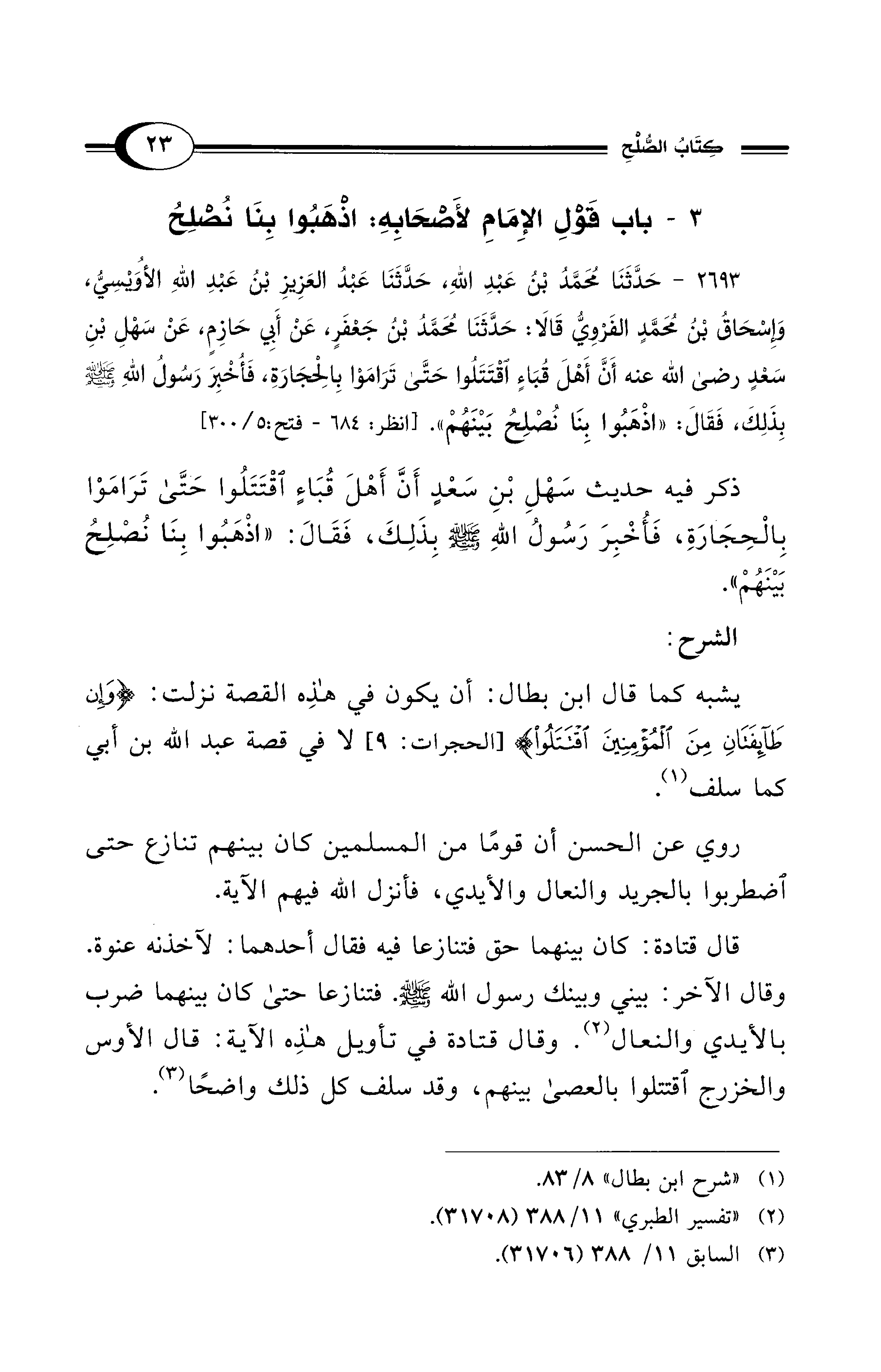 ذكر فيه حديث سَهْلِ بْنِ سَعْدٍ أَنَّ أَهْلَ قُبَاءٍ اقْتَتَلُوا حَتَّى تَرَامَوْا بِالحِجَارَةِ، فَأُخْبِرَ رَسُولُ اللهِ - صلى الله عليه وسلم - بِذَلِكَ، فَقَالَ: "اذْهَبُوا بِنَا نُصْلِحُ بَيْنَهُمْ".