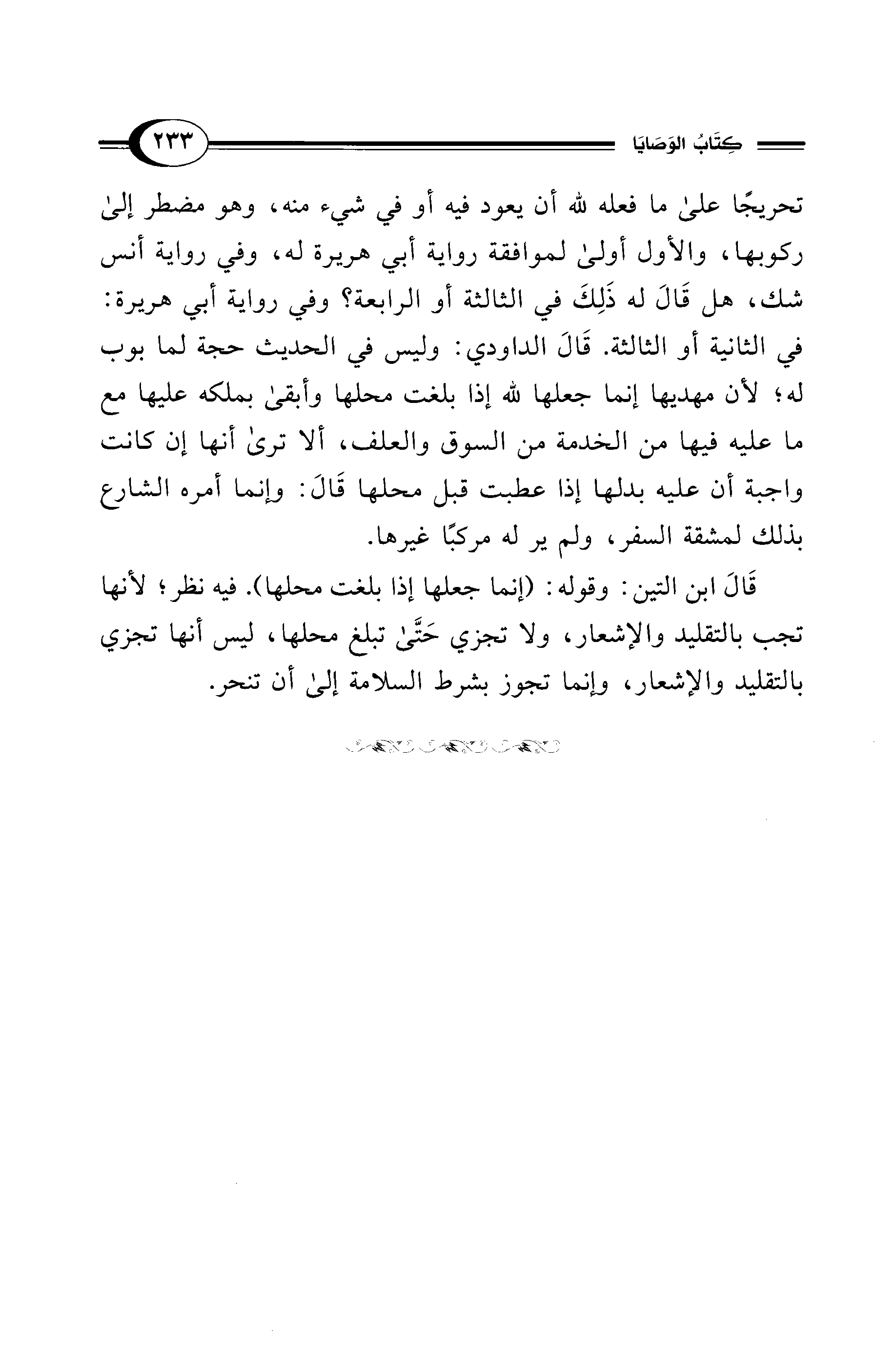 تحريجًا على ما فعله لله أن يعود فيه أو في شيء منه، وهو مضطر إلى ركوبها، والأول أولى لموافقة رواية أبي هريرة له، وفي رواية أنس شك، هل قَالَ له ذَلِكَ في الثالثة أو الرابعة؟ وفي رواية أبي هريرة: في الثانية أو الثالثة. قَالَ الداودي: وليس في الحديث حجة لما بوب له؛ لأن مهديها إنما جعلها لله إذا بلغت محلها وأبقى بملكه عليها مع ما عليه فيها من الخدمة من السوق والعلف، ألا ترى أنها إن كانت