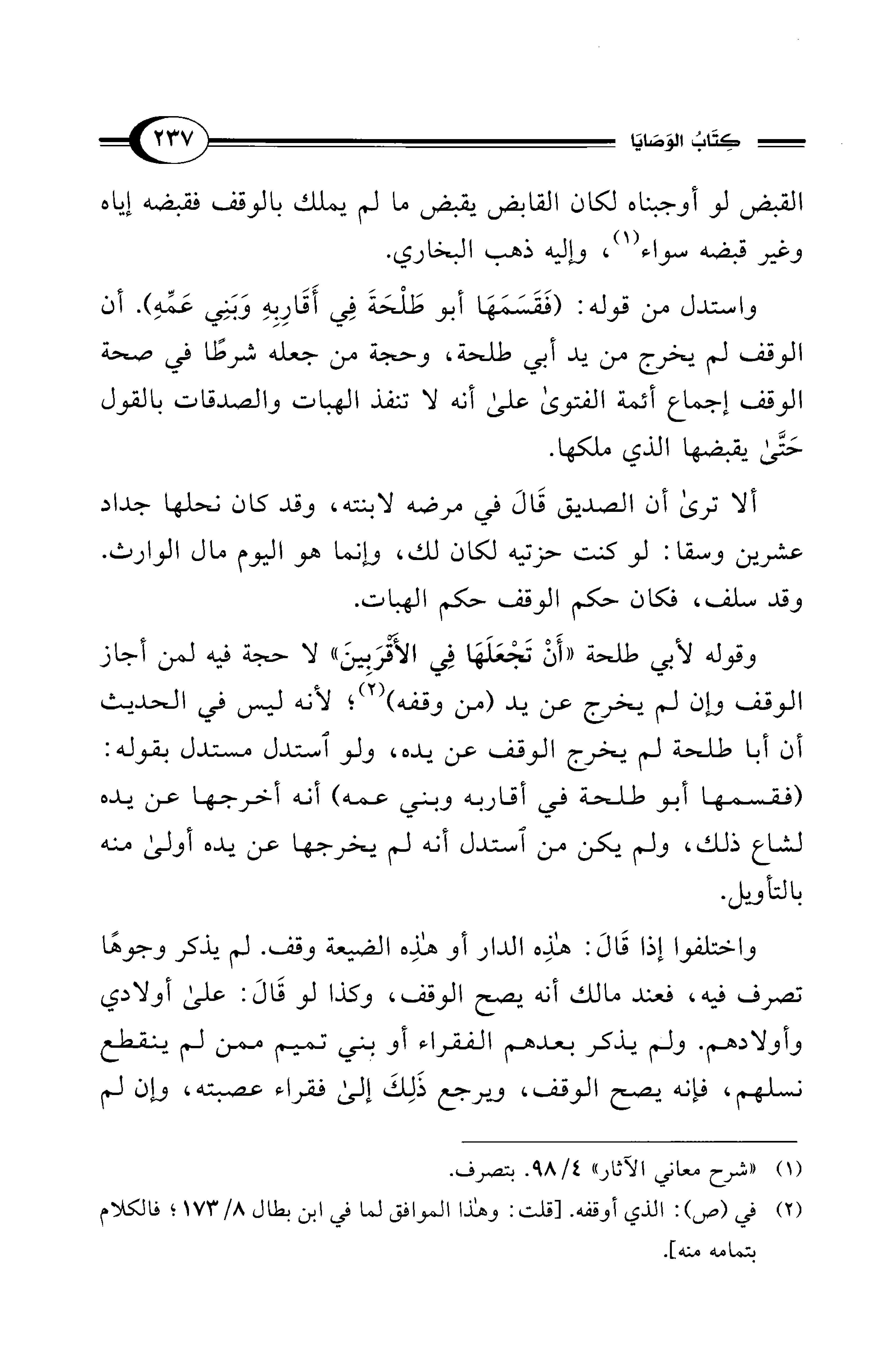 وقوله لأبي طلحة "أَنْ تَجْعَلَهَا فِي الأقرَبينَ" لا حجة فيه لمن أجاز الوقف وإن لم يخرج عن يد (من وقفه) (¬2)؛ لأنه ليس في الحديث أن أبا طلحة لم يخرج الوقف عن يده، ولو استدل مستدل بقوله: (فقسمها أبو طلحة في أقاربه وبني عمه) أنه أخرجها عن يده لشاع ذلك، ولم يكن من استدل أنه لم يخرجها عن يده أولى منه بالتأويل.