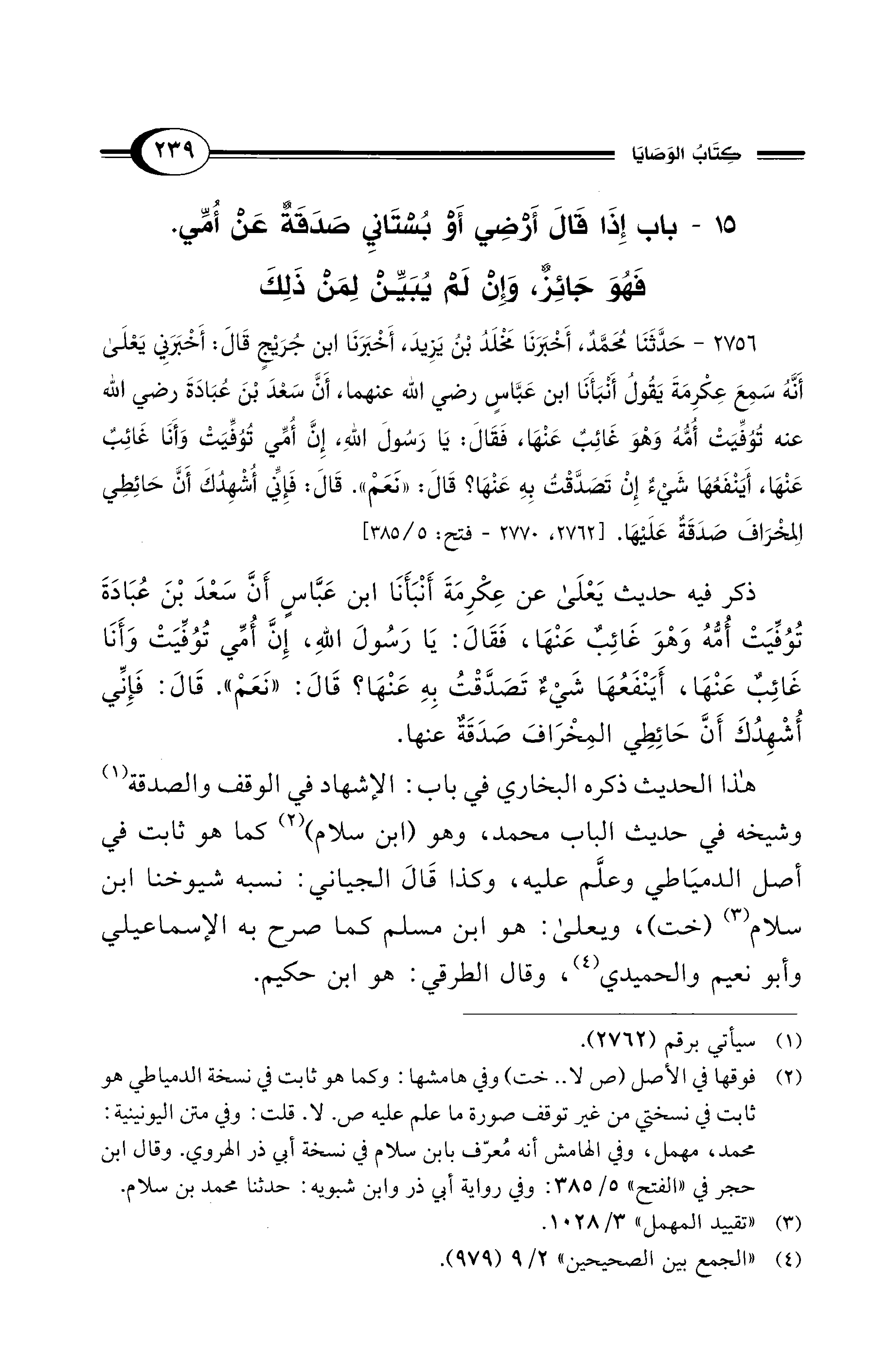 ذكر فيه حديث يَعْلَى عن عِكْرِمَةَ أَنْبَأَنَا ابن عَبَّاسٍ أَنَّ سَعْدَ بْنَ عُبَادَةَ تُوُفِّيَتْ أُمُّهُ وَهْوَ غَائِبٌ عَنْهَا، فَقَالَ: يَا رَسُولَ اللهِ، إِنَّ أُمِّي تُوُفَيَتْ وَأَنَا غَائِبٌ عَنْهَا، أَيَنْفَعُهَا شَيْءٌ تَصَدَّقْتُ بِهِ عَنْهَا؟ قَالَ: "نَعَمْ". قَالَ: فَإِنِّي أُشْهِدُكَ أَنَّ حَائِطِي المِخْرَافَ صَدَقَةٌ عنها.