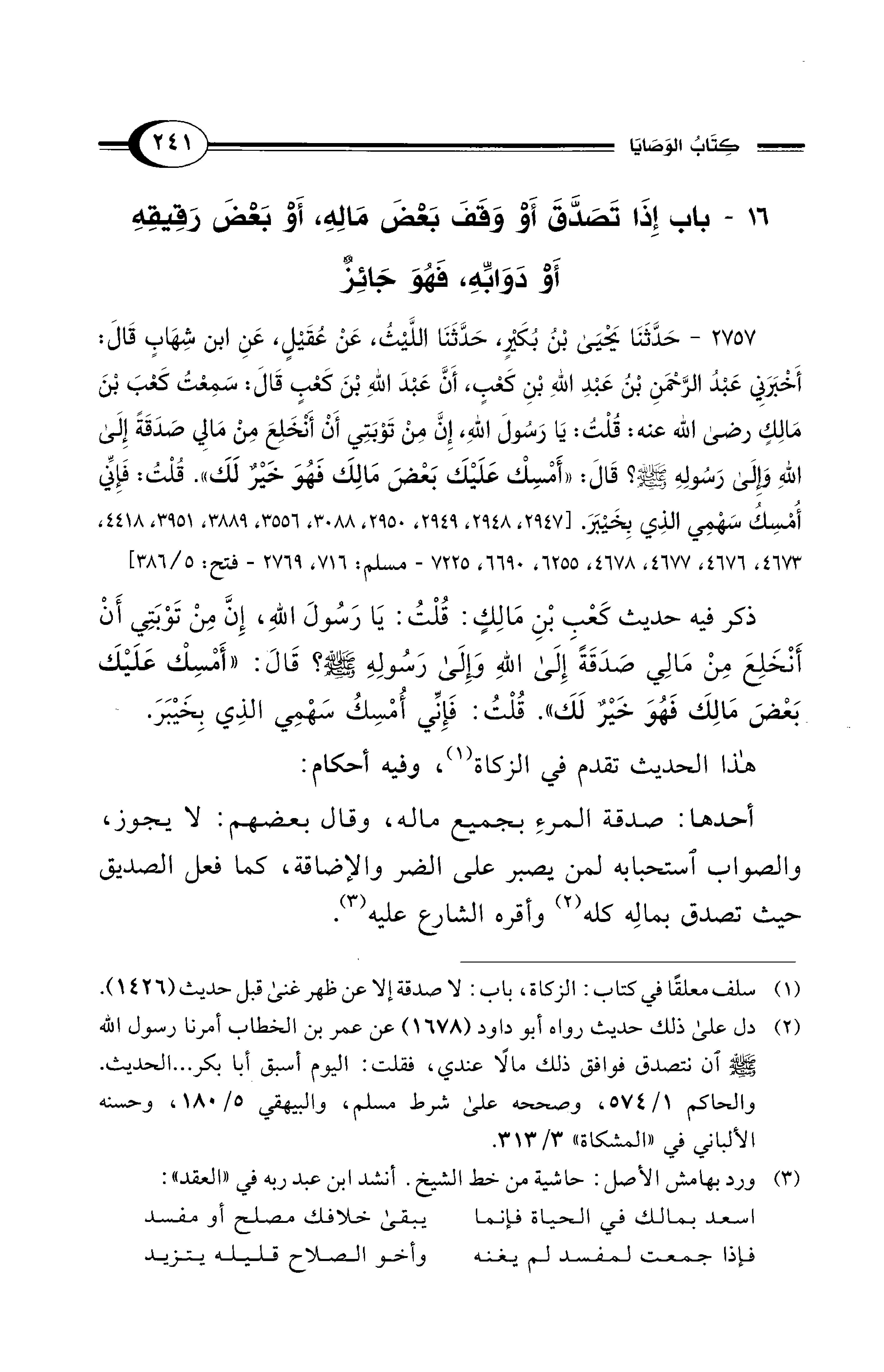ذكر فيه حديث كَعْبِ بْنِ مَالِكٍ: قُلْتُ: يَا رَسُولَ اللهِ، إِنَّ مِنْ تَوْبَتِي أَنْ أَنْخَلِعَ مِنْ مَالِي صَدَقَةً إِلَى اللهِ وَإِلَى رَسُولِهِ - صلى الله عليه وسلم -؟ قَالَ: "أَمْسِكْ عَلَيْكَ بَعْضَ مَالِكَ فَهُوَ خَيْرٌ لَكَ". قُلْتُ: فَإِنِّي أُمْسِكُ سَهْمِي الذِي بِخَيْبَرَ.