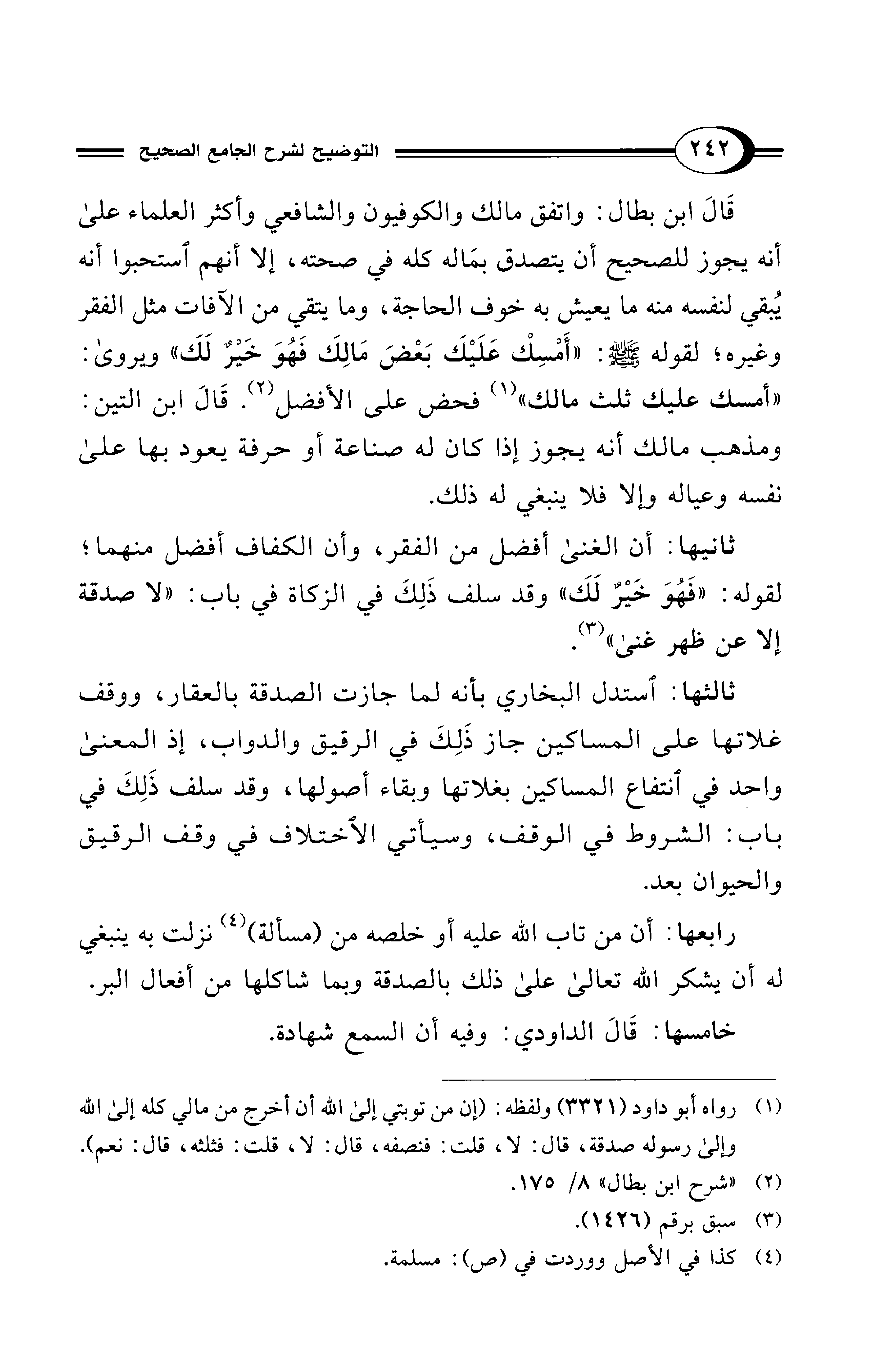 قَالَ ابن بطال: واتفق مالك والكوفيون والشافعي وأكثر العلماء على أنه يجوز للصحيح أن يتصدق بمَاله كله في صحته، إلا أنهم استحبوا أنه يُبقي لنفسه منه ما يعيش به خوف الحاجة، وما يتقي من الآفات مثل الفقر وغيره؛ لقوله - صلى الله عليه وسلم -: "أَمْسِكْ عَلَيْكَ بَعْضَ مَالِكَ فَهُوَ خَيْرٌ لَكَ" ويروى: "أمسك عليك ثلث مالك" (¬1) فحض على الأفضل (¬2). قَالَ ابن التين: ومذهب مالك أنه يجوز إذا كان له صناعة أو حرفة يعود بها على نفسه وعياله وإلا فلا ينبغي له ذلك.