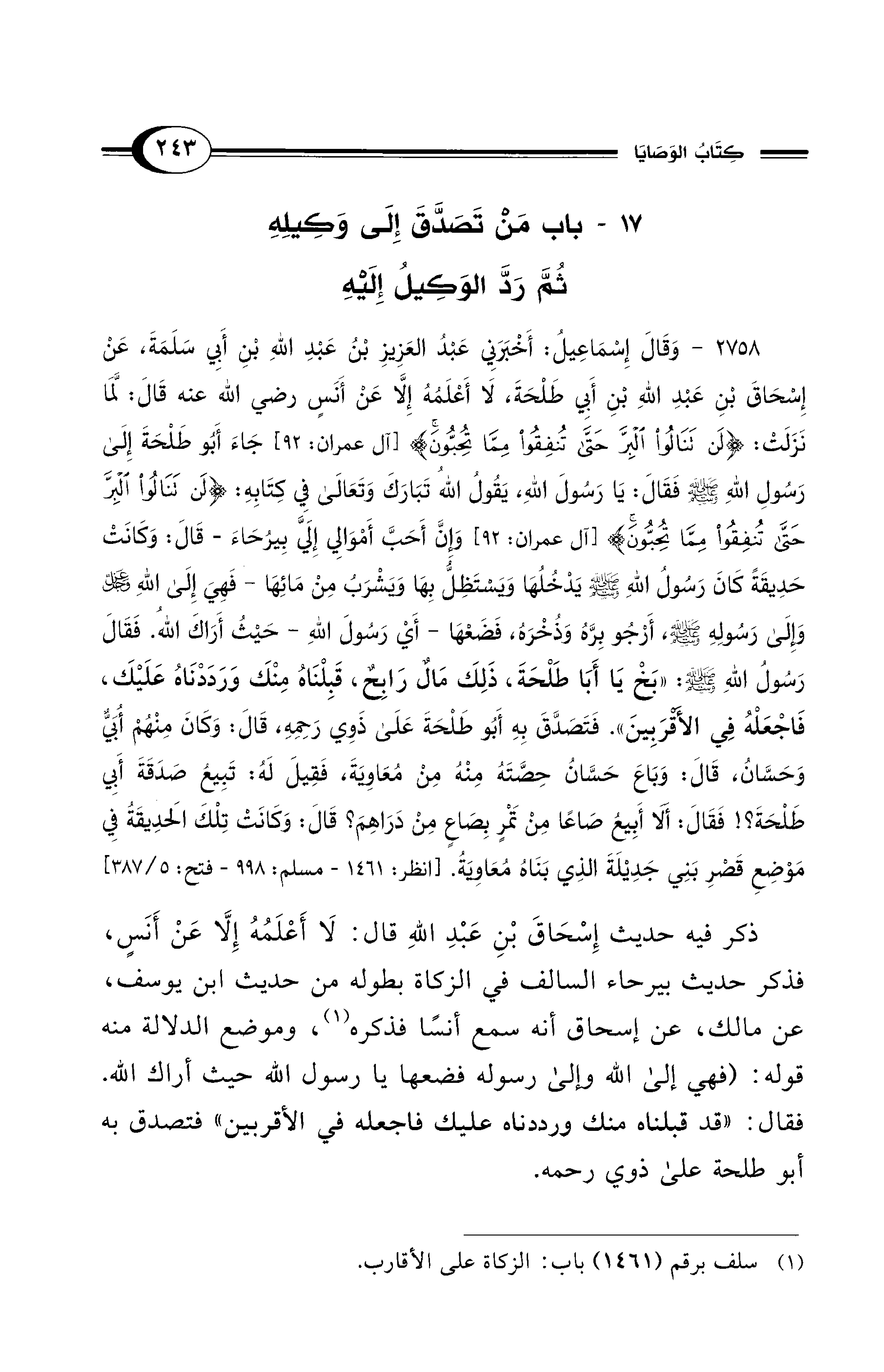 2758 - وَقَالَ إِسْمَاعِيلُ: أَخْبَرَنِي عَبْدُ العَزِيزِ بْنُ عَبْدِ اللهِ بْنِ أَبِي سَلَمَةَ، عَنْ إِسْحَاقَ بْنِ عَبْدِ اللهِ بْنِ أَبِي طَلْحَةَ، لَا أَعْلَمُهُ إِلَّا عَنْ أَنَسٍ رضي الله عنه قَالَ: لَمَّا نَزَلَتْ: {لَنْ تَنَالُوا البِرَّ حَتَّى تُنْفِقُوا مِمَّا تُحِبُّونَ} [آل عمران: 92] جَاءَ أَبُو طَلْحَةَ إِلَى رَسُولِ اللهِ - صلى الله عليه وسلم - فَقَالَ: يَا رَسُولَ اللهِ، يَقُولُ اللهُ تَبَارَكَ وَتَعَالَى فِي كِتَابِهِ: {لَنْ تَنَالُوا البِرَّ حَتَّى تُنْفِقُوا مِمَّا تُحِبُّونَ} [آل عمران: 92] وَإِنَّ أَحَبَّ أَمْوَالِي إِلَيَّ بِيرُحَاءَ -قَالَ: وَكَانَتْ حَدِيقَةً كَانَ رَسُولُ اللهِ - صلى الله عليه وسلم - يَدْخُلُهَا وَيَسْتَظِلُّ بِهَا وَيَشْرَبُ مِنْ مَائِهَا- فَهِيَ إِلَى اللهِ -عز وجل- وَإِلَى رَسُولِهِ - صلى الله عليه وسلم -، أَرْجُو بِرَّهُ وَذُخْرَهُ، فَضَعْهَا- أَيْ رَسُولَ اللهِ- حَيْثُ أَرَاكَ اللهُ. فَقَالَ رَسُولُ اللهِ - صلى الله عليه وسلم -: "بَخْ يَا أَبَا طَلْحَةَ، ذَلِكَ مَالٌ رَابِحٌ، قَبِلْنَاهُ مِنْكَ وَرَدَدْنَاهُ عَلَيْكَ، فَاجْعَلْهُ فِي الأَقْرَبِينَ". فَتَصَدَّقَ بِهِ أَبُو طَلْحَةَ عَلَى ذَوِي رَحِمِهِ، قَالَ: وَكَانَ مِنْهُمْ أُبَيٌّ وَحَسَّانُ، قَالَ: وَبَاعَ حَسَّانُ حِصَّتَهُ مِنْهُ مِنْ مُعَاوِيَةَ، فَقِيلَ لَهُ: تَبِيعُ صَدَقَةَ أَبِي طَلْحَةَ؟! فَقَالَ: أَلاَ أَبِيعُ صَاعًا مِنْ تَمْرٍ بِصَاعٍ مِنْ دَرَاهِمَ؟ قَالَ: وَكَانَتْ تِلْكَ الحَدِيقَةُ فِي مَوْضِعِ قَصْرِ بَنِي حُدَيْلَةَ الذِي بَنَاهُ مُعَاوِيَةُ. [انظر: 1461 - مسلم: 998 - فتح: 5/ 387]