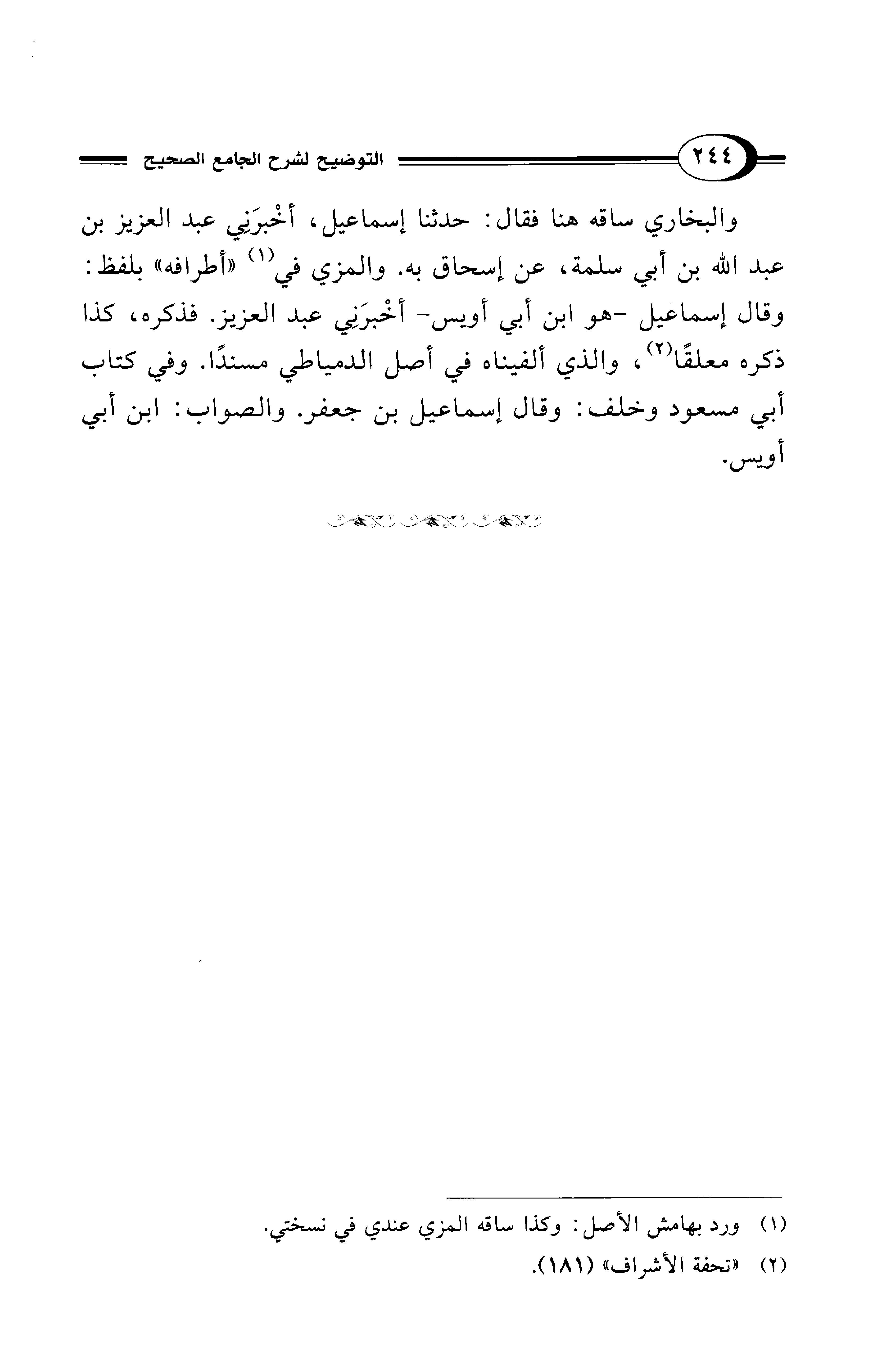 والبخاري ساقه هنا فقال: حدثنا إسماعيل، أخْبرَنِي عبد العزيز بن عبد الله بن أبي سلمة، عن إسحاق به. والمزي في (¬1) "أطرافه" بلفظ: وقال إسماعيل -هو ابن أبي أويس- أخْبرَنِي عبد العزيز. فذكره، كذا ذكره معلقًا (¬2)، والذي ألفيناه في أصل الدمياطي مسندًا. وفي كتاب أبي مسعود وخلف: وقال إسماعيل بن جعفر. والصواب: ابن أبي أويس.