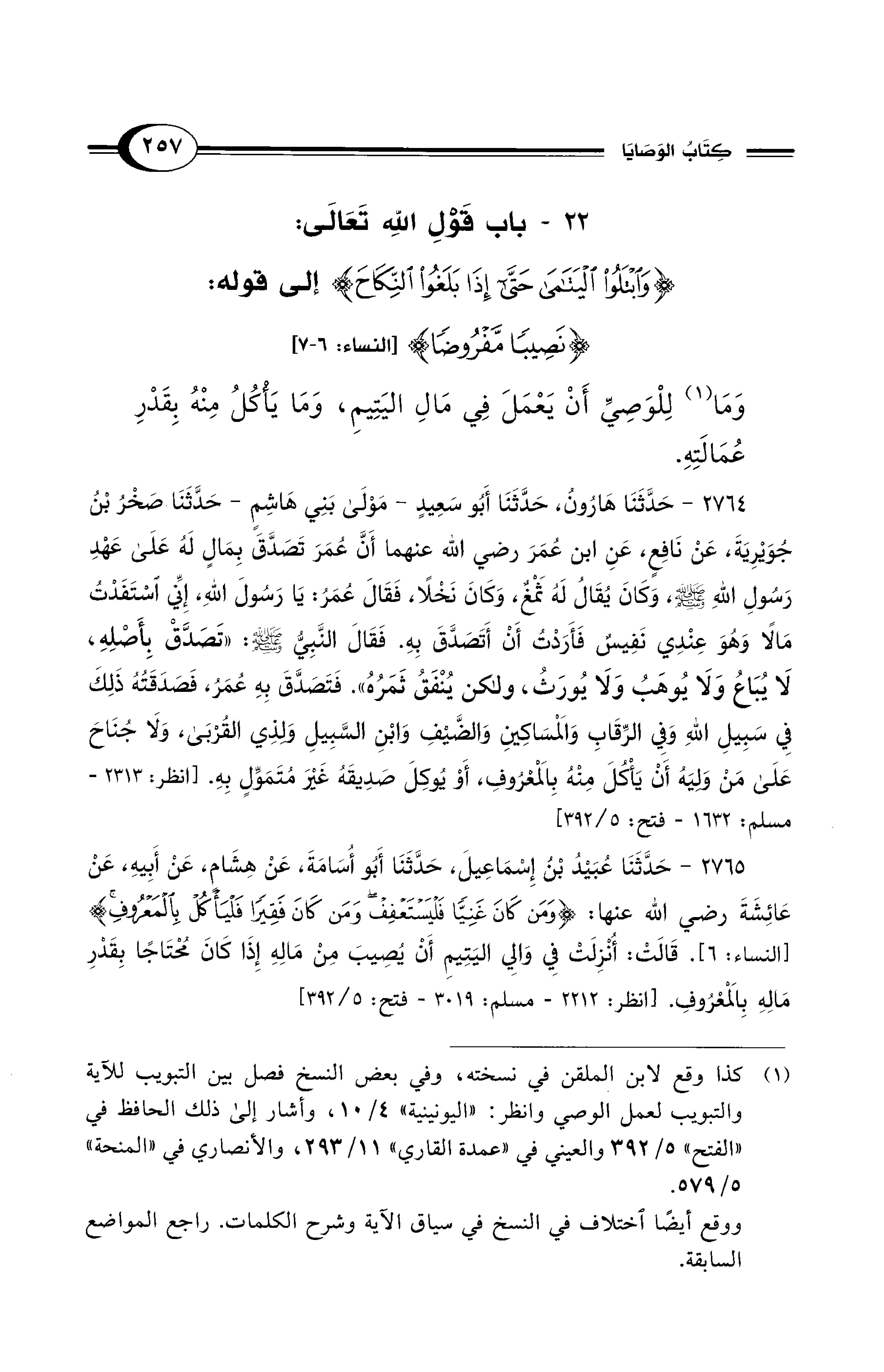 2765 - حَدَّثَنَا عُبَيْدُ بْنُ إِسْمَاعِيلَ، حَدَّثَنَا أَبُو أُسَامَةَ، عَنْ هِشَامٍ، عَنْ أَبِيهِ، عَنْ عَائِشَةَ رضي الله عنها: {وَمَنْ كَانَ غَنِيًّا فَلْيَسْتَعْفِفْ وَمَنْ كَانَ فَقِيرًا فَلْيَأْكُلْ بِالمَعْرُوفِ} [النساء: 6]. قَالَتْ: أُنْزِلَتْ فِي وَالِي اليَتِيمِ أَنْ يُصِيبَ مِنْ مَالِهِ إِذَا كَانَ مُحْتَاجًا بِقَدْرِ مَالِهِ بِالمَعْرُوفِ. [انظر: 2212 - مسلم: 3019 - فتح: 5/ 392]