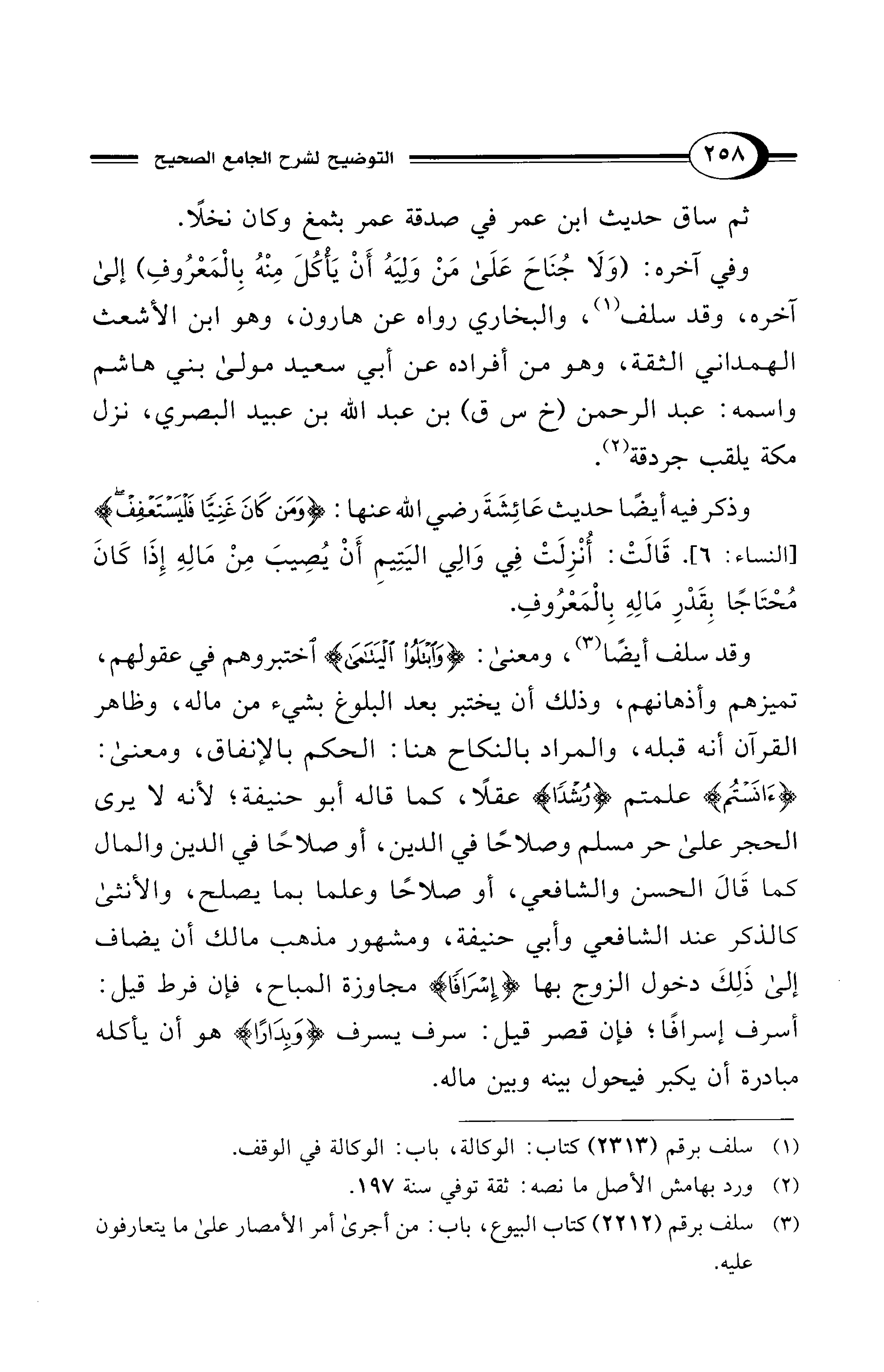 وذكر فيه أيضًا حديث عَائِشَةَ رضي الله عنها: {وَمَنْ كَانَ غَنِيًّا فَلْيَسْتَعْفِفْ} [النساء: 6]. قَالَتْ: أُنْزِلَتْ فِي وَالِي اليَتِيمِ أَنْ يُصِيبَ مِنْ مَالِهِ إِذَا كَانَ مُحْتَاجًا بِقَدْرِ مَالِهِ بِالمَعْرُوفِ.