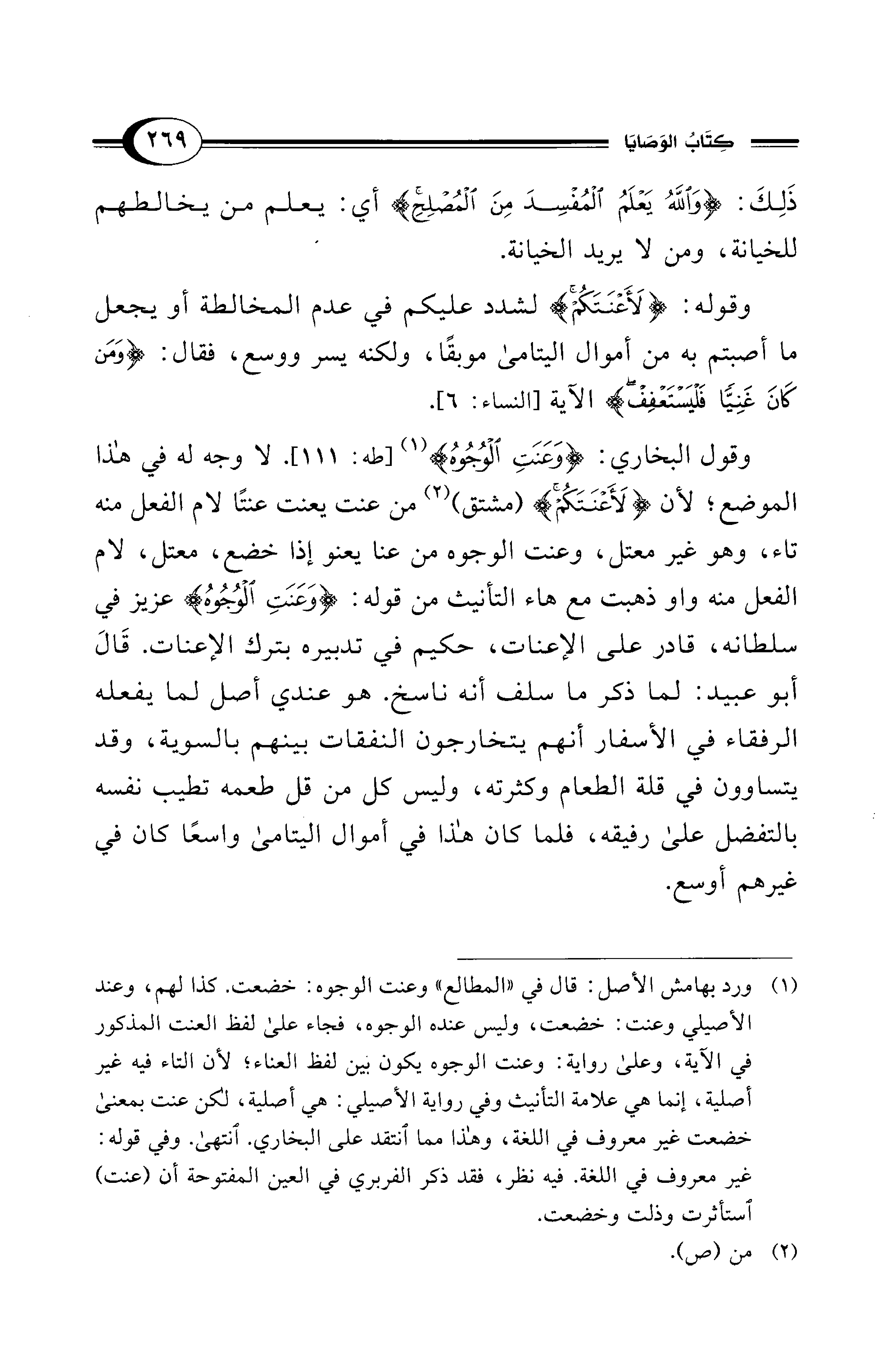 وقول البخاري: {وَعَنَتِ الوُجُوهُ} (¬1) [طه: 111]. لا وجه له في هذا الموضع؛ لأن {لَأَعْنَتَكُمْ} (مشتق) (¬2) من عنت يعنت عنتًا لام الفعل منه تاء، وهو غير معتل، وعنت الوجوه من عنا يعنو إذا خضع، معتل، لام الفعل منه واو ذهبت مع هاء التأنيث من قوله: {وَعَنَتِ الوُجُوهُ} عزيز في سلطانه، قادر على الإعنات، حكيم في تدبيره بترك الإعنات. قَالَ أبو عبيد: لما ذكر ما سلف أنه ناسخ. هو عندي أصل لما يفعله الرفقاء في الأسفار أنهم يتخارجون النفقات بينهم بالسوية، وقد يتساوون في قلة الطعام وكثرته، وليس كل من قل طعمه تطيب نفسه بالتفضل على رفيقه، فلما كان هذا في أموال اليتامى واسعًا كان في غيرهم أوسع.