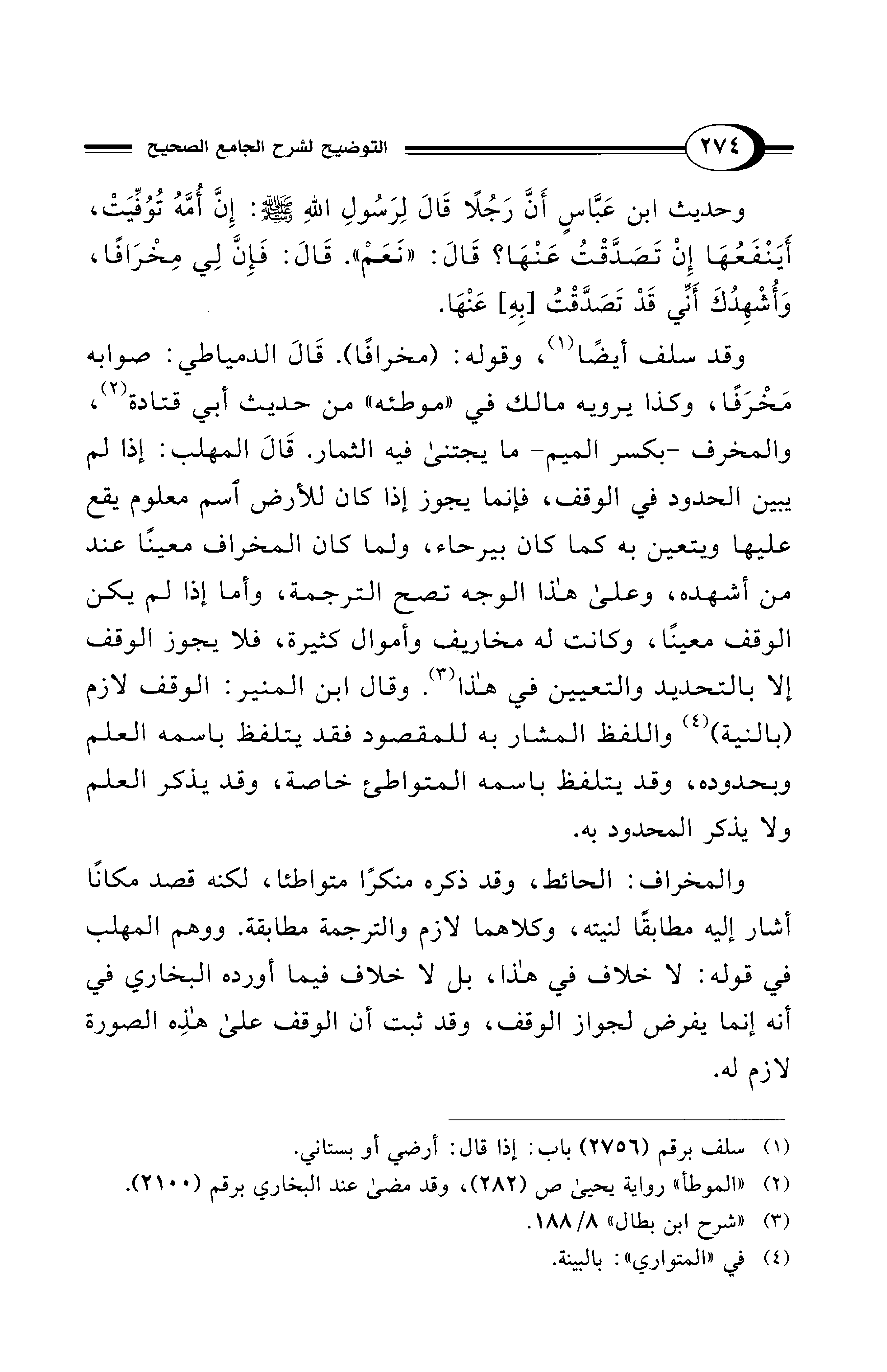 وقد سلف أيضًا (¬1)، وقوله: (مخرافًا). قَالَ الدمياطي: صوابه مَخْرَفًا، وكذا يرويه مالك في "موطئه" من حديث أبي قتادة (¬2)، والمخرف -بكسر الميم- ما يجتنى فيه الثمار. قَالَ المهلب: إذا لم يبين الحدود في الوقف، فإنما يجوز إذا كان للأرض اسم معلوم يقع عليها ويتعين به كما كان بيرحاء، ولما كان المخراف معينًا عند من أشهده، وعلى هذا الوجه تصح الترجمة، وأما إذا لم يكن الوقف معينًا، وكانت له مخاريف وأموال كثيرة، فلا يجوز الوقف إلا بالتحديد والتعيين في هذا (¬3). وقال ابن المنير: الوقف لازم (بالنية) (¬4) واللفظ المشار به للمقصود فقد يتلفظ باسمه العلم وبحدوده، وقد يتلفظ باسمه المتواطئ خاصة، وقد يذكر العلم ولا يذكر المحدود به.