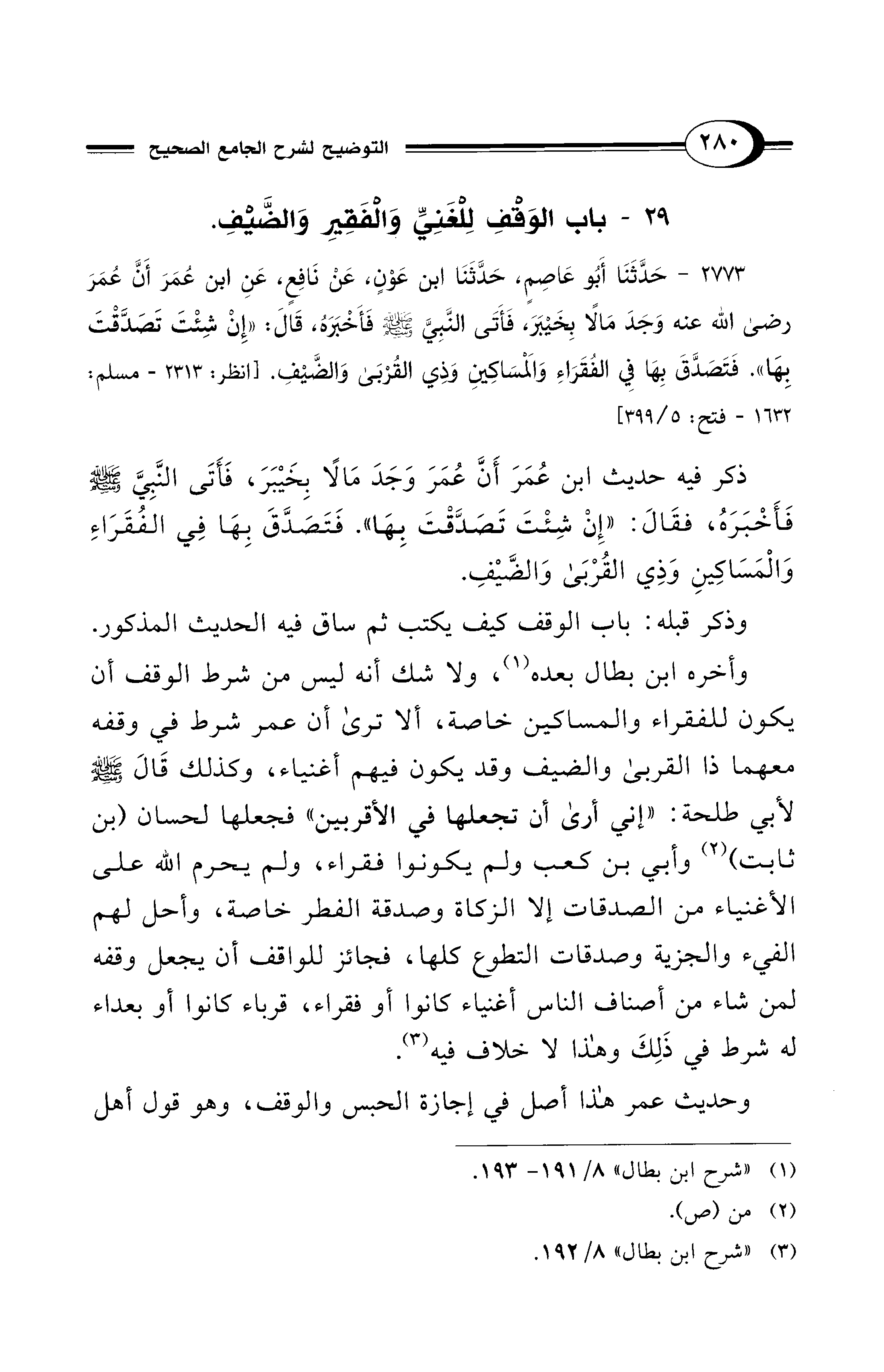 وذكر قبله: باب الوقف كيف يكتب ثم ساق فيه الحديث المذكور. وأخره ابن بطال بعده (¬1)، ولا شك أنه ليس من شرط الوقف أن يكون للفقراء والمساكين خاصة، ألا ترى أن عمر شرط في وقفه معهما ذا القربى والضيف وقد يكون فيهم أغنياء، وكذلك قَالَ - صلى الله عليه وسلم - لأبي طلحة: "إني أرى أن تجعلها في الأقربين" فجعلها لحسان (بن ثابت) (¬2) وأبي بن كعب ولم يكونوا فقراء، ولم يحرم الله على الأغنياء من الصدقات إلا الزكاة وصدقة الفطر خاصة، وأحل لهم الفيء والجزية وصدقات التطوع كلها، فجائز للواقف أن يجعل وقفه لمن شاء من أصناف الناس أغنياء كانوا أو فقراء، قرباء كانوا أو بعداء له شرط في ذَلِكَ وهذا لا خلاف فيه (¬3).