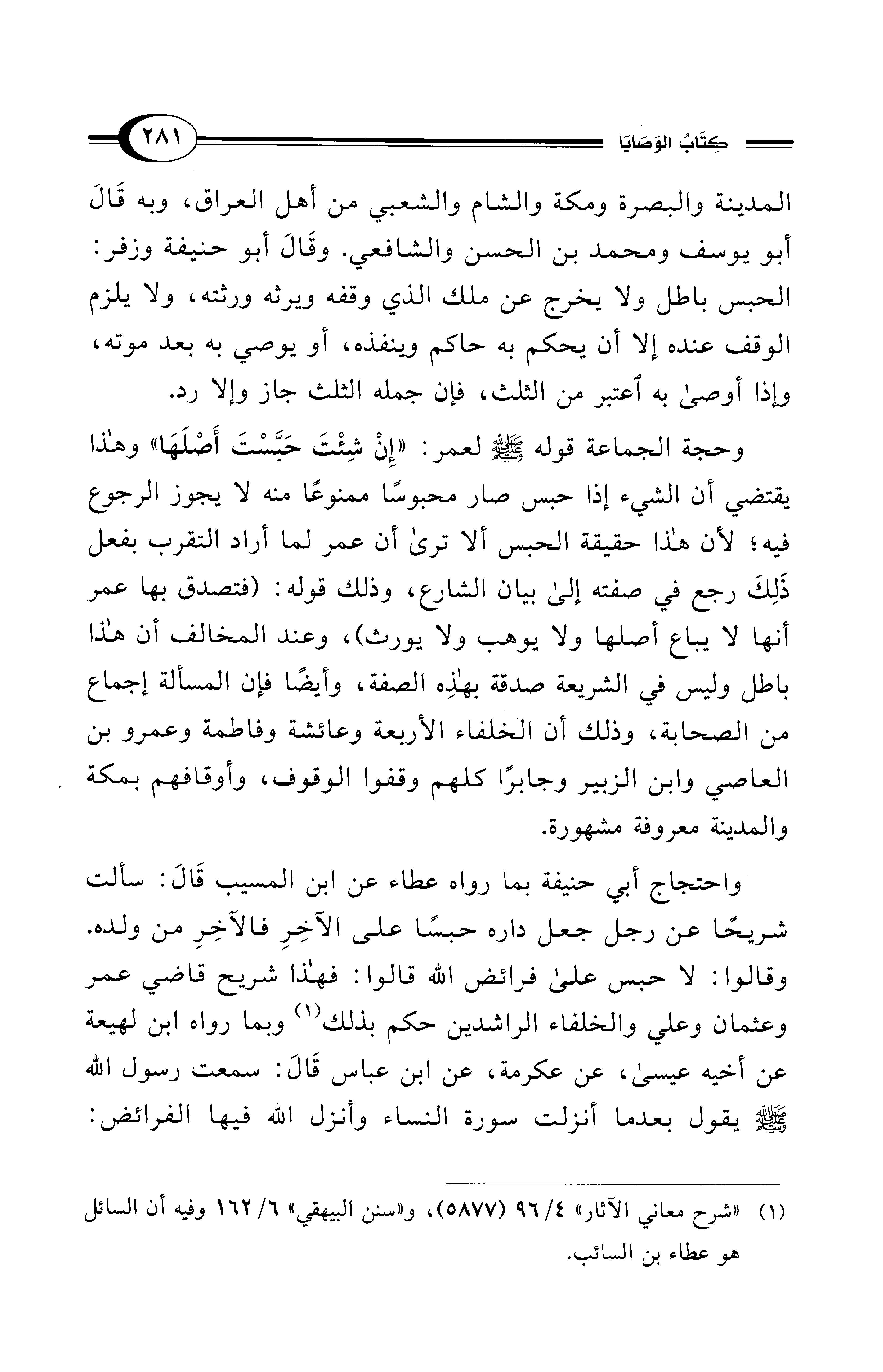 المدينة والبصرة ومكة والشام والشعبي من أهل العراق، وبه قَالَ أبو يوسف ومحمد بن الحسن والشافعي. وقَالَ أبو حنيفة وزفر: الحبس باطل ولا يخرج عن ملك الذي وقفه ويرثه ورثته، ولا يلزم الوقف عنده إلا أن يحكم به حاكم وينفذه، أو يوصي به بعد موته، وإذا أوصى به اعتبر من الثلث، فإن جمله الثلث جاز وإلا رد.