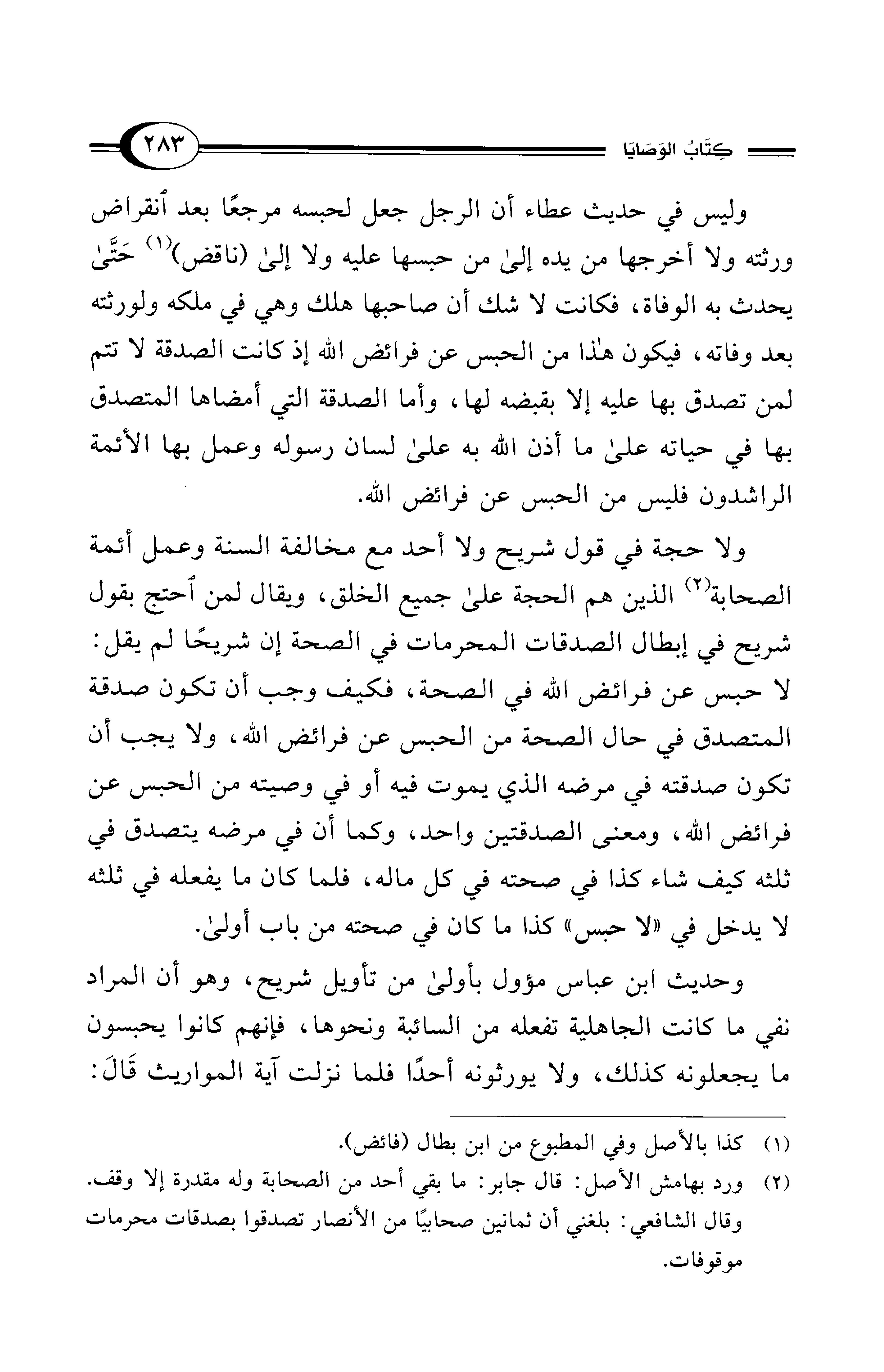 وليس في حديث عطاء أن الرجل جعل لحبسه مرجعًا بعد انقراض ورثته ولا أخرجها من يده إلى من حبسها عليه ولا إلى (ناقض) (¬1) حَتَّى يحدث به الوفاة، فكانت لا شك أن صاحبها هلك وهي في ملكه ولورثته بعد وفاته، فيكون هذا من الحبس عن فرائض الله إذ كانت الصدقة لا تتم لمن تصدق بها عليه إلا بقبضه لها، وأما الصدقة التي أمضاها المتصدق بها في حياته على ما أذن الله به على لسان رسوله وعمل بها الأئمة الراشدون فليس من الحبس عن فرائض الله.