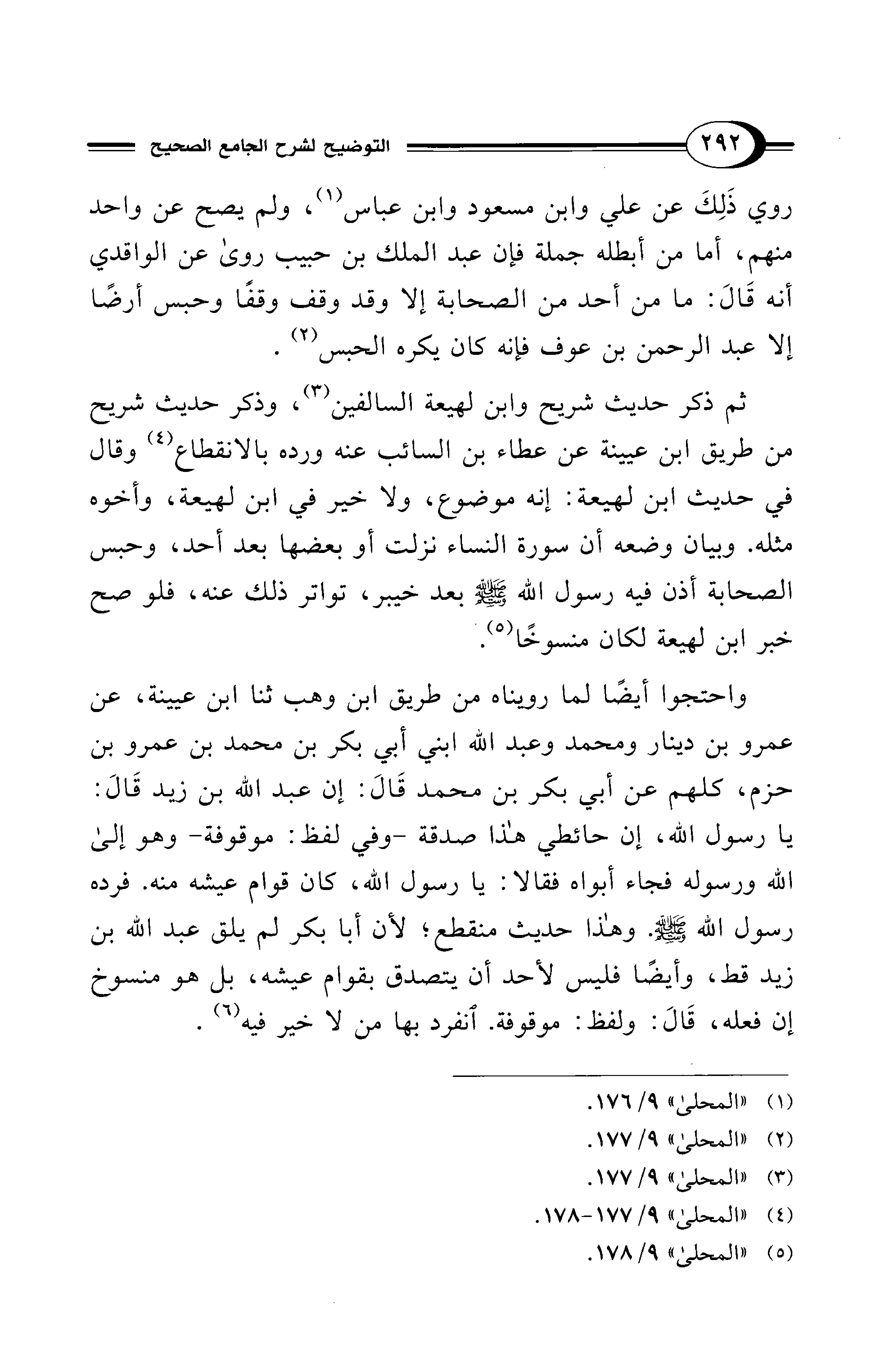ثم ذكر حديث شريح وابن لهيعة السالفين (¬3)، وذكر حديث شريح من طريق ابن عيينة عن عطاء بن السائب عنه ورده بالانقطاع (¬4) وقال في حديث ابن لهيعة: إنه موضوع، ولا خير في ابن لهيعة، وأخوه مثله. وبيان وضعه أن سورة النساء نزلت أو بعضها بعد أحد، وحبس الصحابة أذن فيه رسول الله - صلى الله عليه وسلم - بعد خيبر، تواتر ذلك عنه، فلو صح خبر ابن لهيعة لكان منسوخًا (¬5).