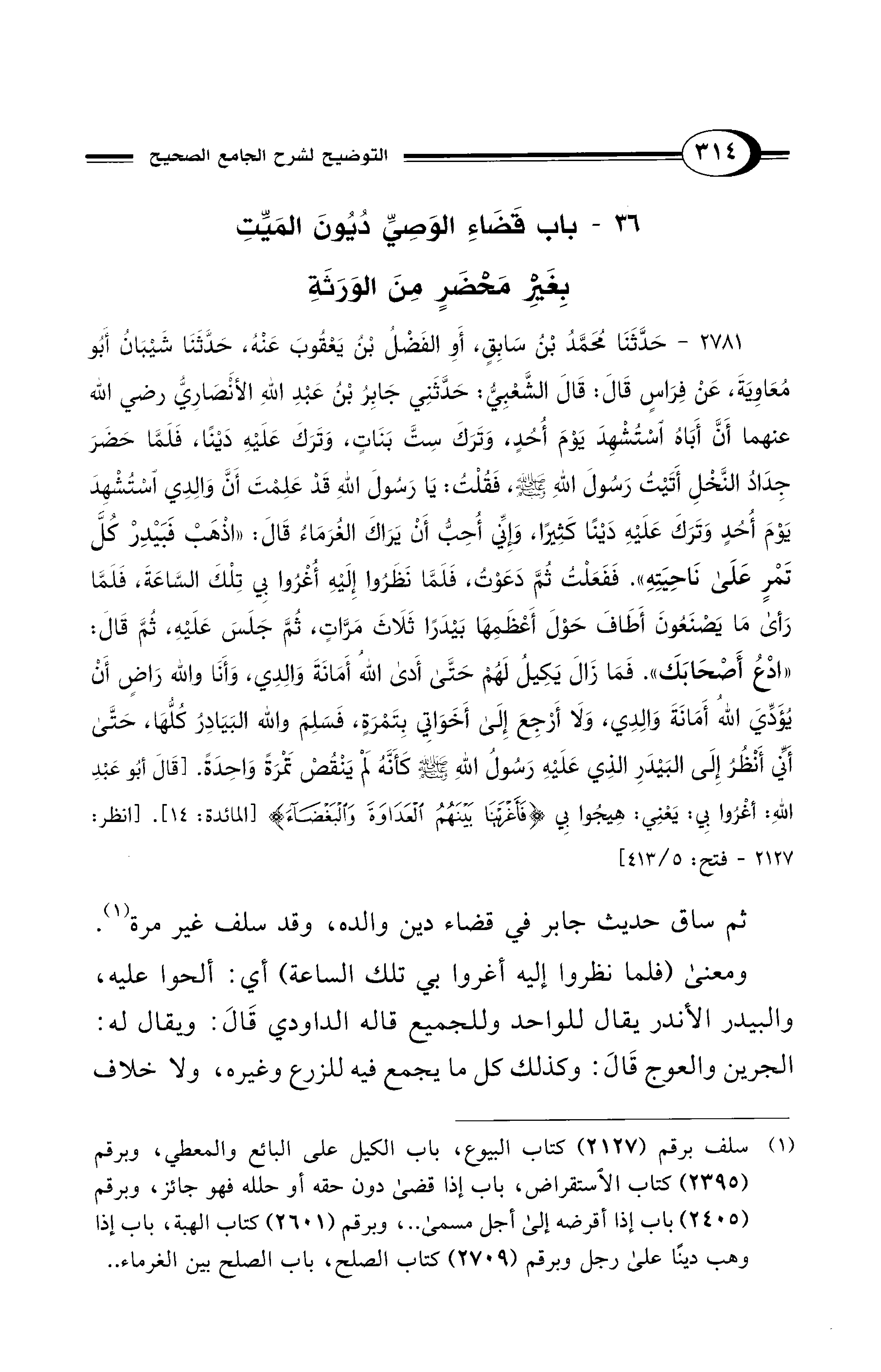 (¬1) سلف برقم (2127) كتاب البيوع، باب الكيل على البائع والمعطي، وبرقم (2395) كتاب الاستقراض، باب إذا قضى دون حقه أو حلله فهو جائز، وبرقم (2405) باب إذا أقرضه إلى أجل مسمى .. ، وبرقم (2601) كتاب الهبة، باب إذا وهب دينًا على رجل وبرقم (2709) كتاب الصلح، باب الصلح بين الغرماء ..