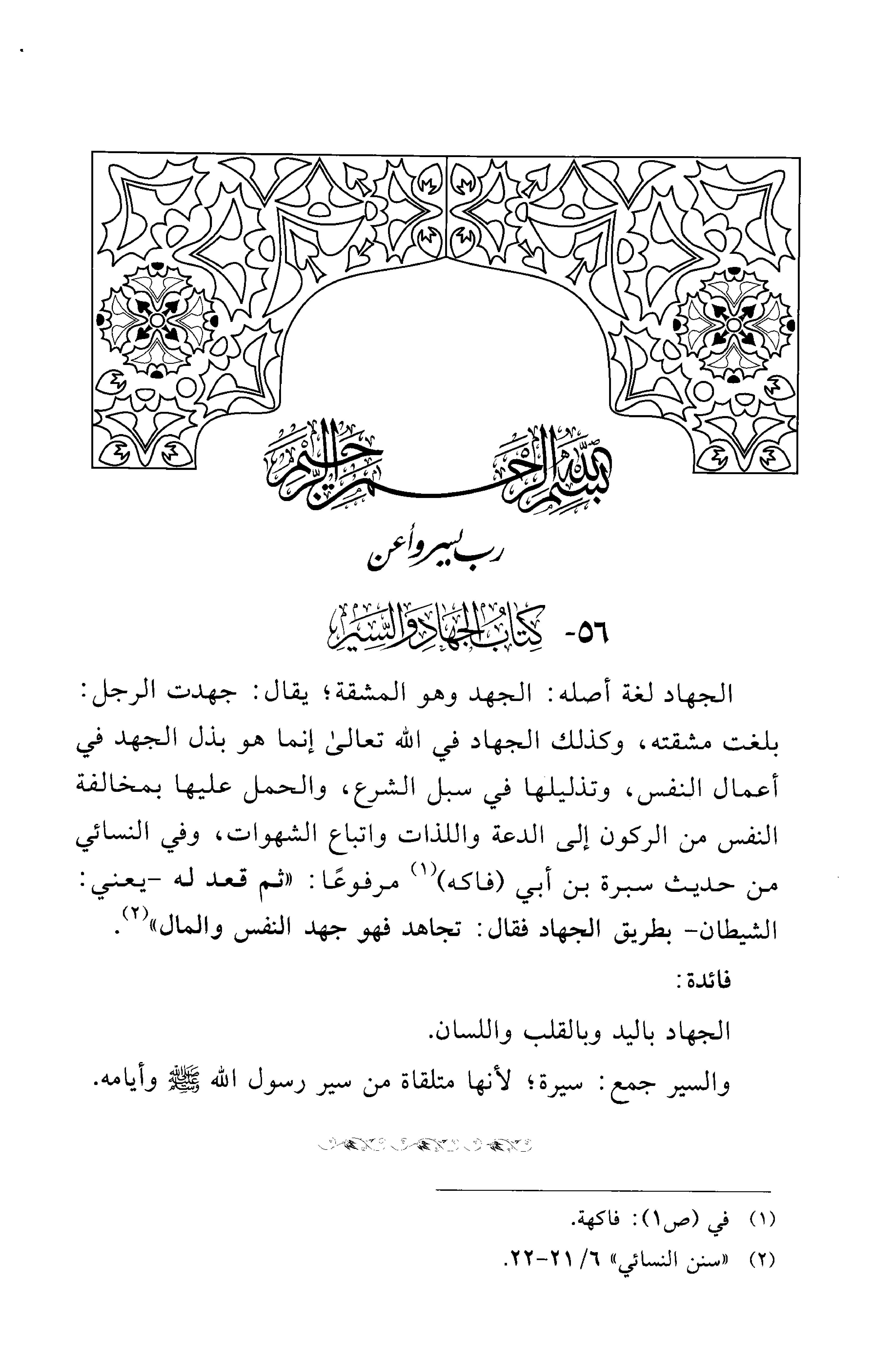 الجهاد لغة أصله: الجهد وهو المشقة؛ يقال: جهدت الرجل: بلغت مشقته، وكذلك الجهاد في الله تعالى إنما هو بذل الجهد في أعمال النفس، وتذليلها في سبل الشرع، والحمل عليها بمخالفة النفس من الركون إلى الدعة واللذات واتباع الشهوات، وفي النسائي من حديث سبرة بن أبي (فاكه) (¬1) مرفوعًا: "تم قعد له -يعني: الشيطان- بطريق الجهاد فقال: تجاهد فهو جهد النفس والمال" (¬2).